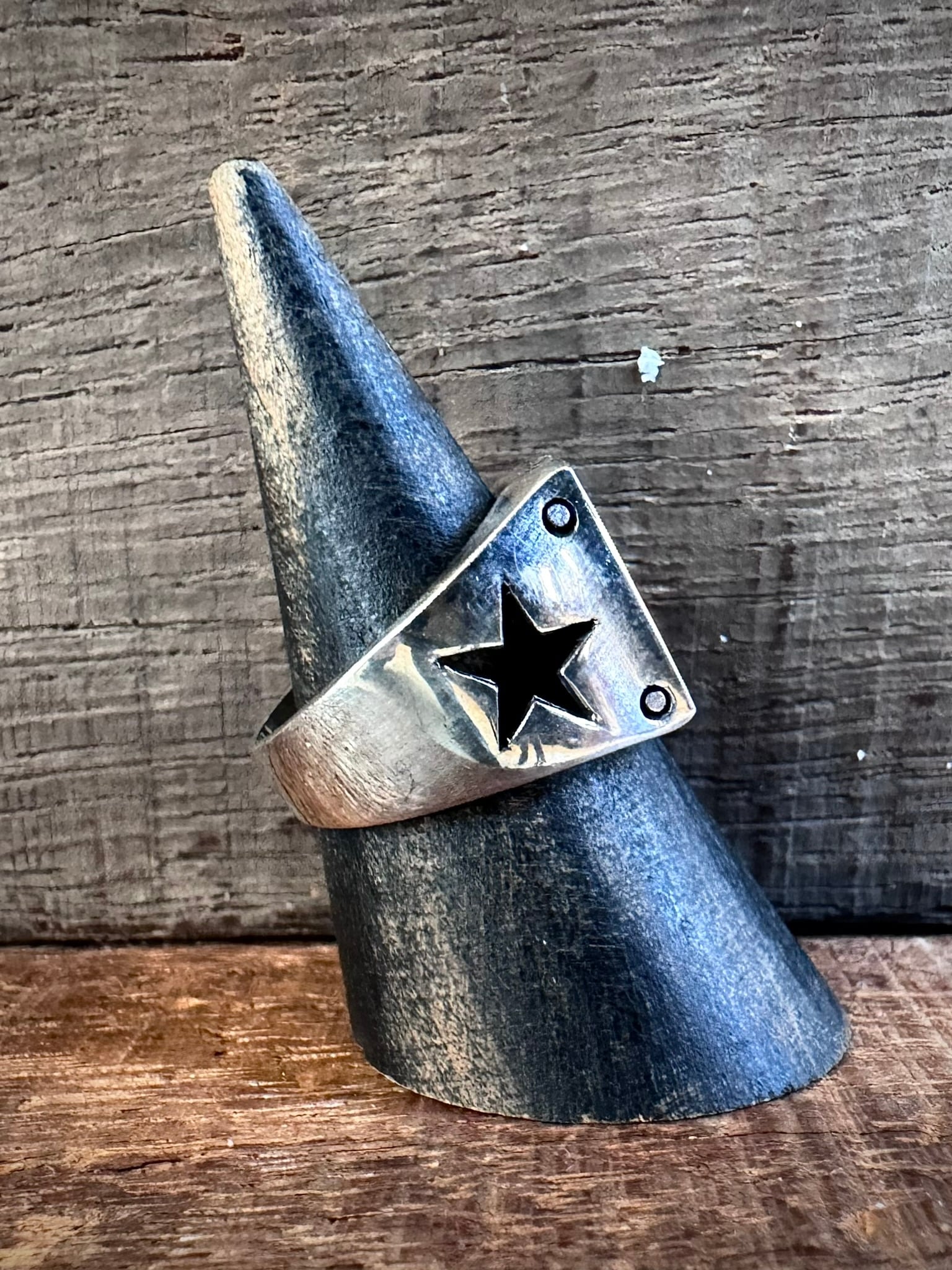 サーカス文字のような13がボックスに刻印されたようなリング。