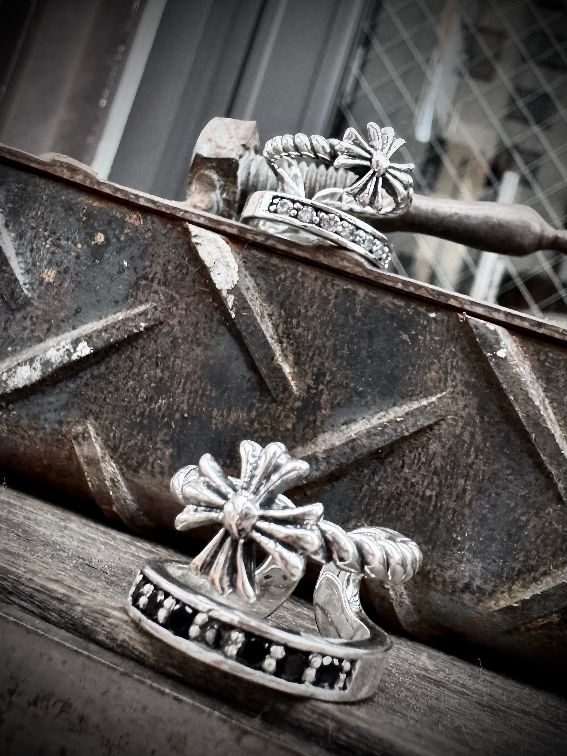 光輝くジルコニアが目を引く王道ゴシッククロスモチーフのツインリング。