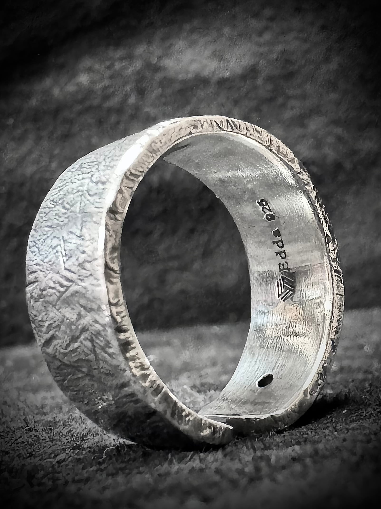 アンティーク加工を施したシルバーリングに、目を惹くターコイズが埋め込まれたデザイン。