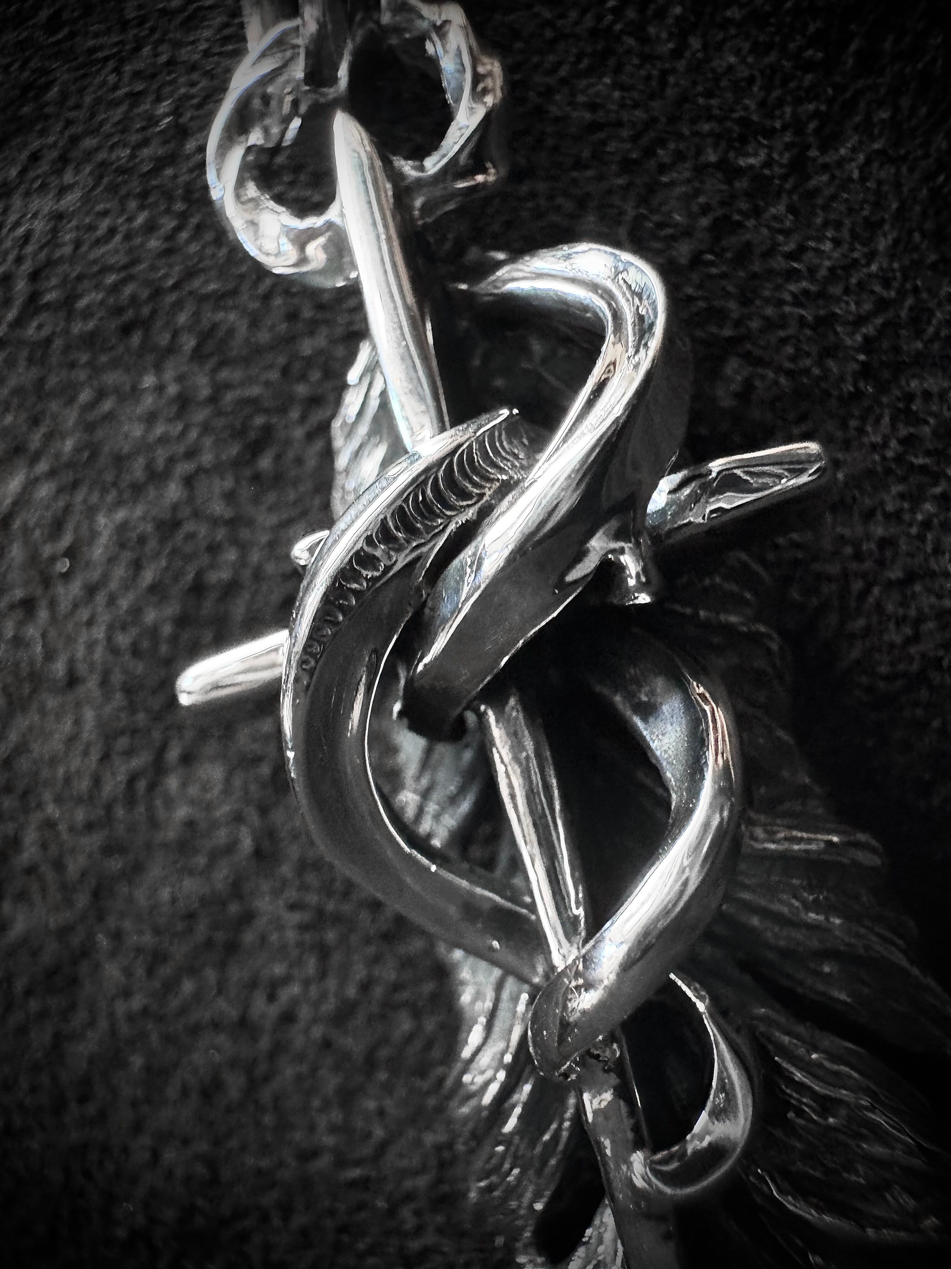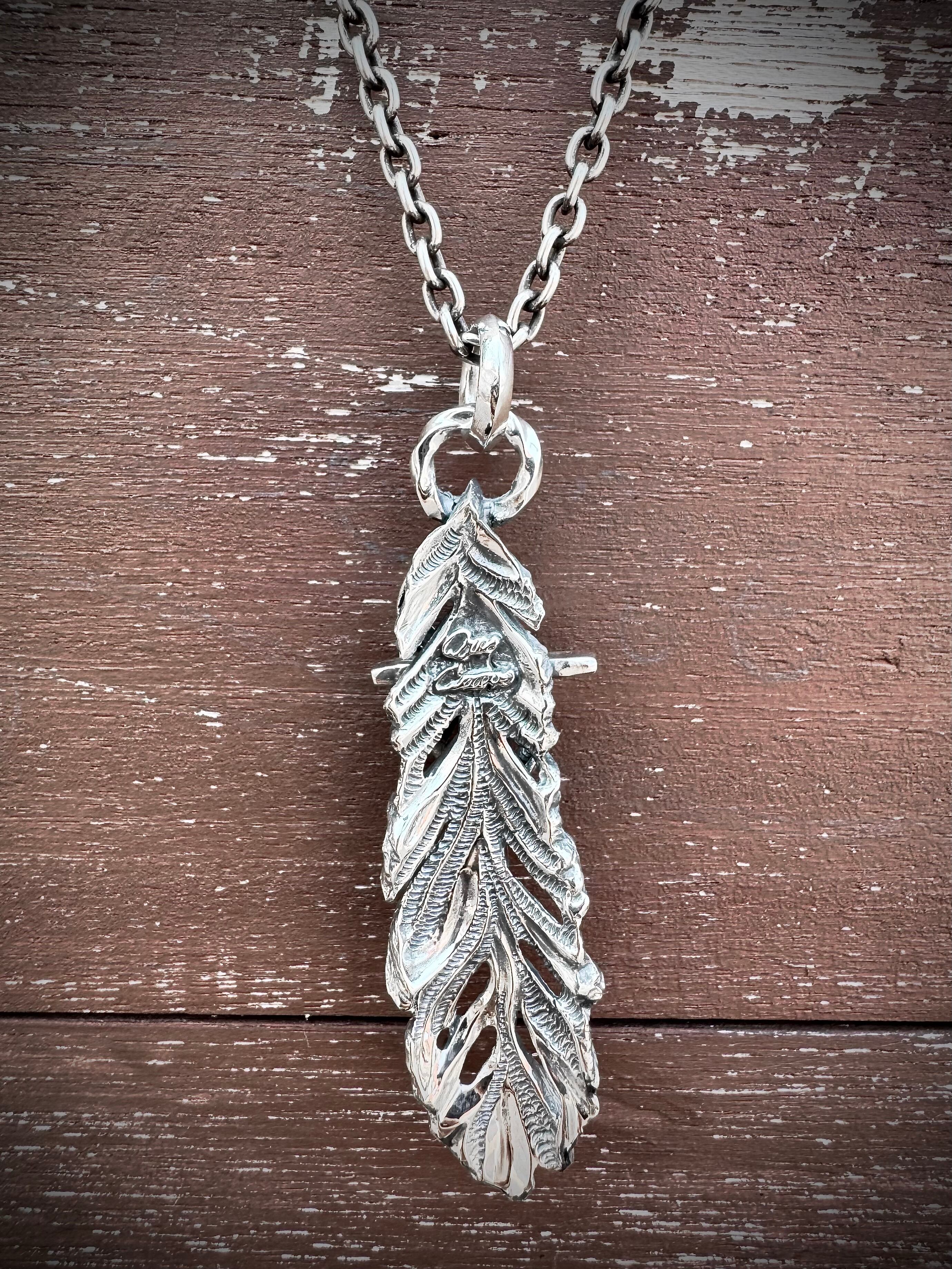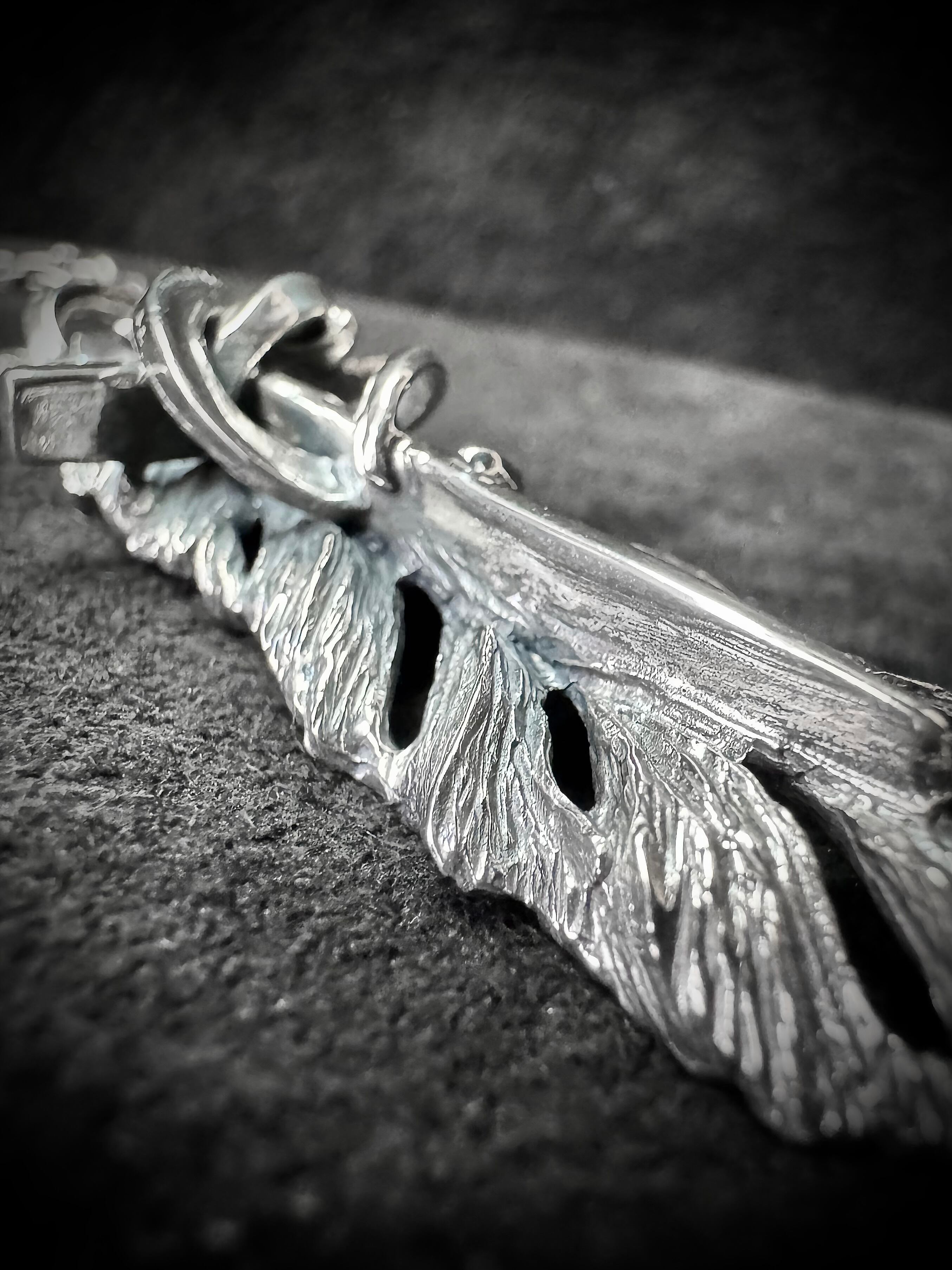 荒削りのように彫って造形し、ナチュラルな凹凸感を演出したフェザーにクロスと螺旋モチーフを組み合わせたペンダント。