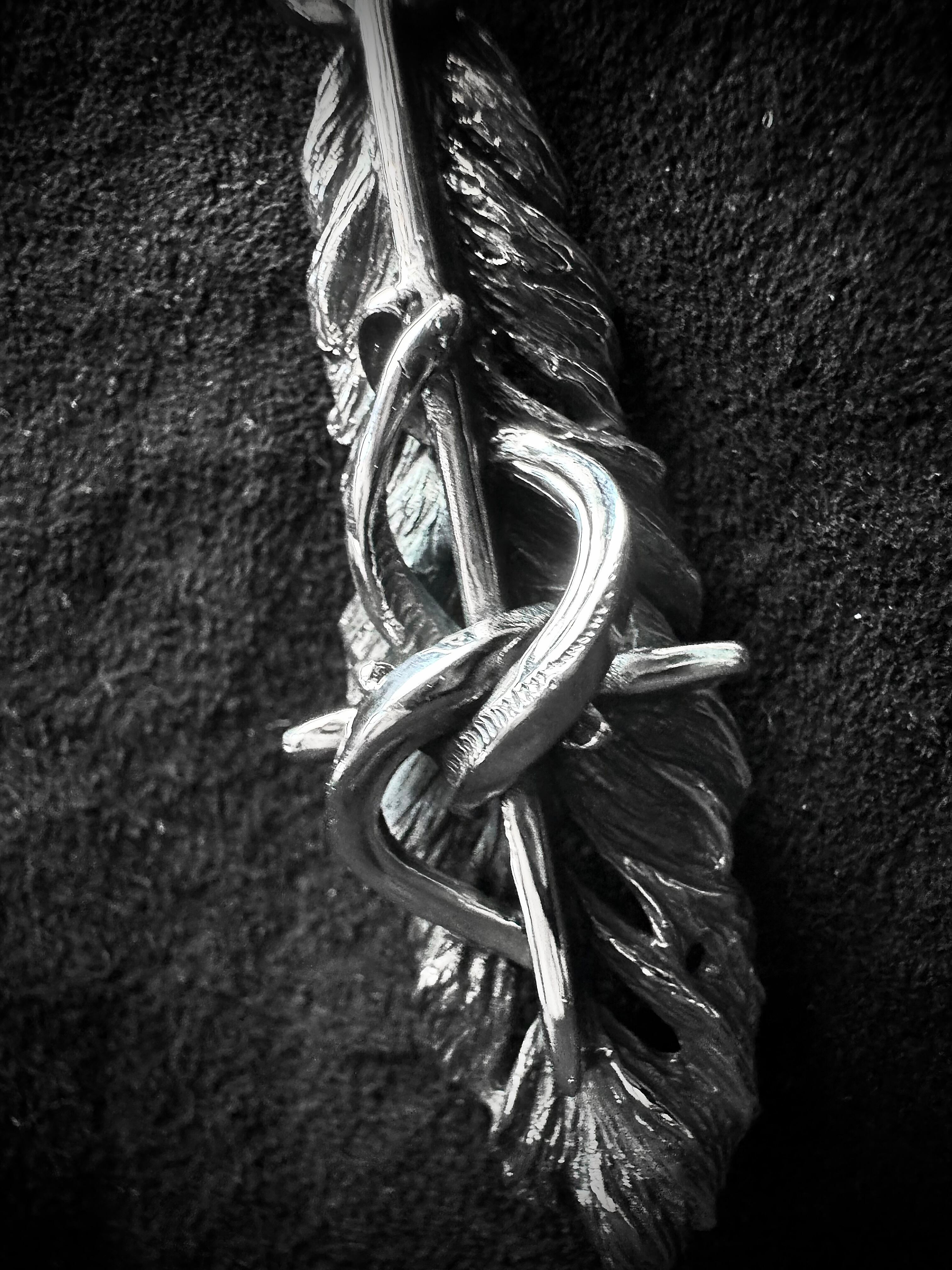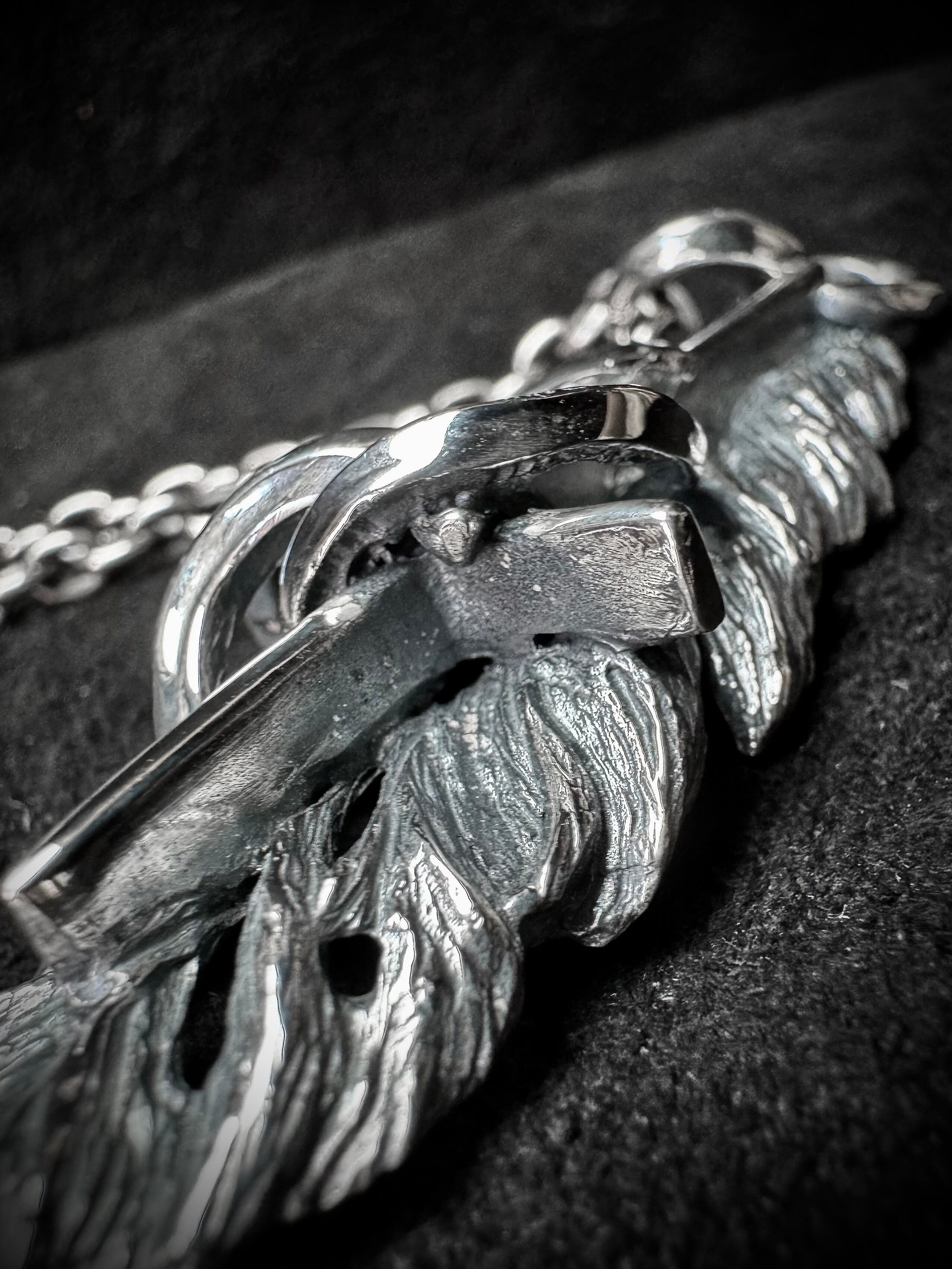 荒削りのように彫って造形し、ナチュラルな凹凸感を演出したフェザーにクロスと螺旋モチーフを組み合わせたペンダント。