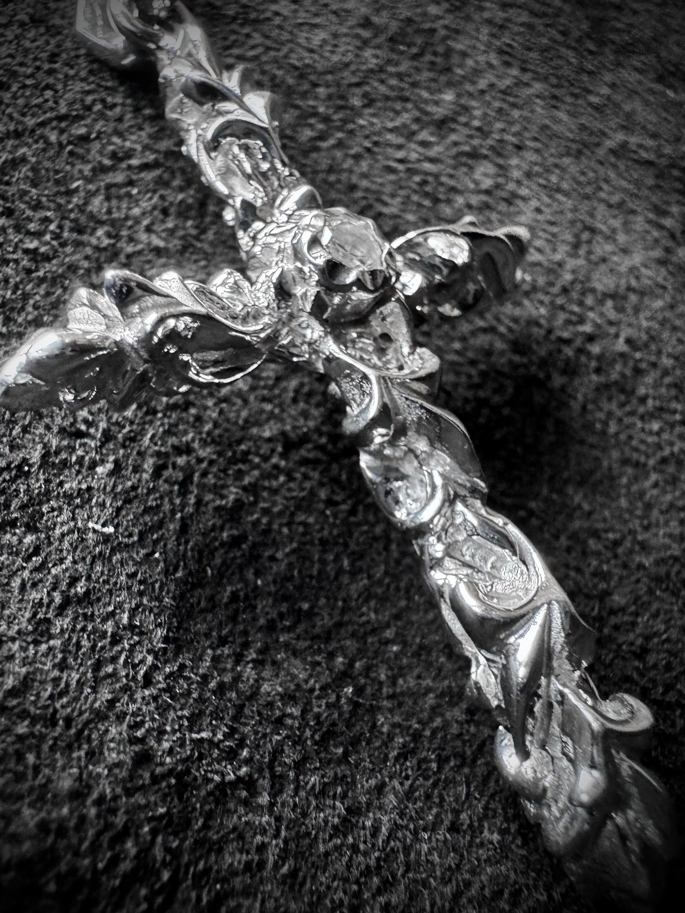 少し肉厚なクロスに荒々しく削り唸るような唐草模様が特徴的なペンダント。