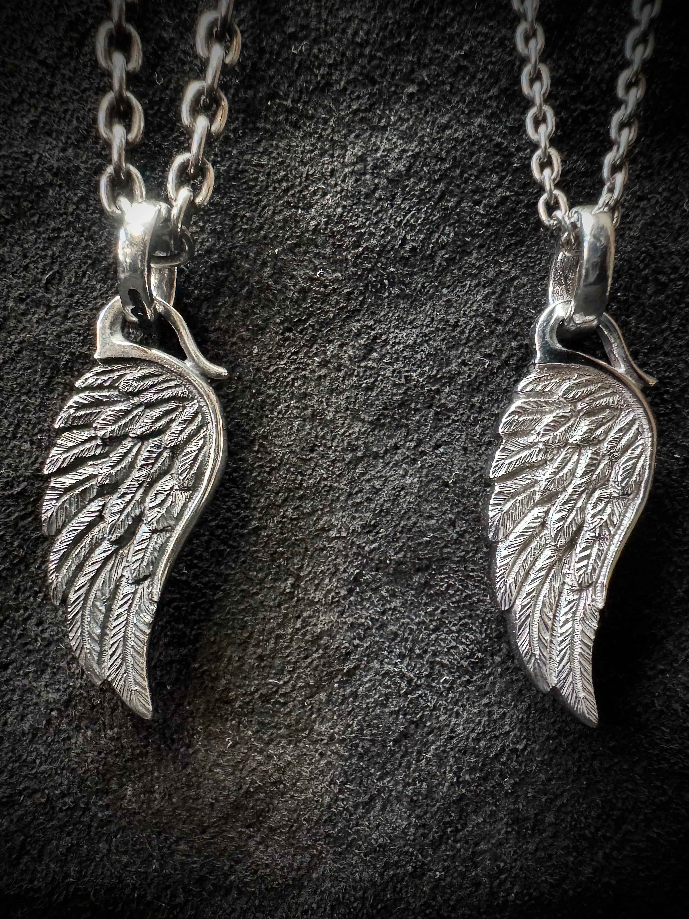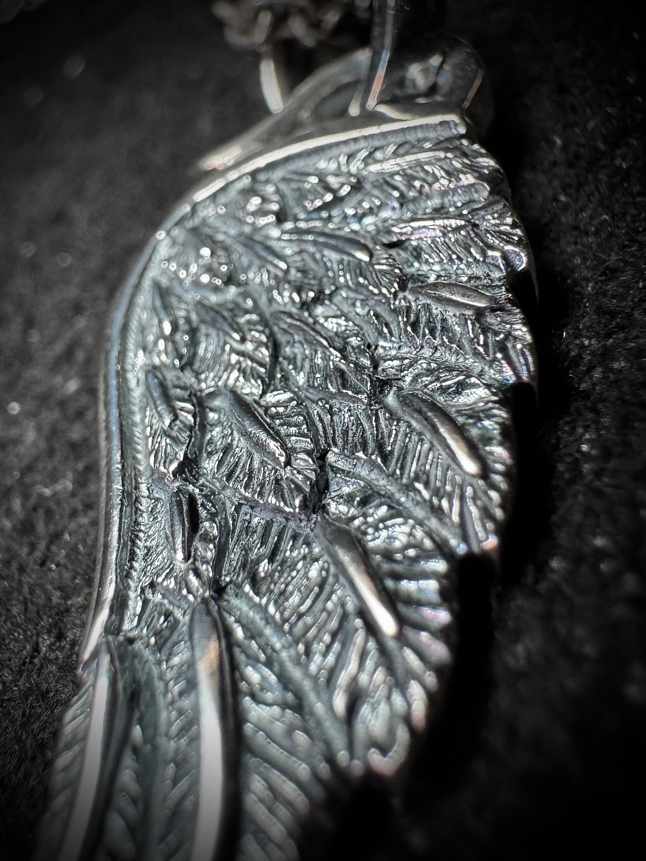 荒々しく削りだされ立体的なデザインが特徴的な翼のペンダント。