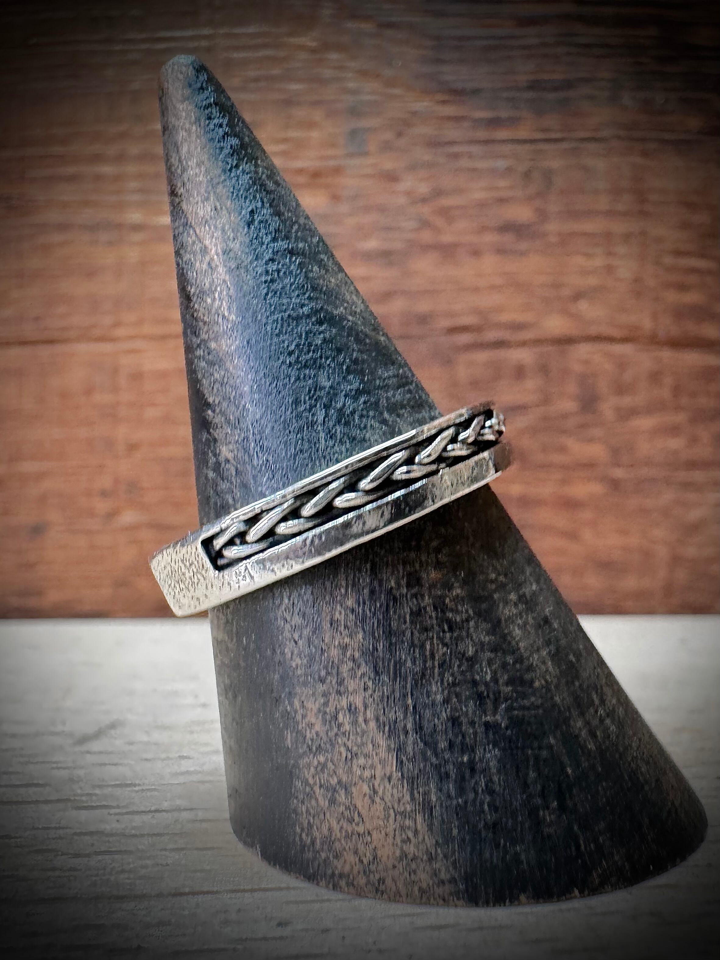立体的に編み込まれたチェーンが作り出す陰影と使い込まれたアンティークのような風合いを醸し出すテクスチャーの異なる質感が一つに溶け合うデザインリング。