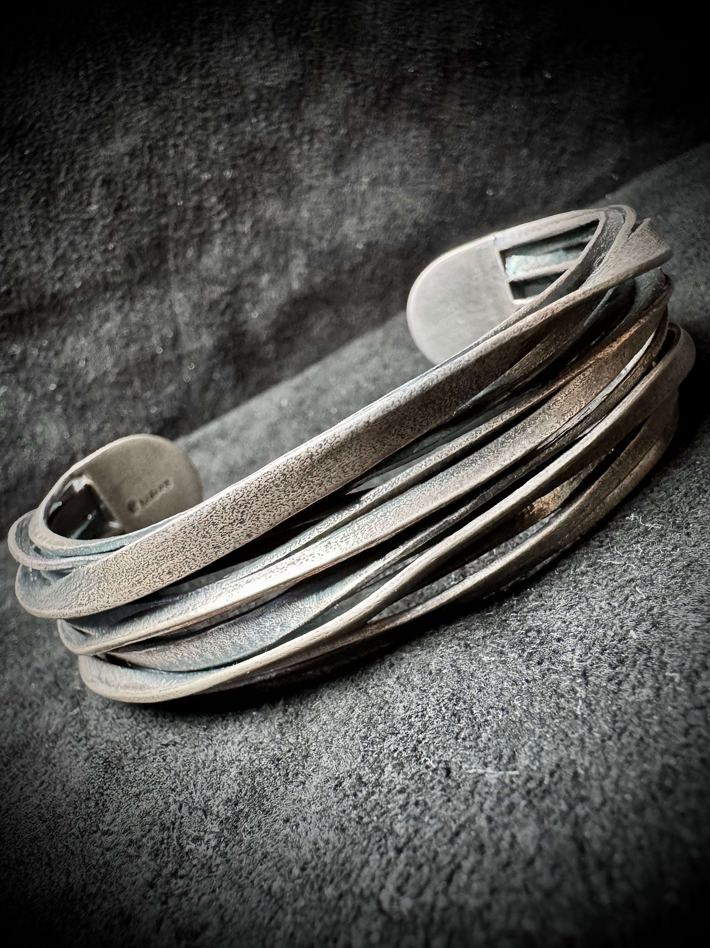 レザーを何重にも巻き付けたブレスレスレットをイメージしEddaの技術力でシルバーに落とし込んだ至高のバングル。