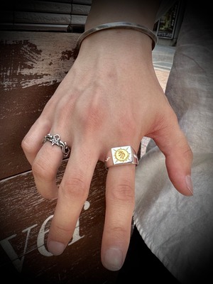 シグネットリングのシェイプにココペリ、サイドに稲妻模様がデザインされたリング。