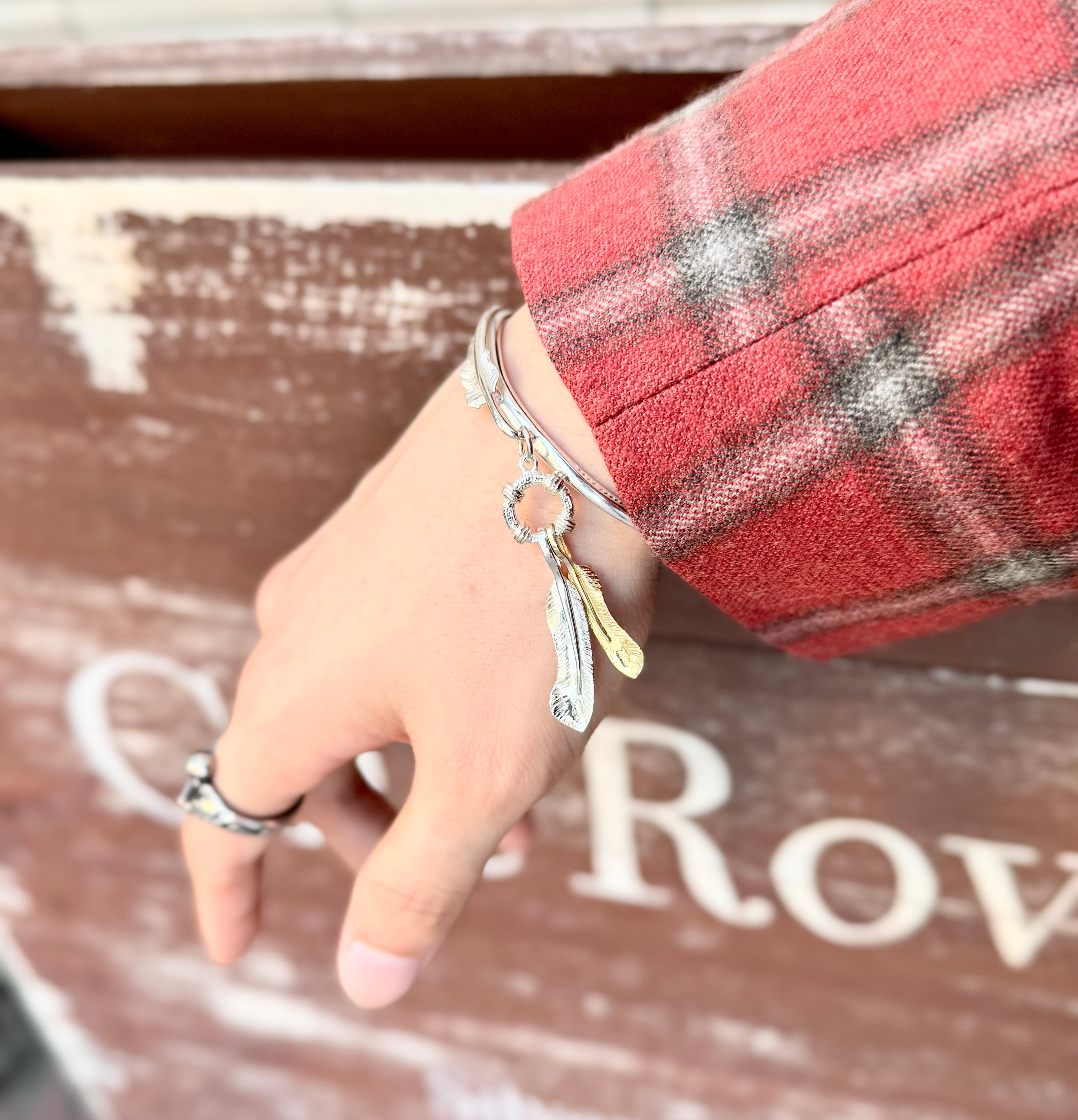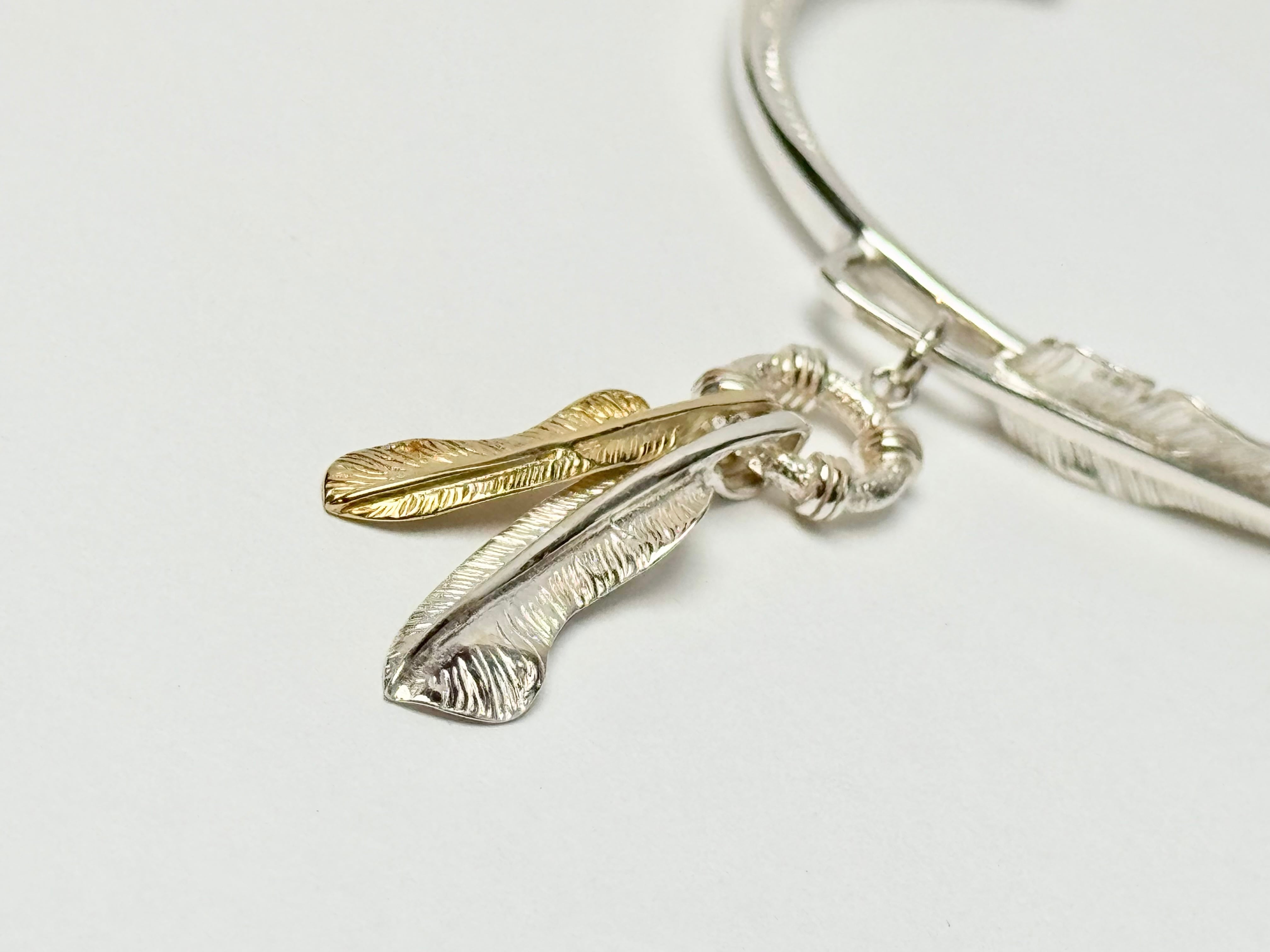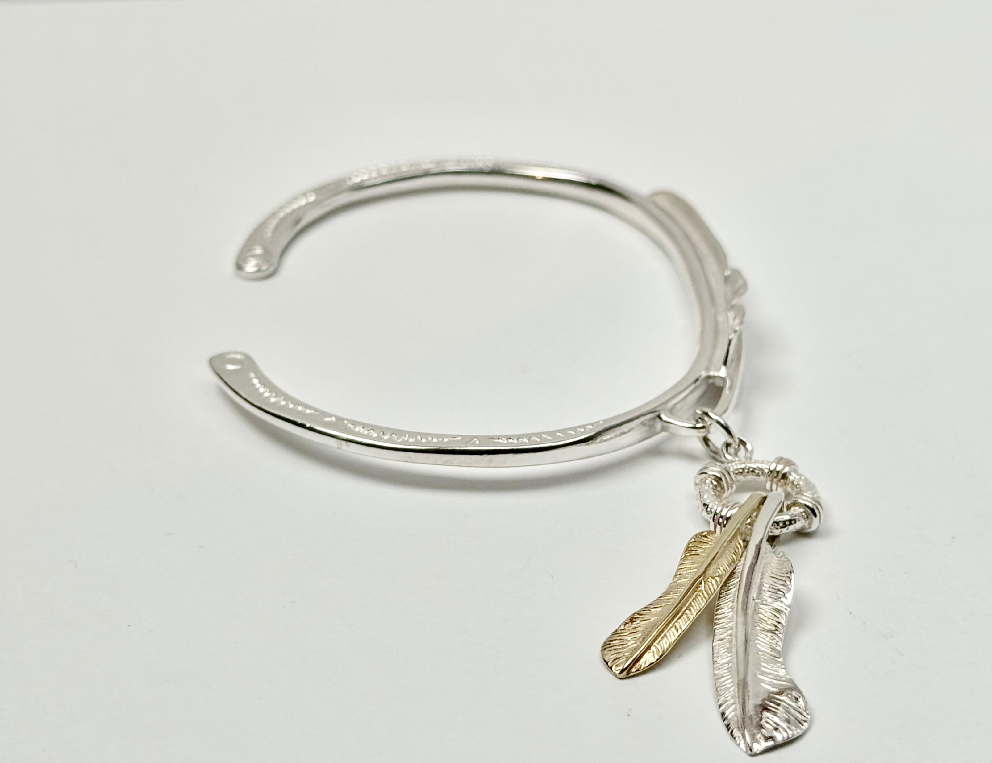 揺れる金銀2枚のフェザーのチャームが特徴的なバングル。