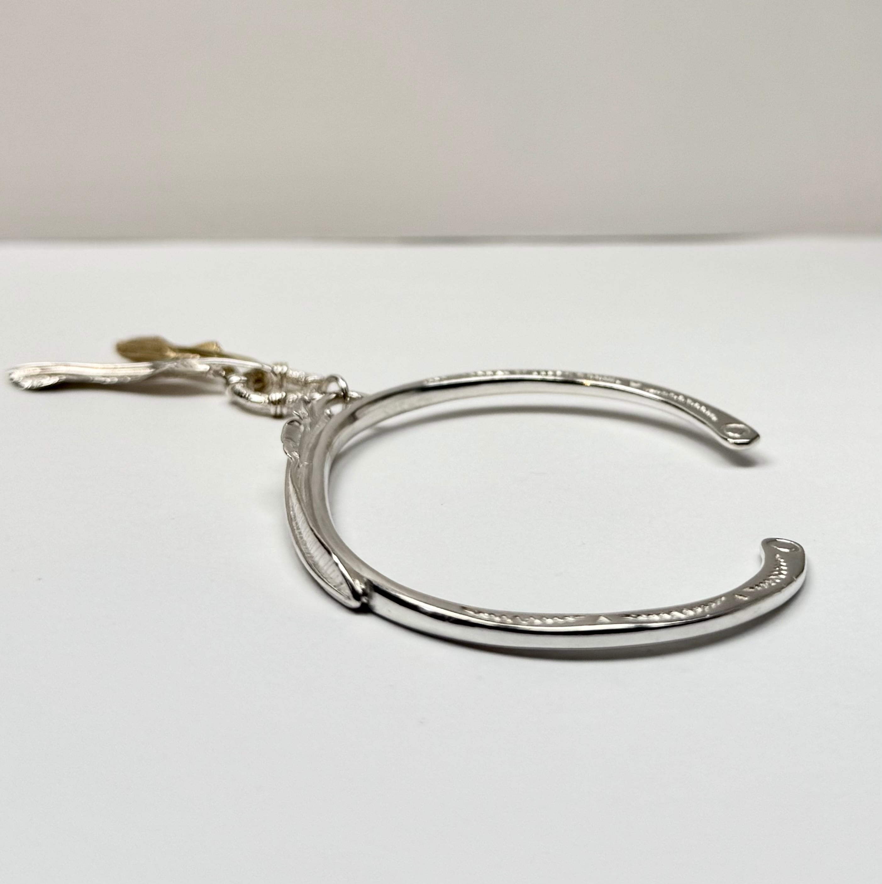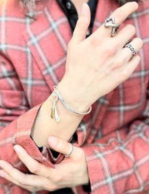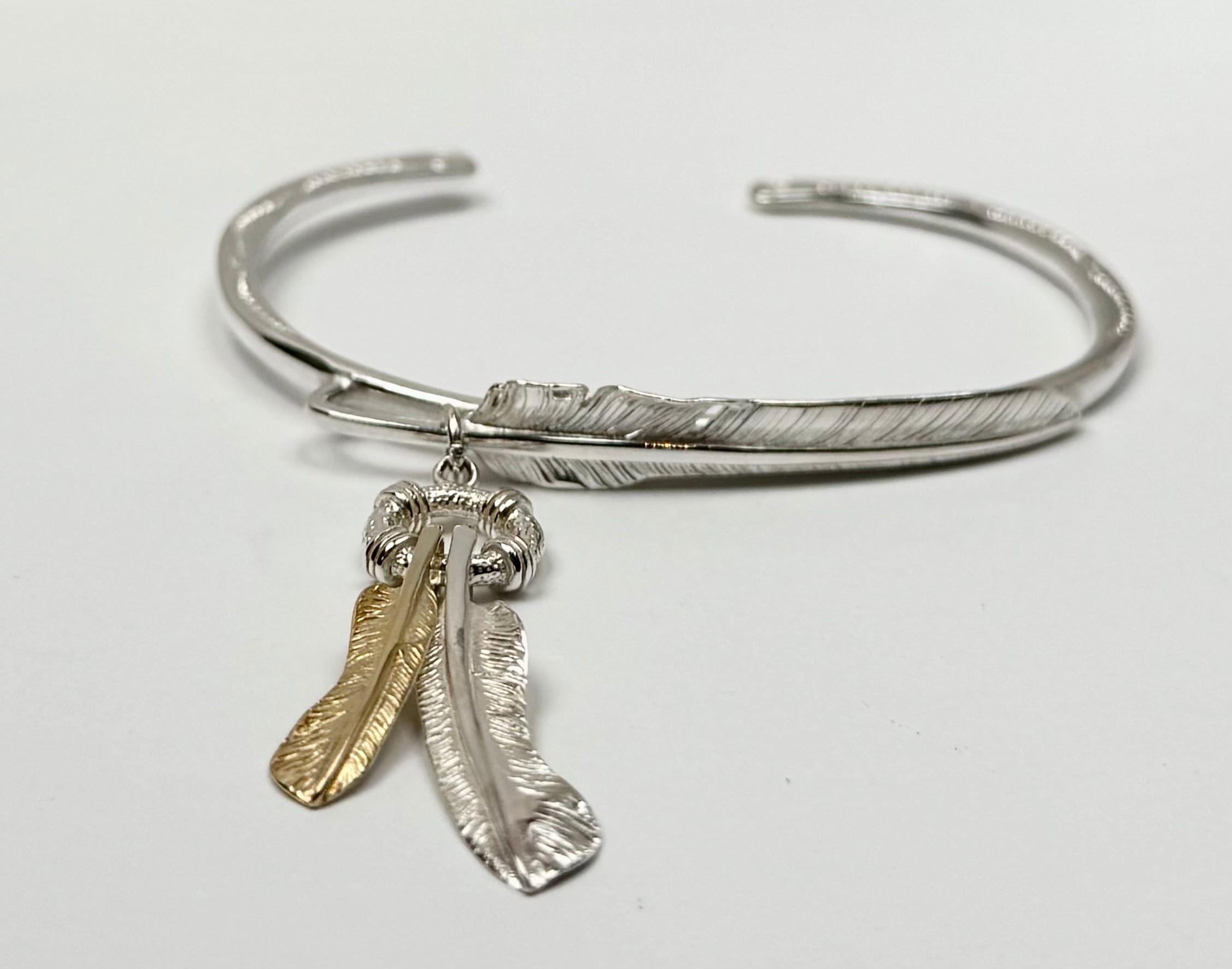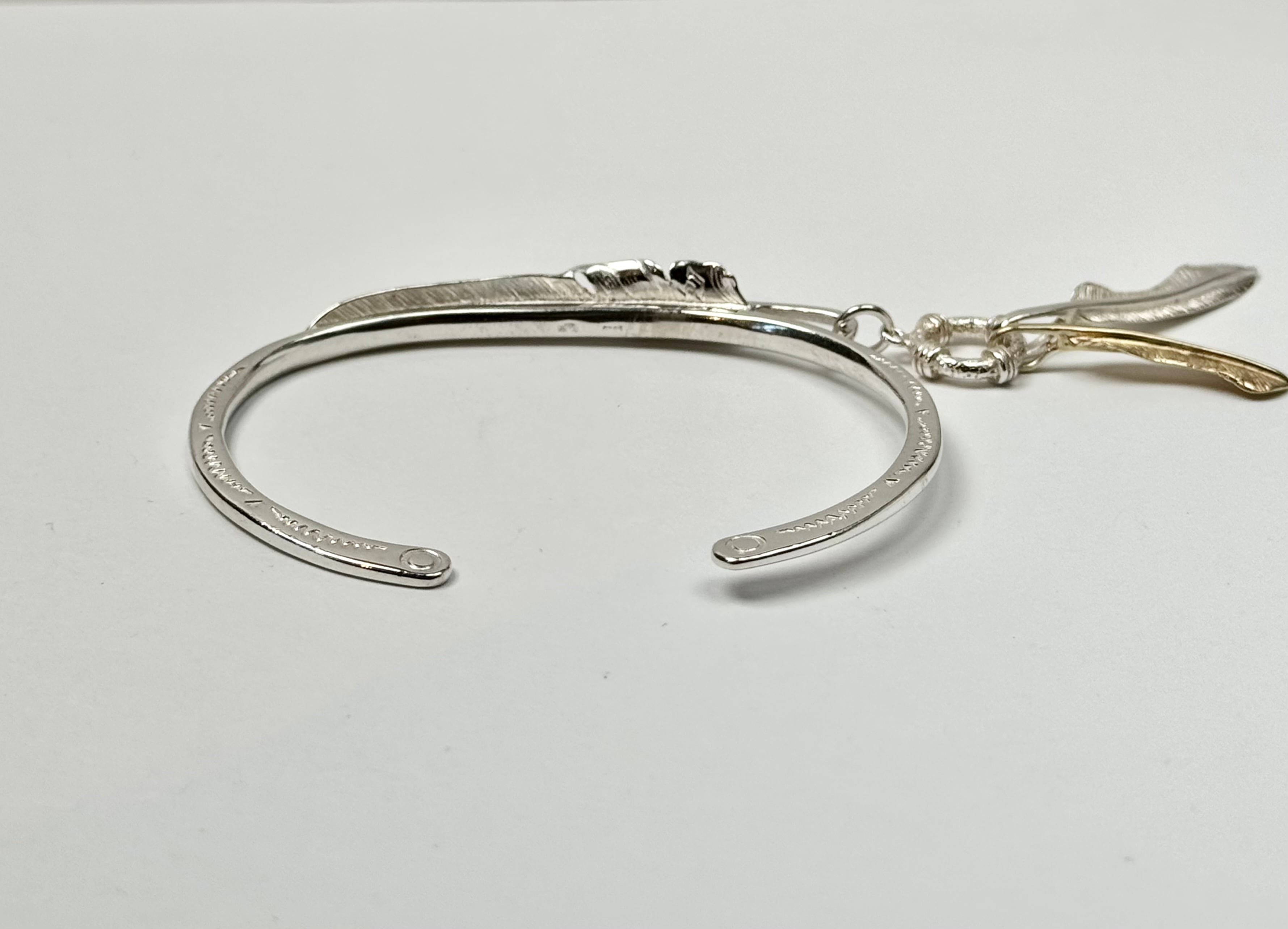 揺れる金銀2枚のフェザーのチャームが特徴的なバングル。