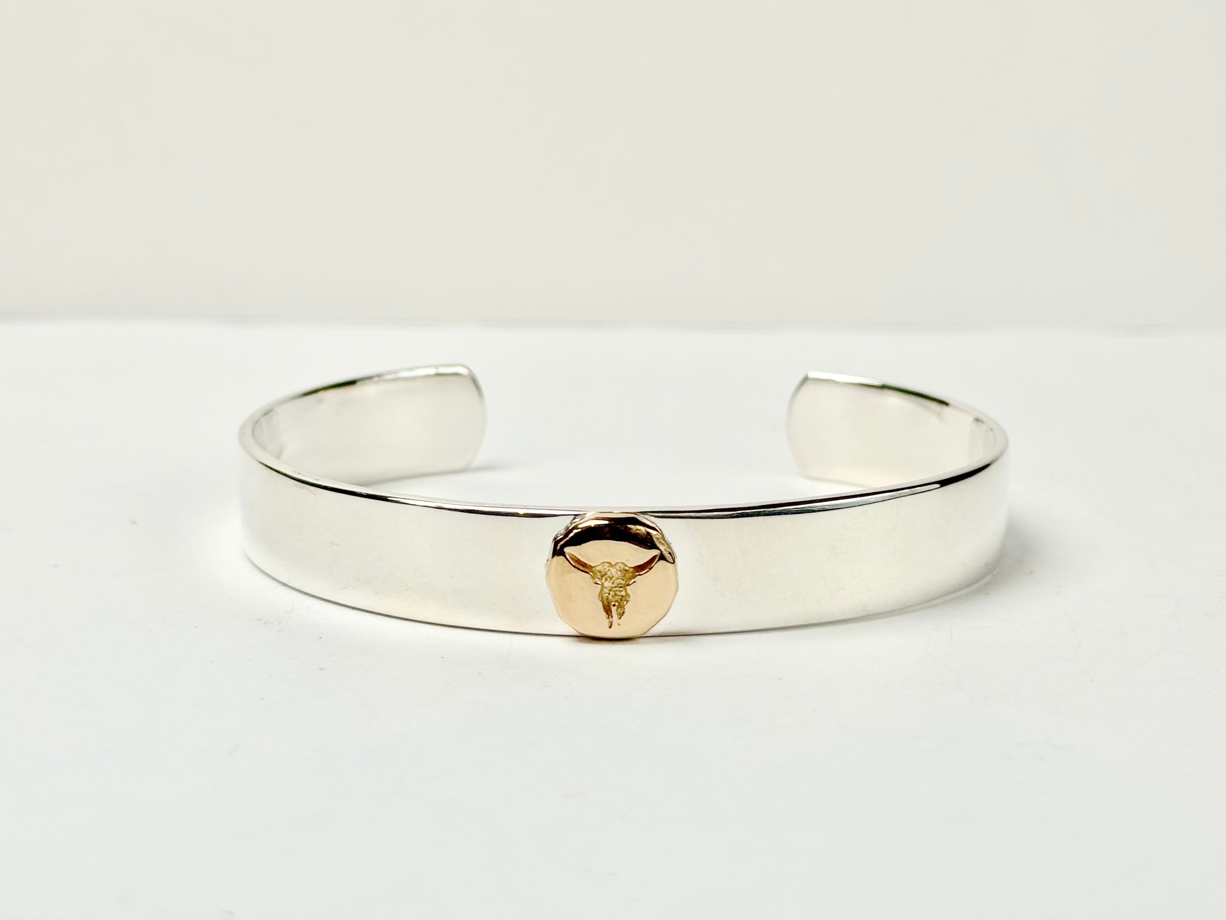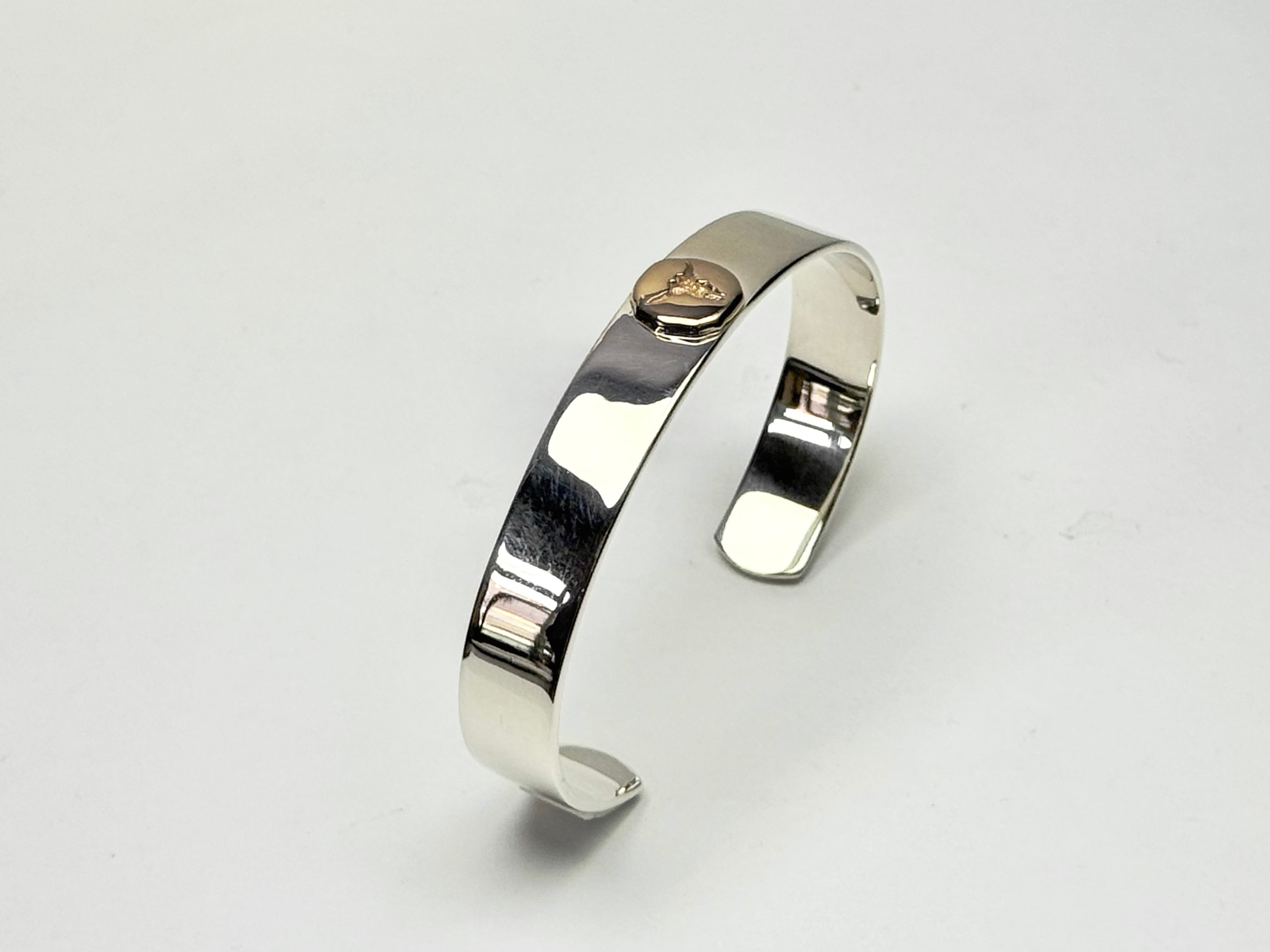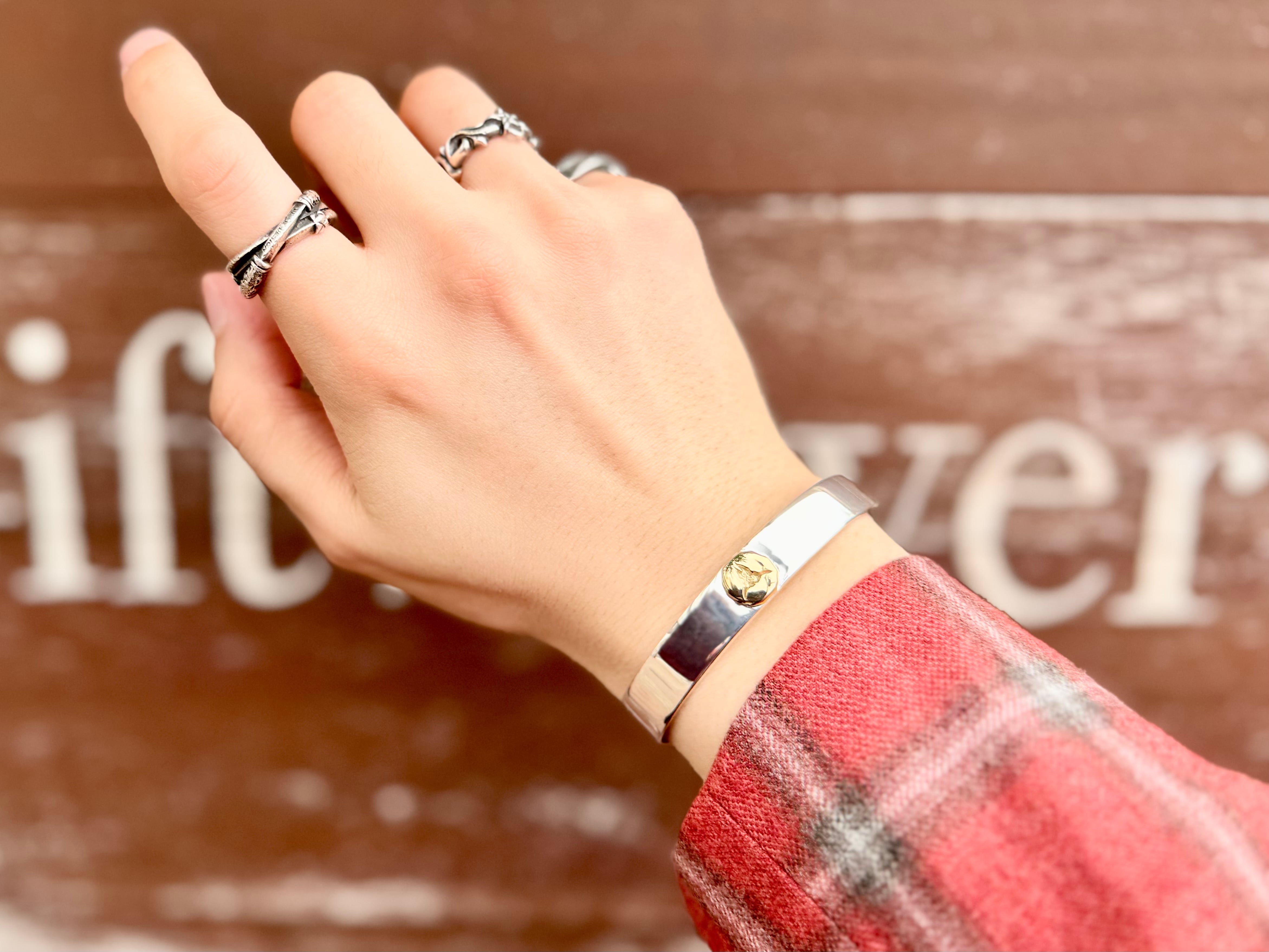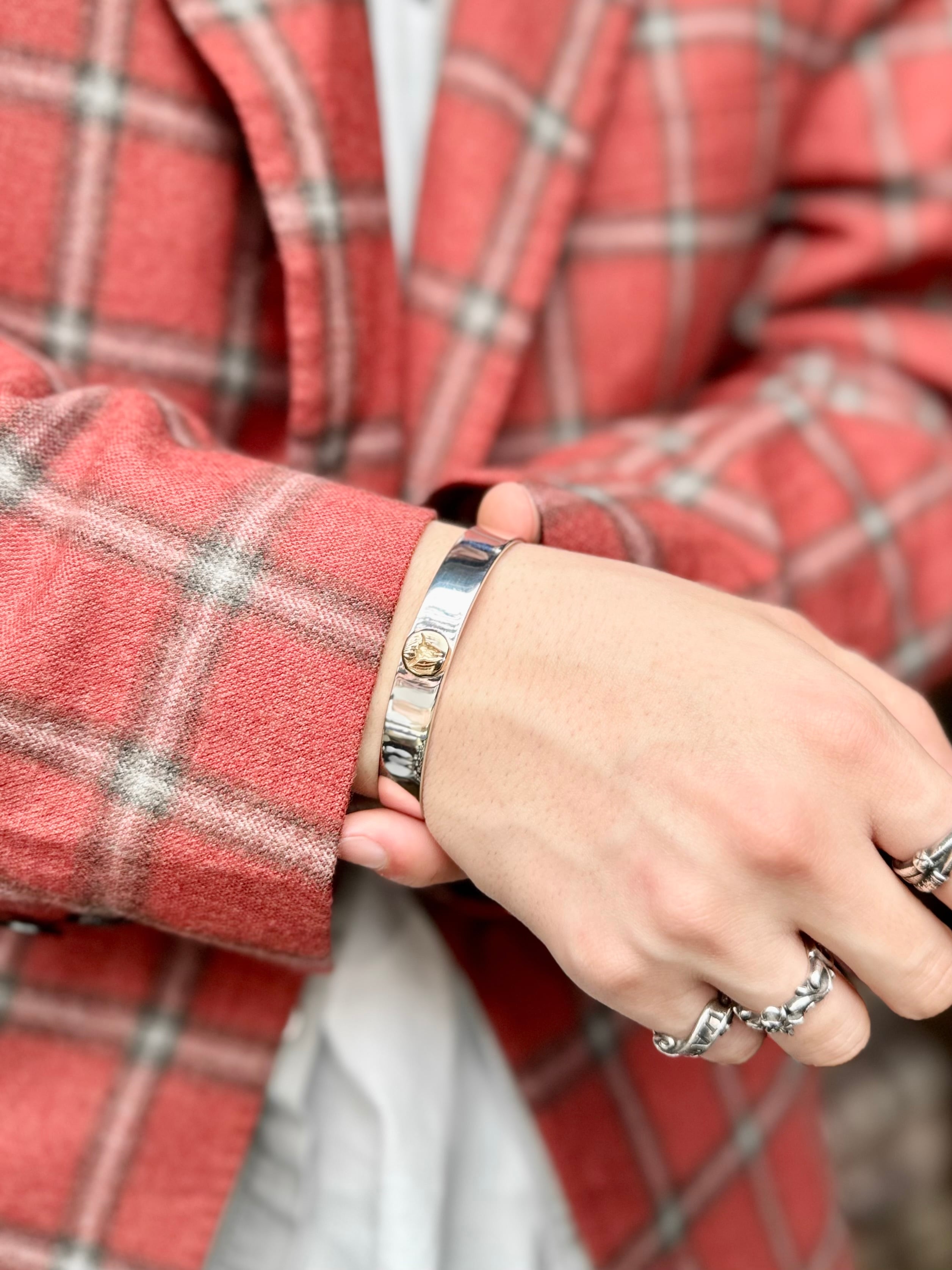 平打ちのバングルにバッファローの頭部が刻印された真鍮製のコインがデザインされているバングル。