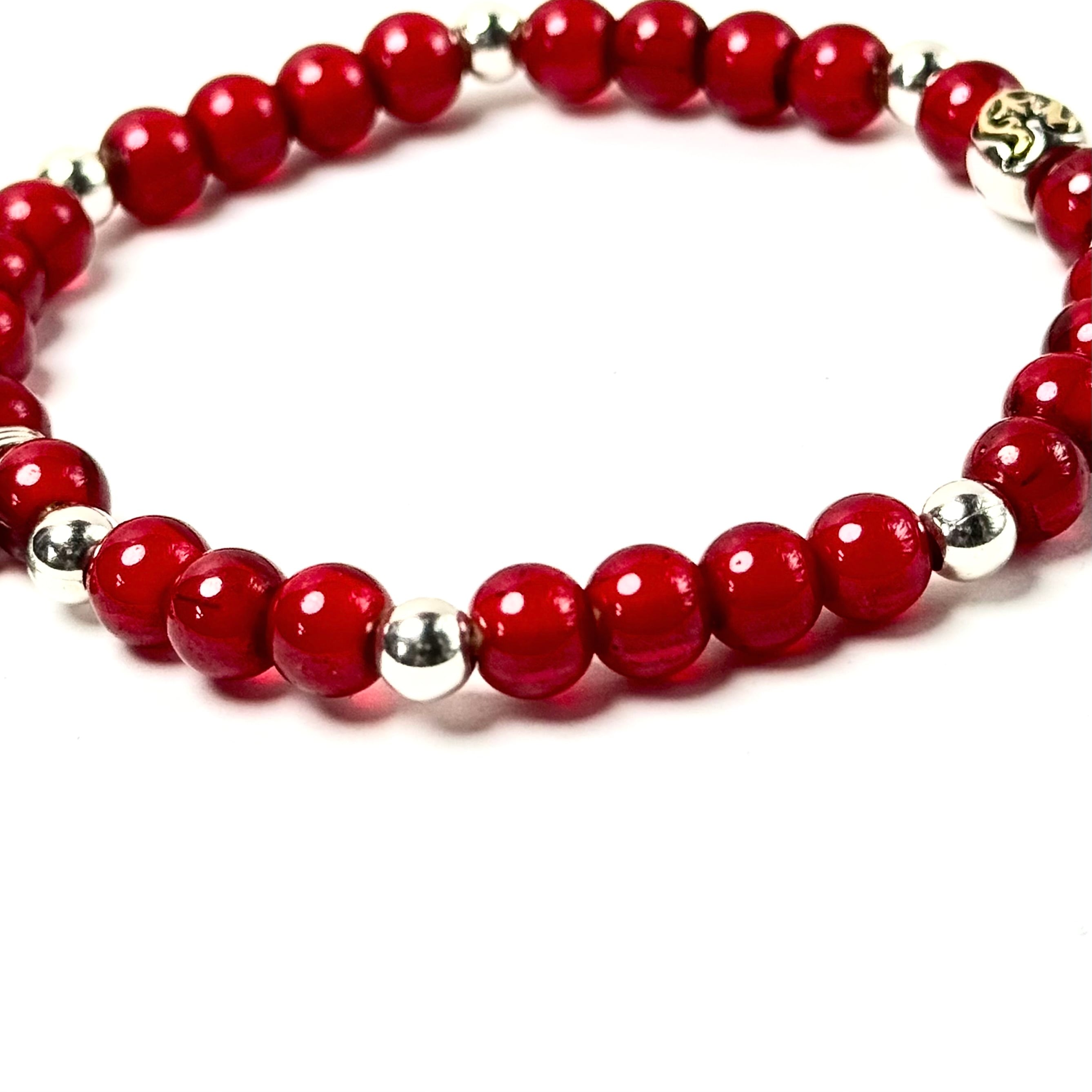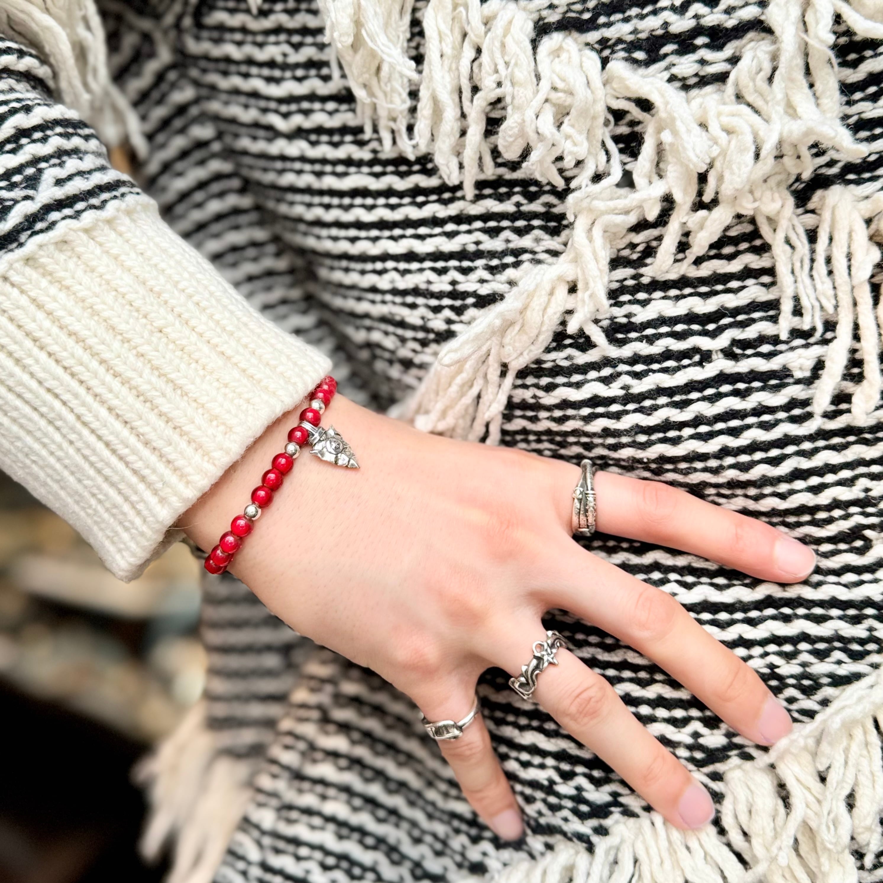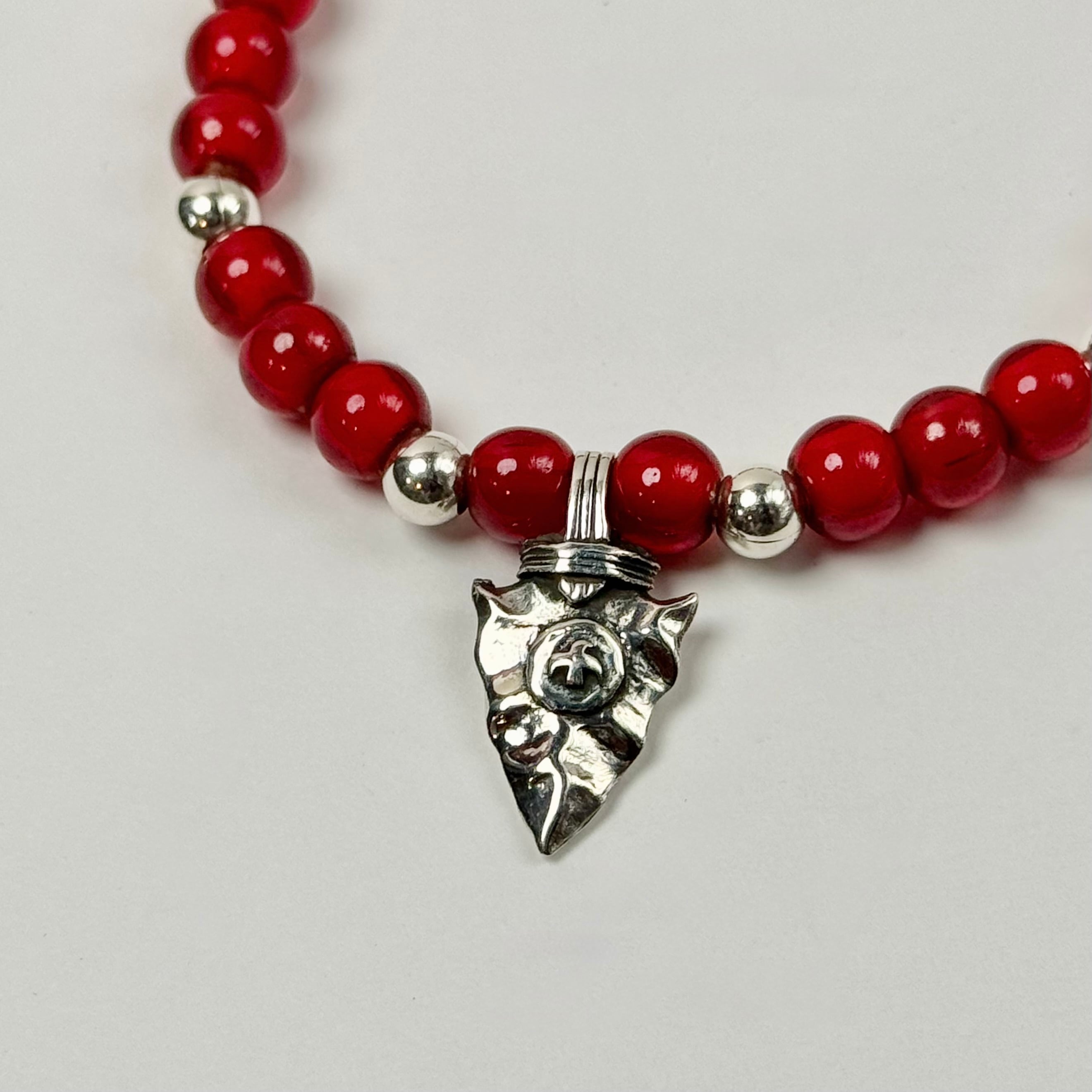 当店オリジナルブランドGift Roverの深い赤色のビーズにシルバーパーツとアローヘッドのトップを組み合わせたブレスレット。