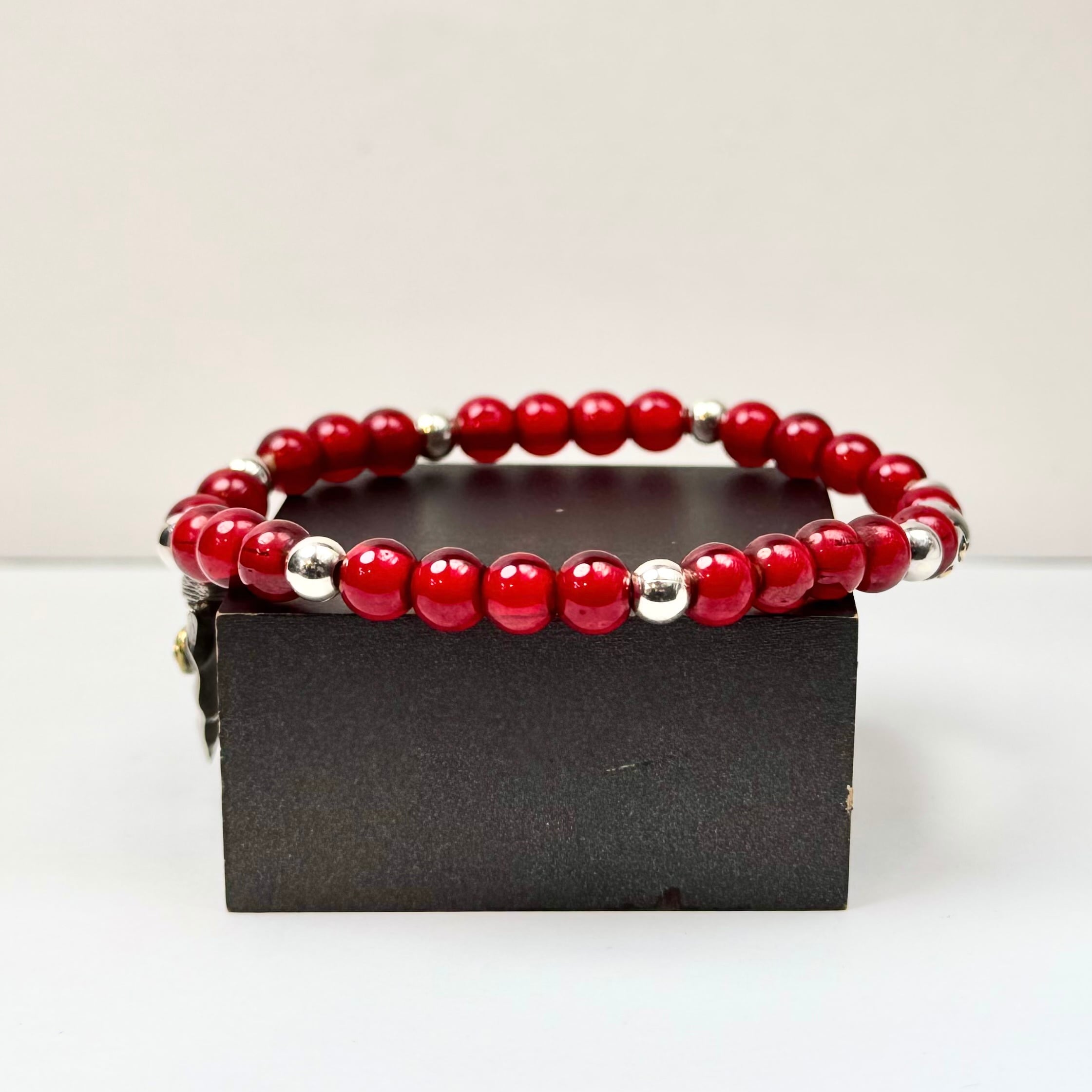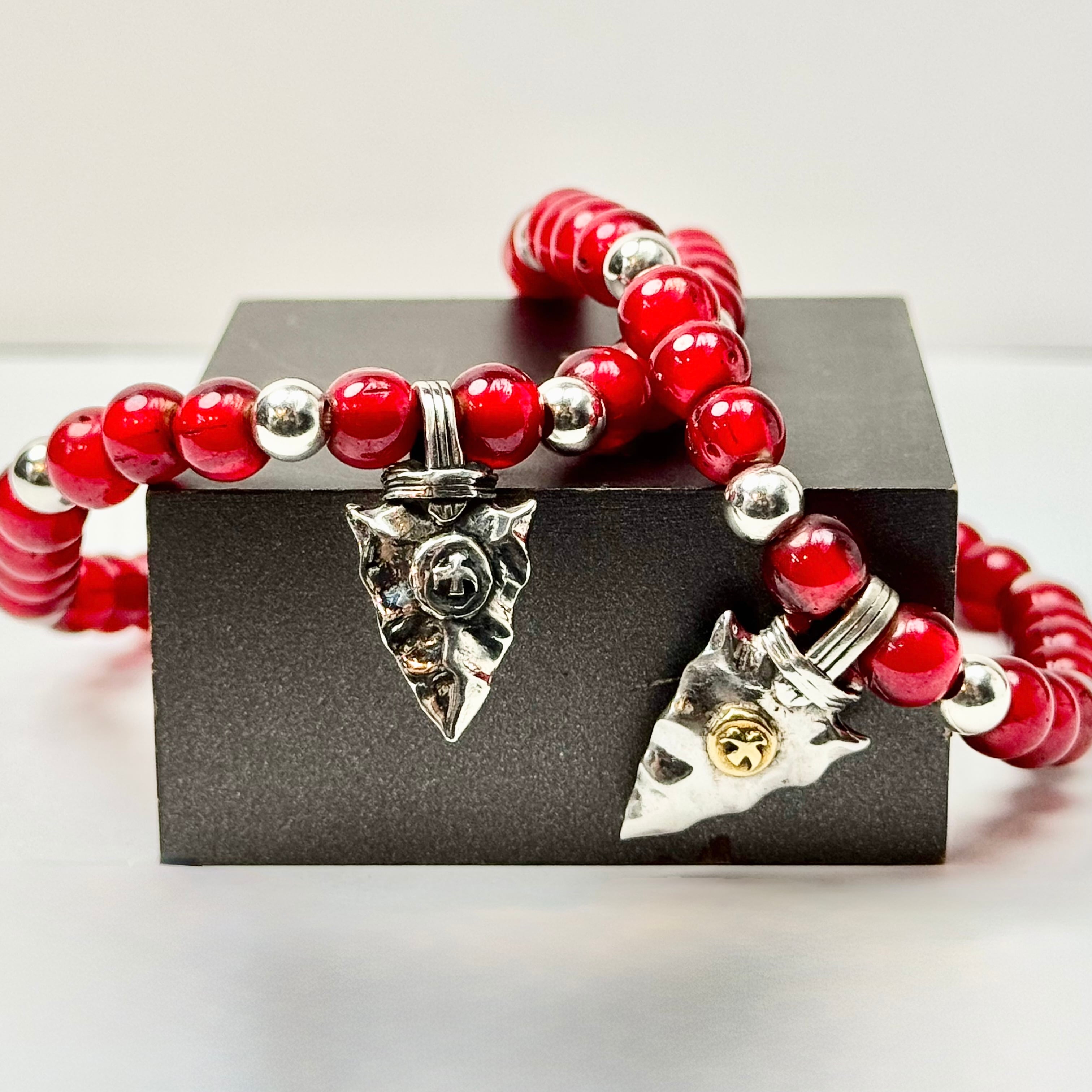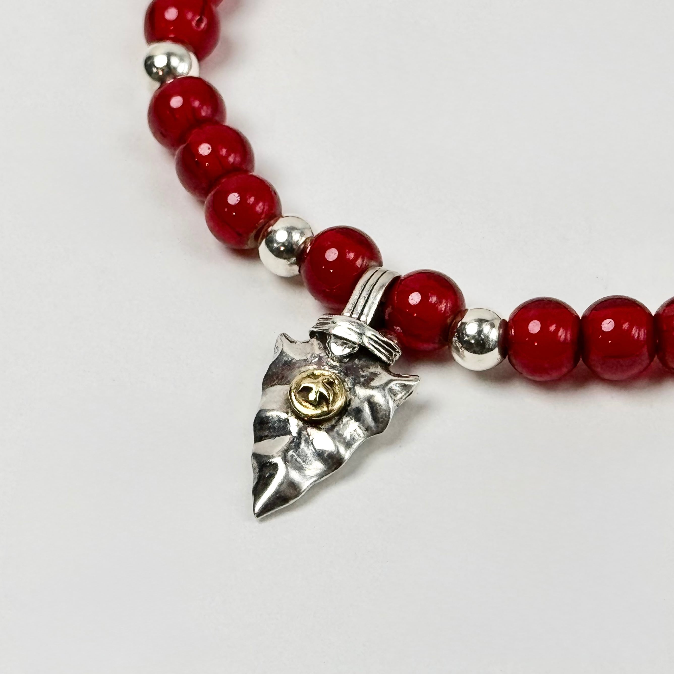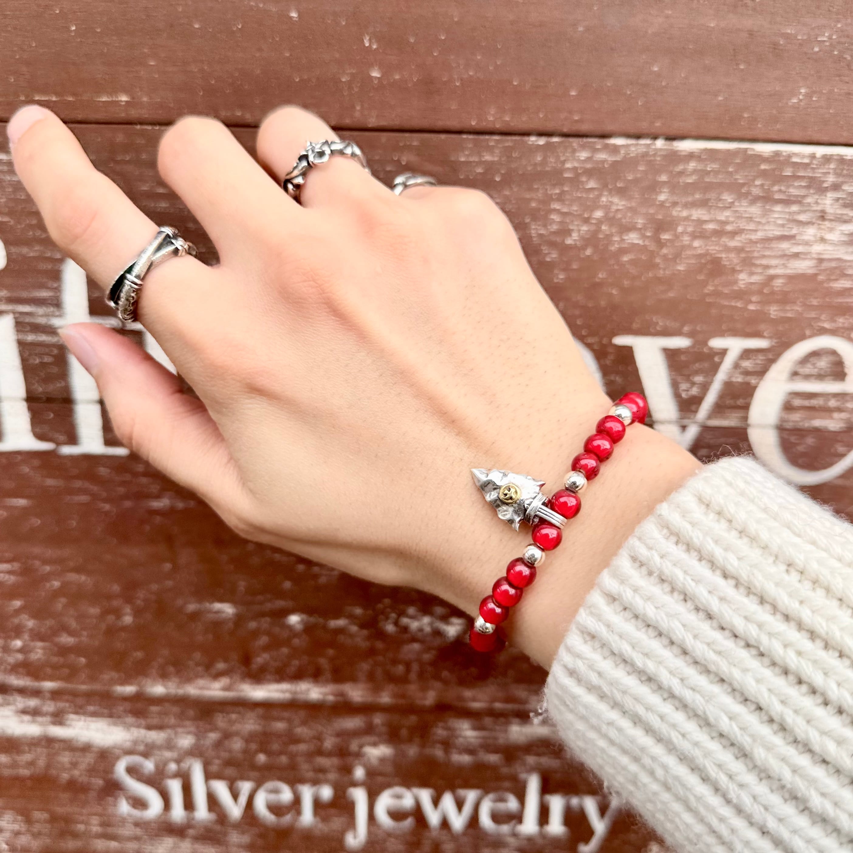 当店オリジナルブランドGift Roverの深い赤色のビーズにシルバーパーツとアローヘッドのトップを組み合わせたブレスレット。