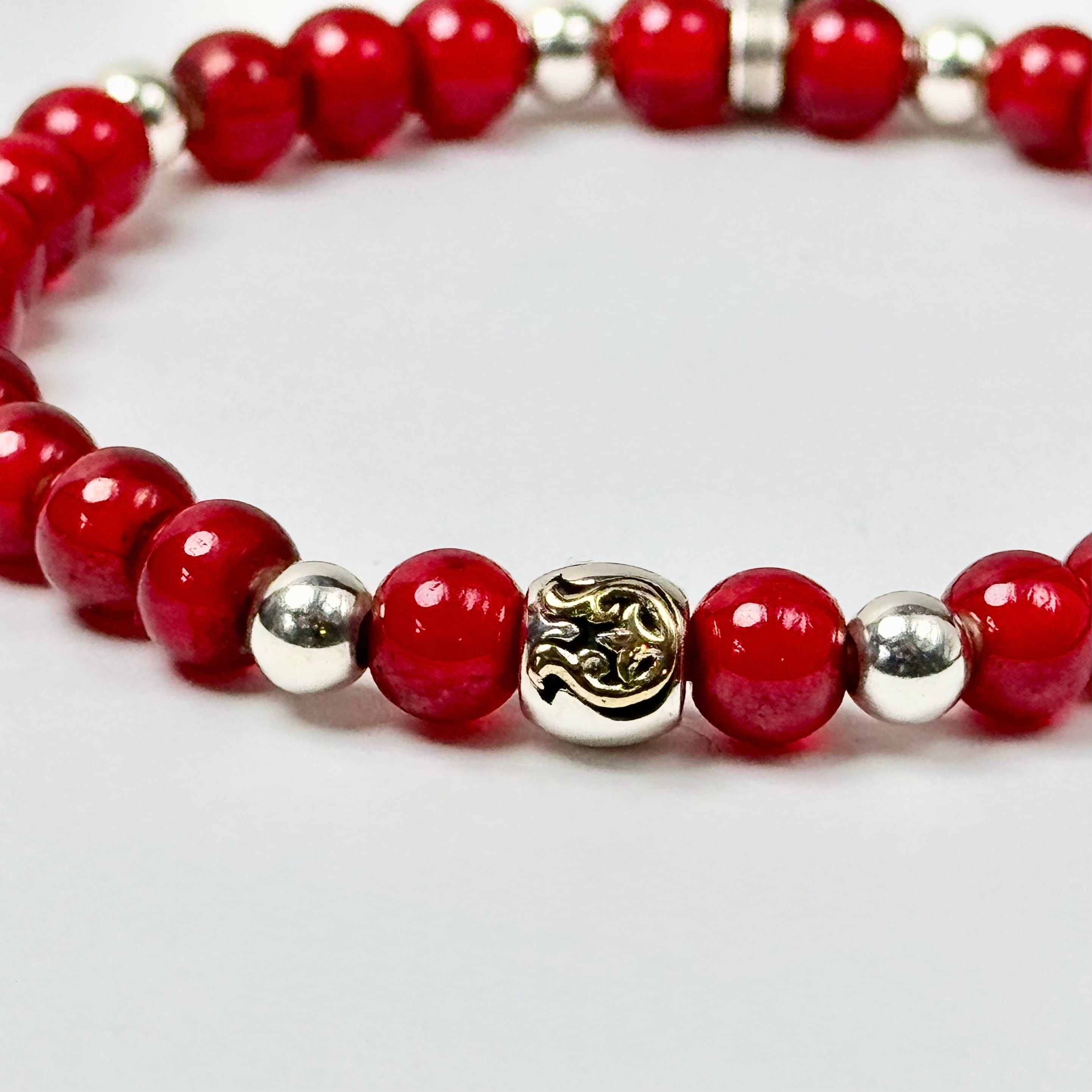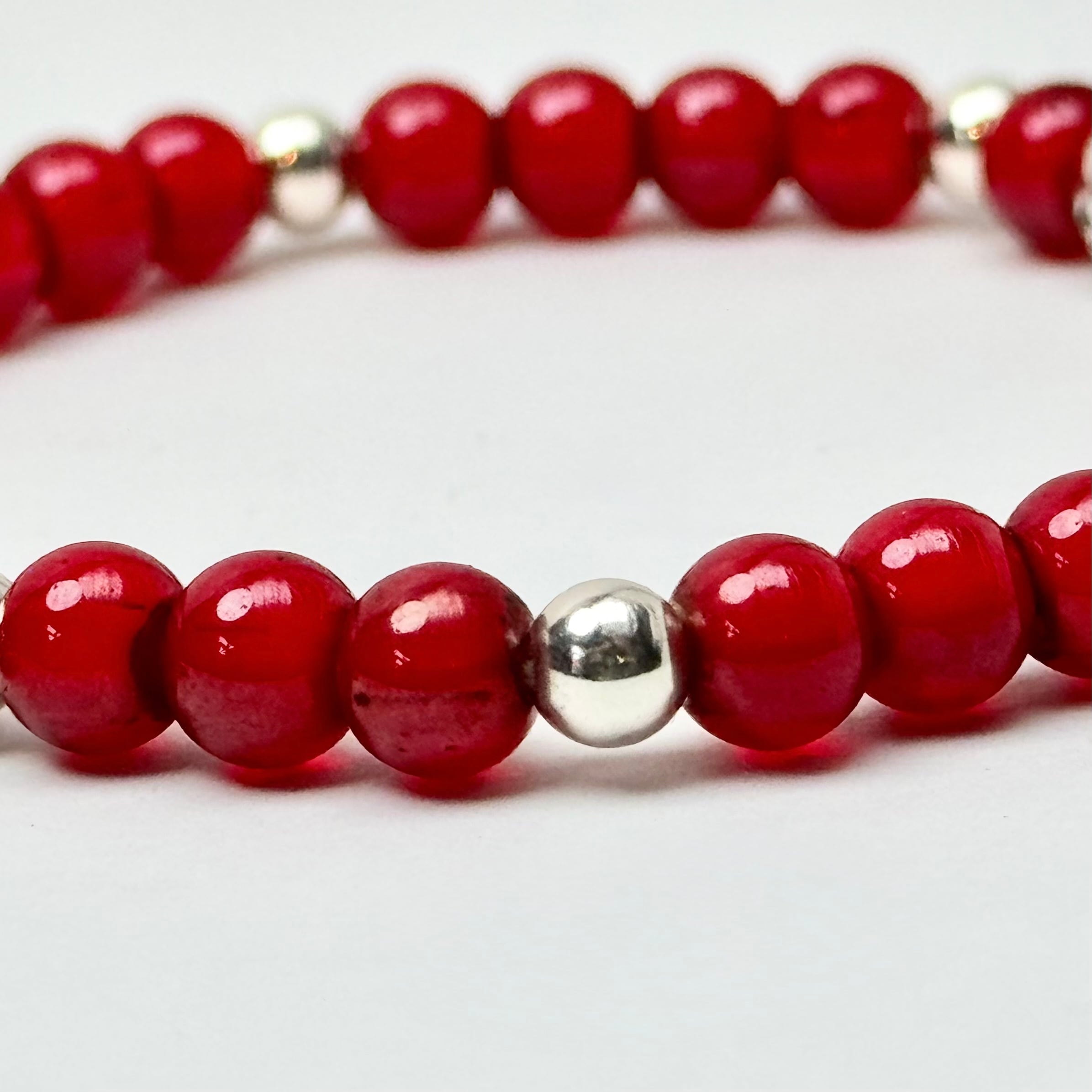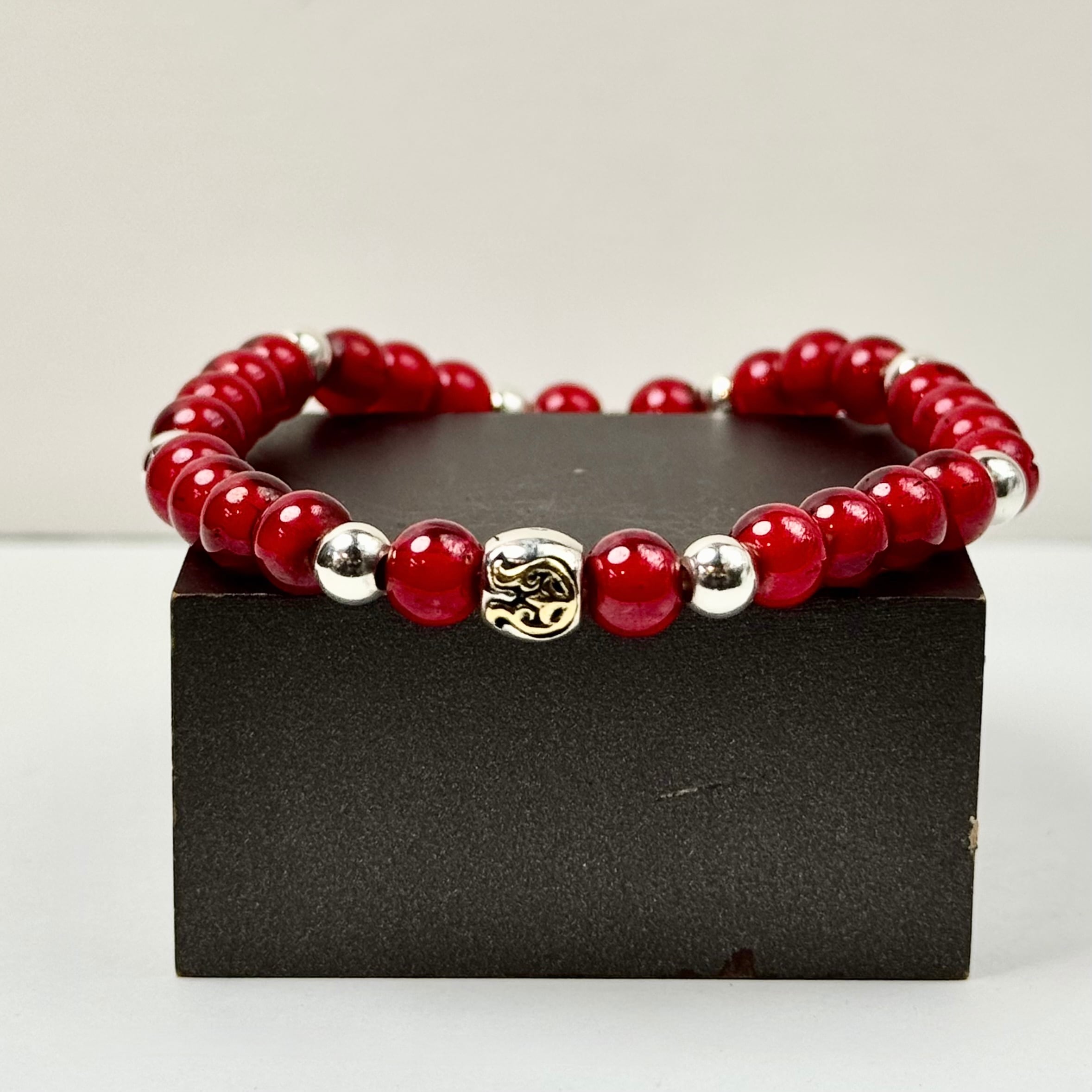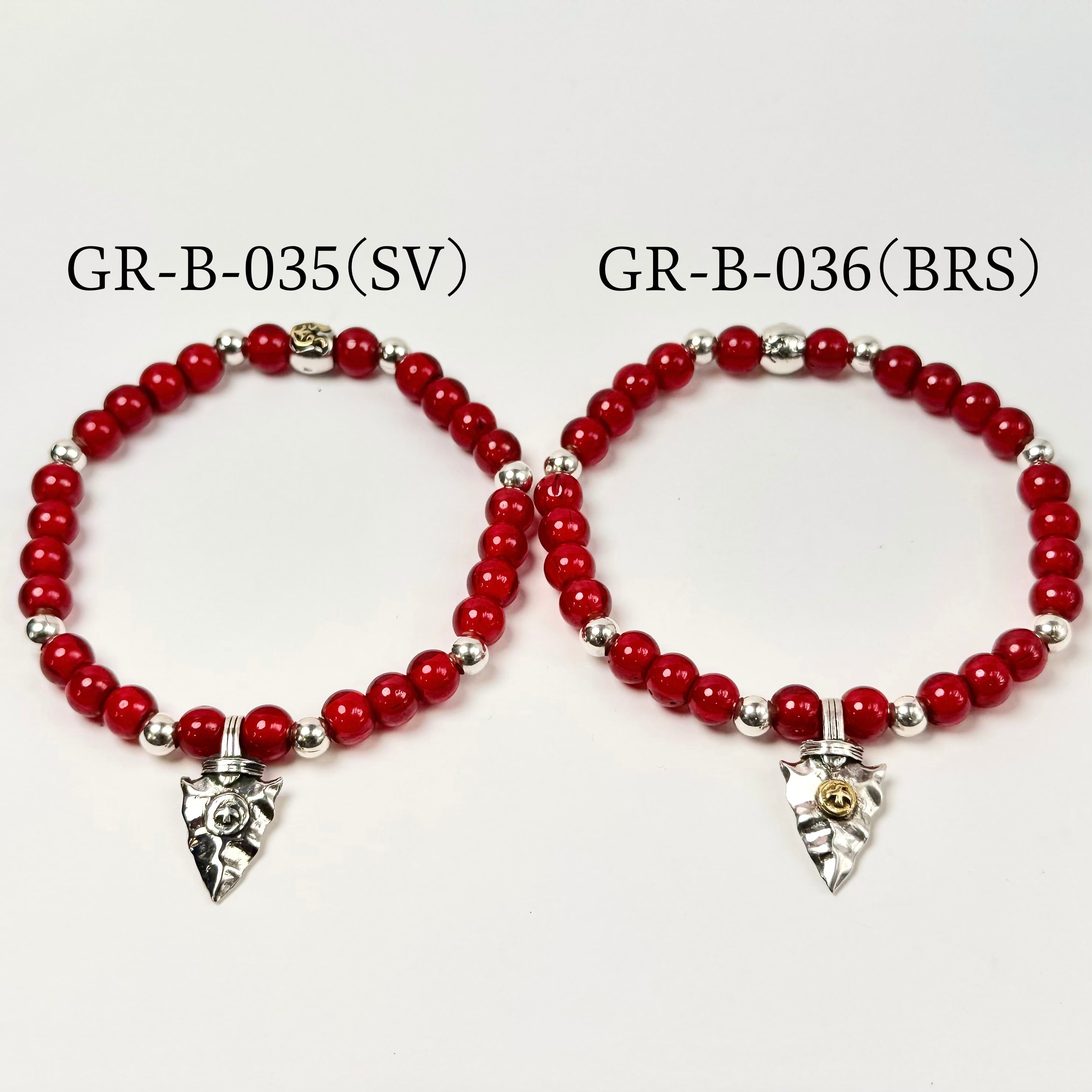 当店オリジナルブランドGift Roverの深い赤色のビーズにシルバーパーツとアローヘッドのトップを組み合わせたブレスレット。