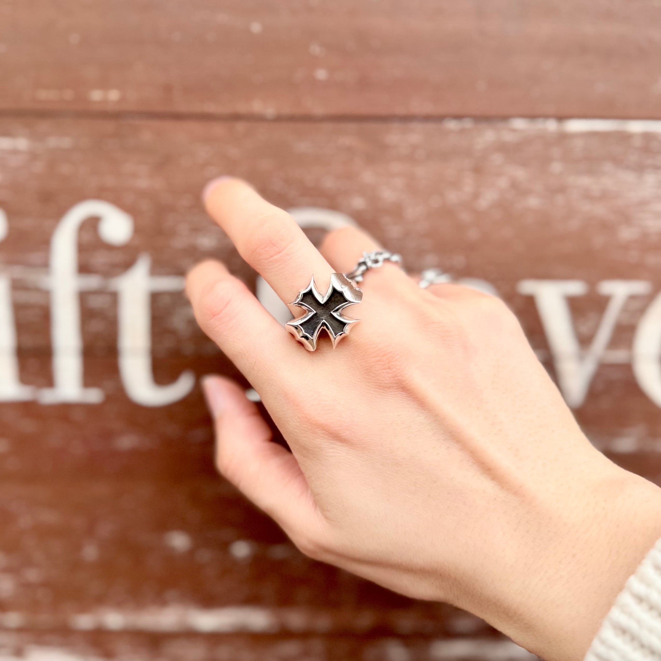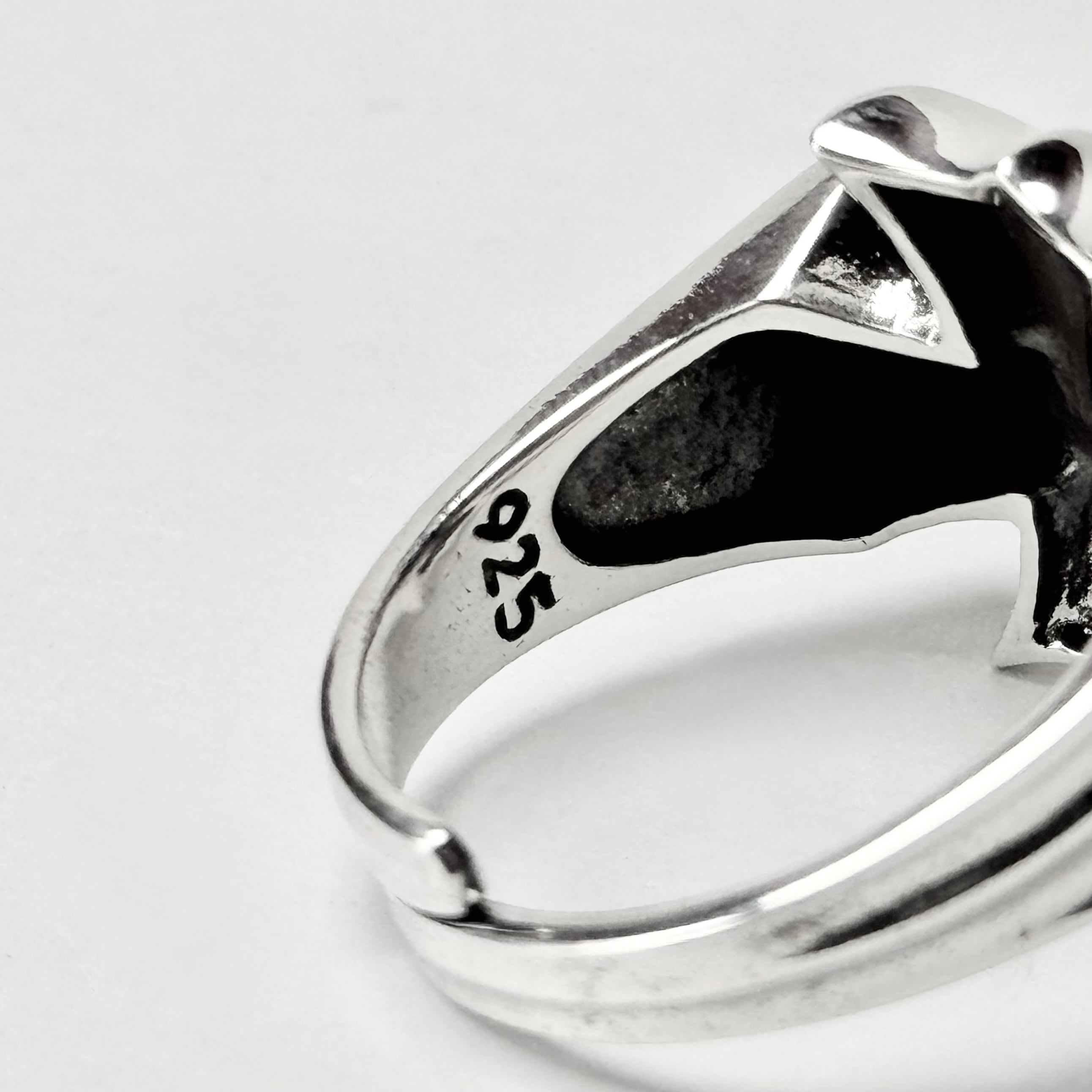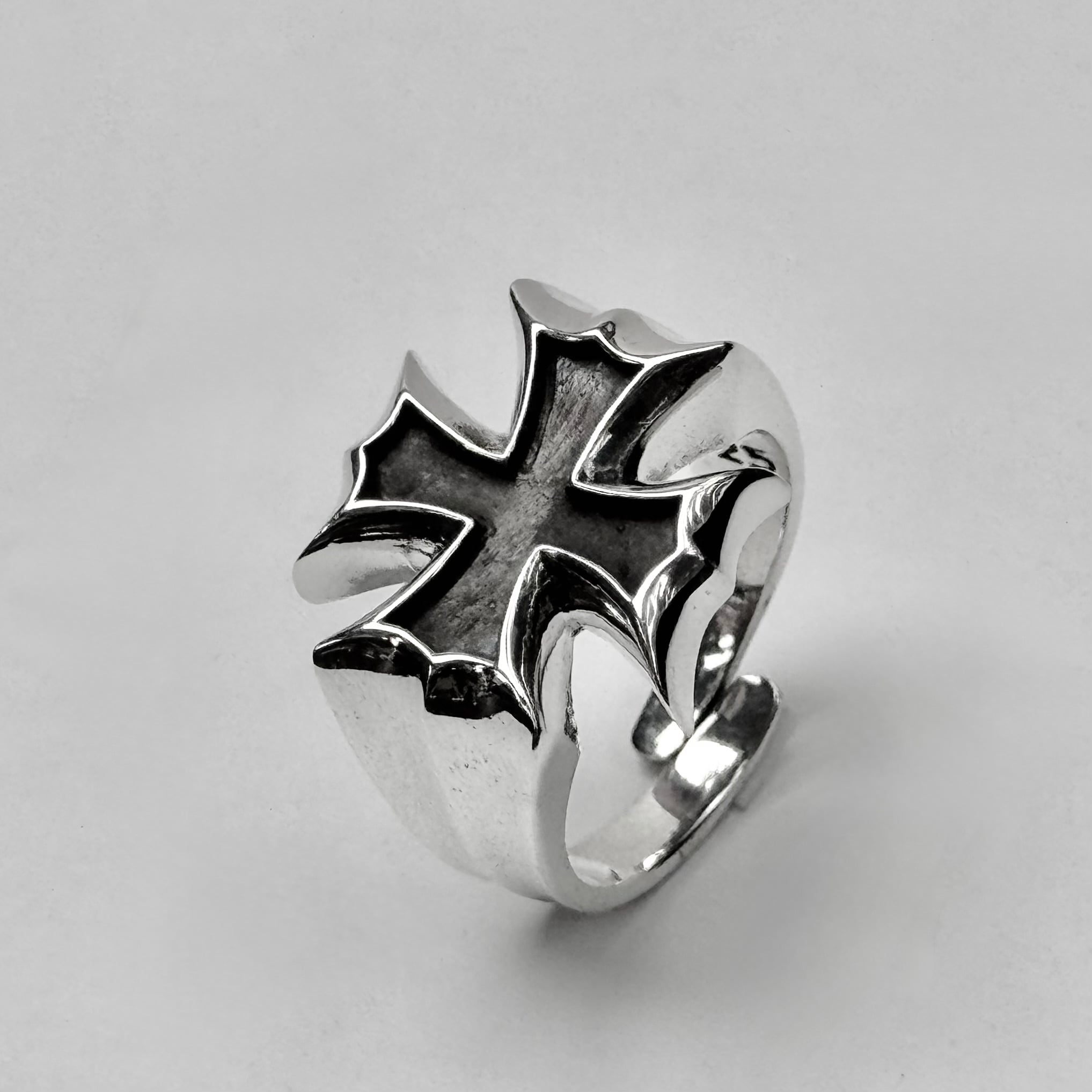 上辺に尖りを採用したデザインのアイアンクロスモチーフのリング。