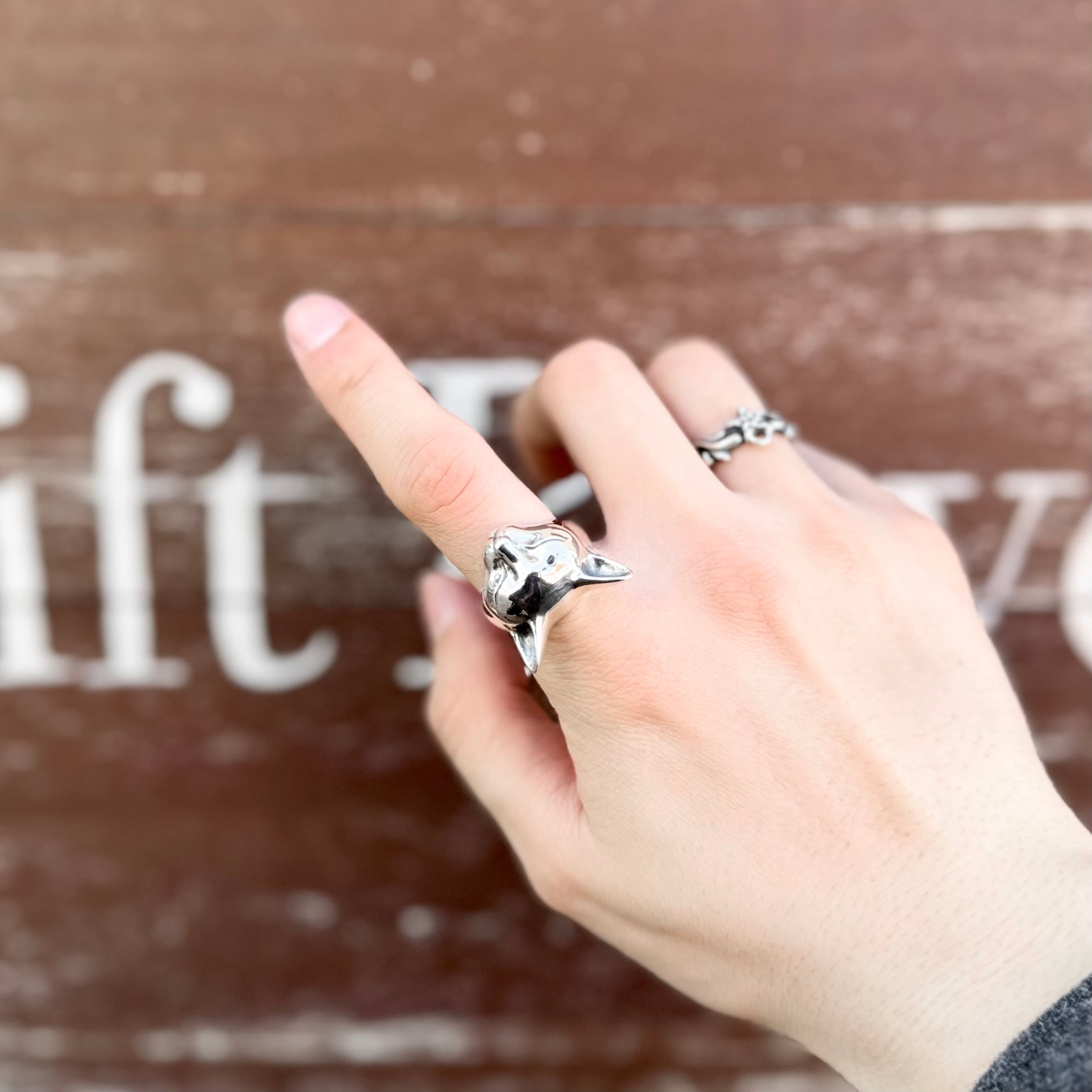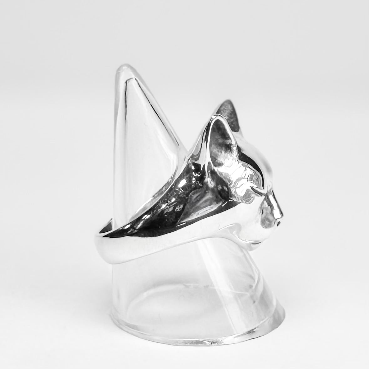 スタイリッシュな面持ちの目を閉じた猫の顔をモチーフとしたリング。