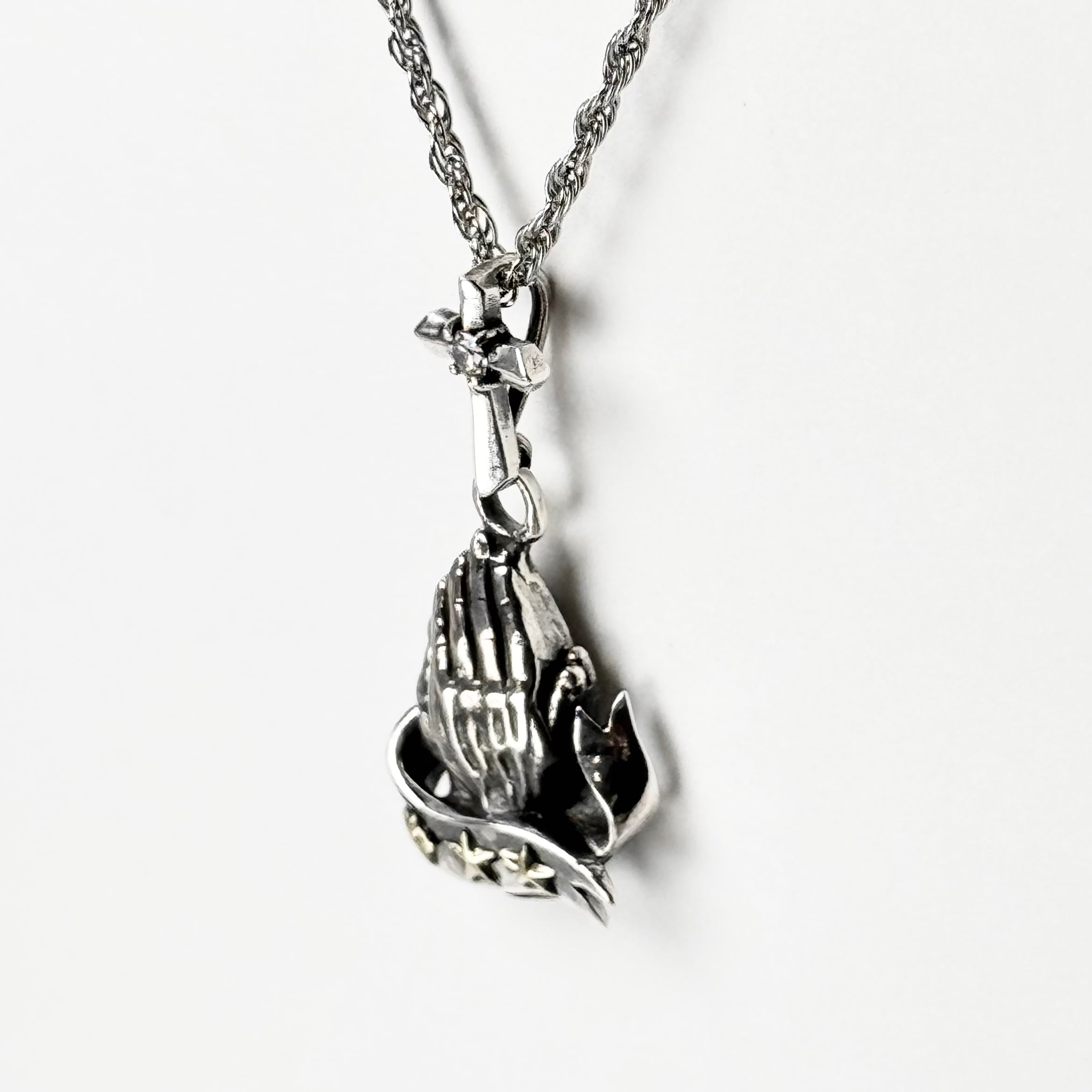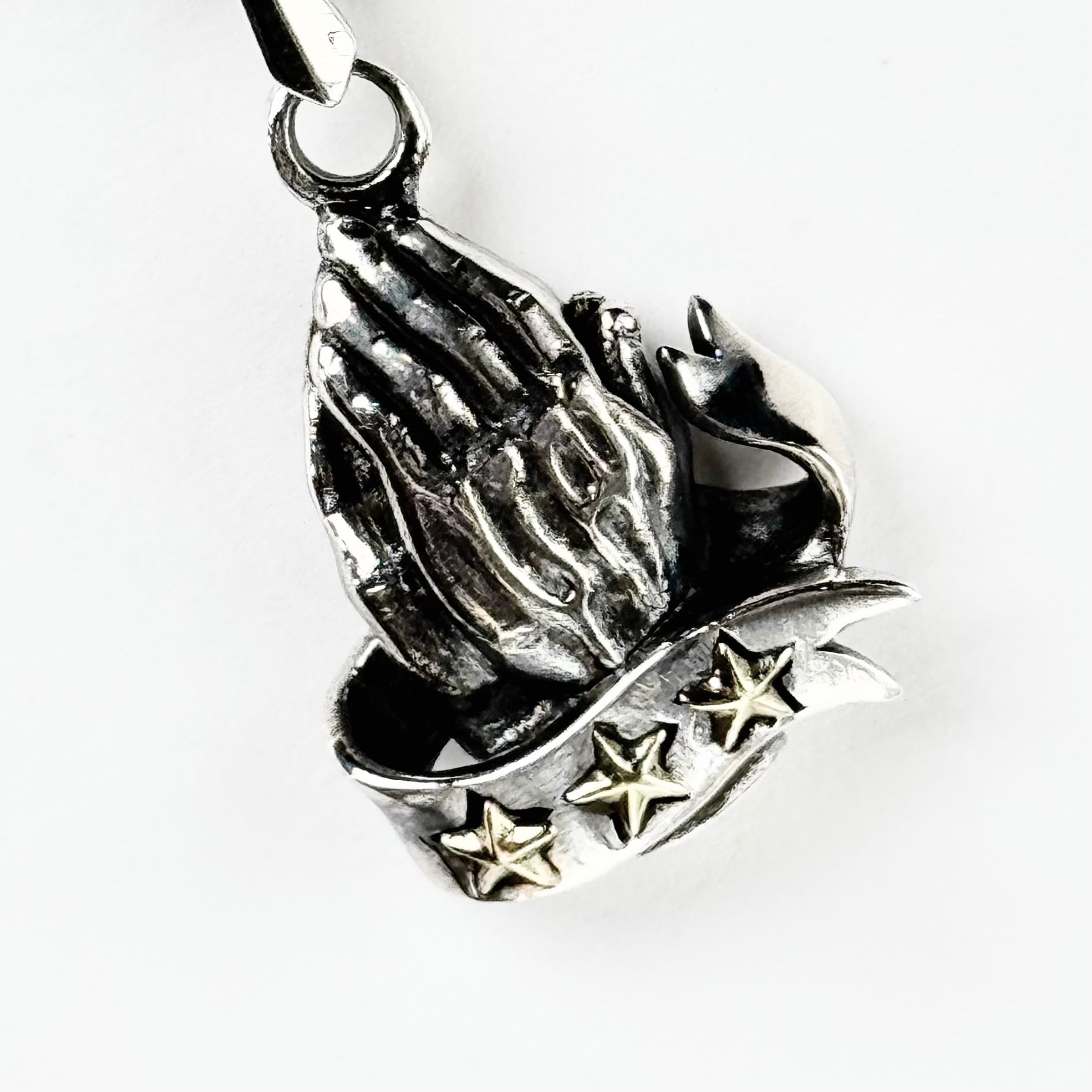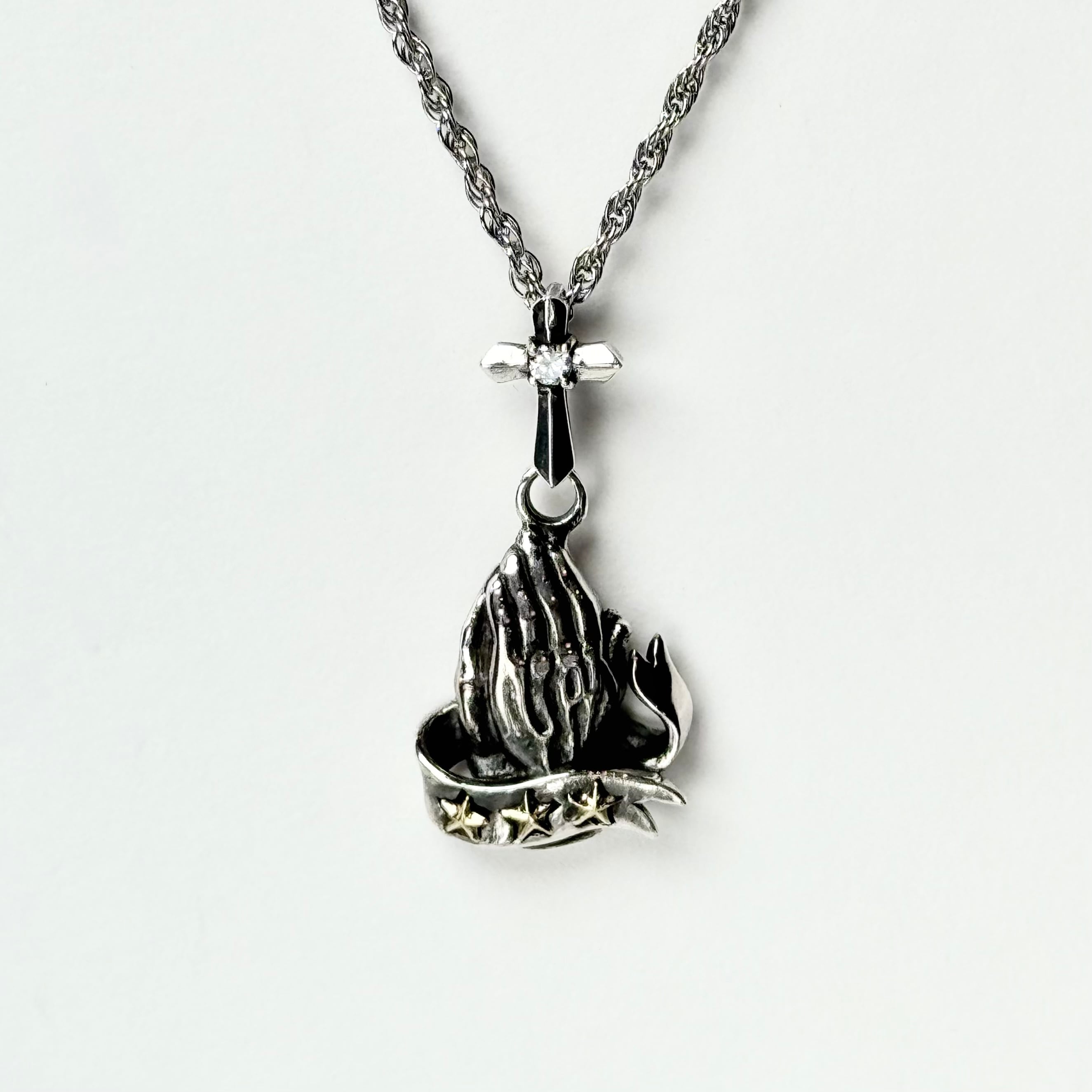 祈りの手をモチーフにリボンと星がデザインされたトップ。