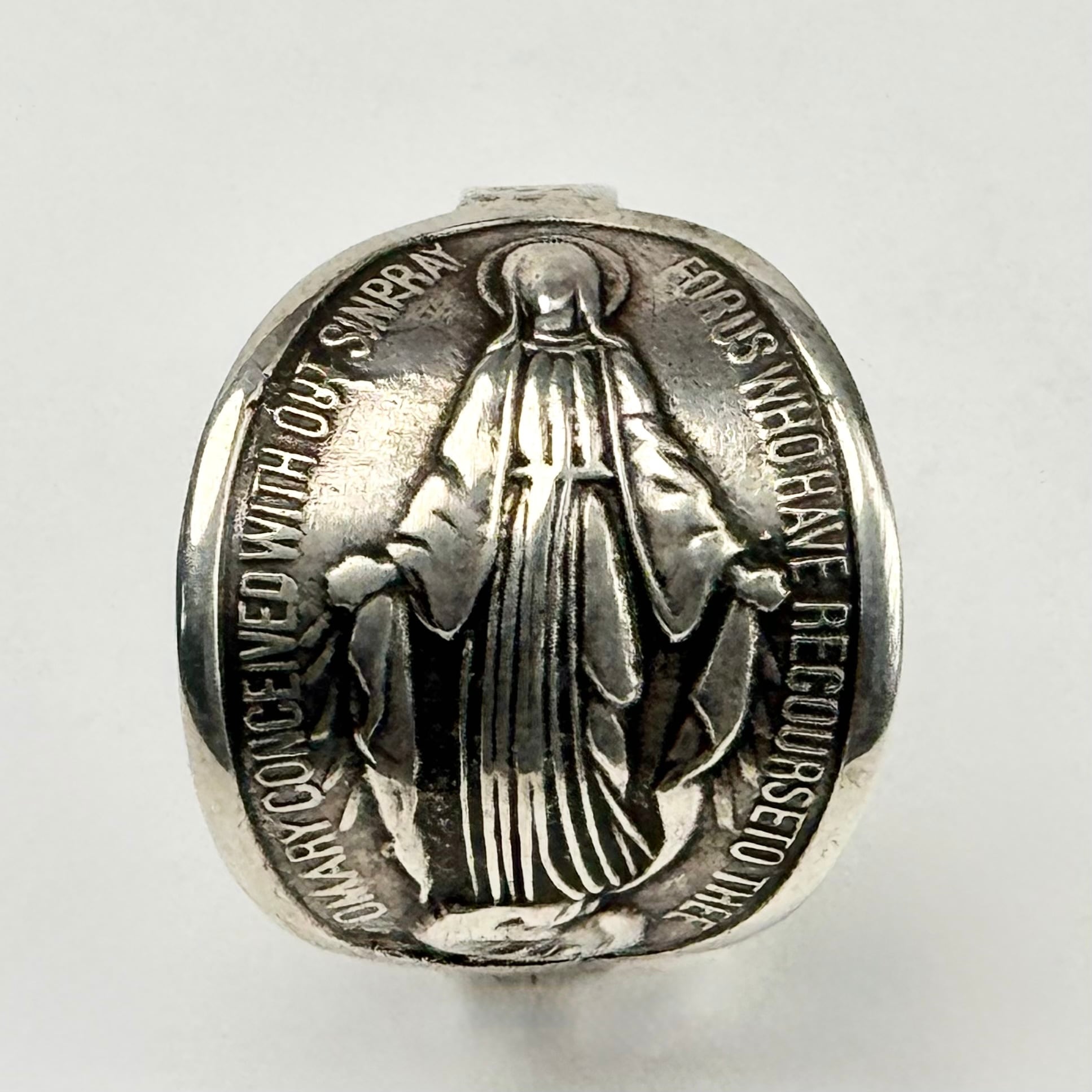 "forus who have recourse to thee o'mary conceived without sin pray"、「罪なく宿られたマリアよ、あなたに頼る私たちのためにお祈りください。」という祈りの文章がデザインされており聖母からの恵を与えてもらえるような縁起の良い一品。