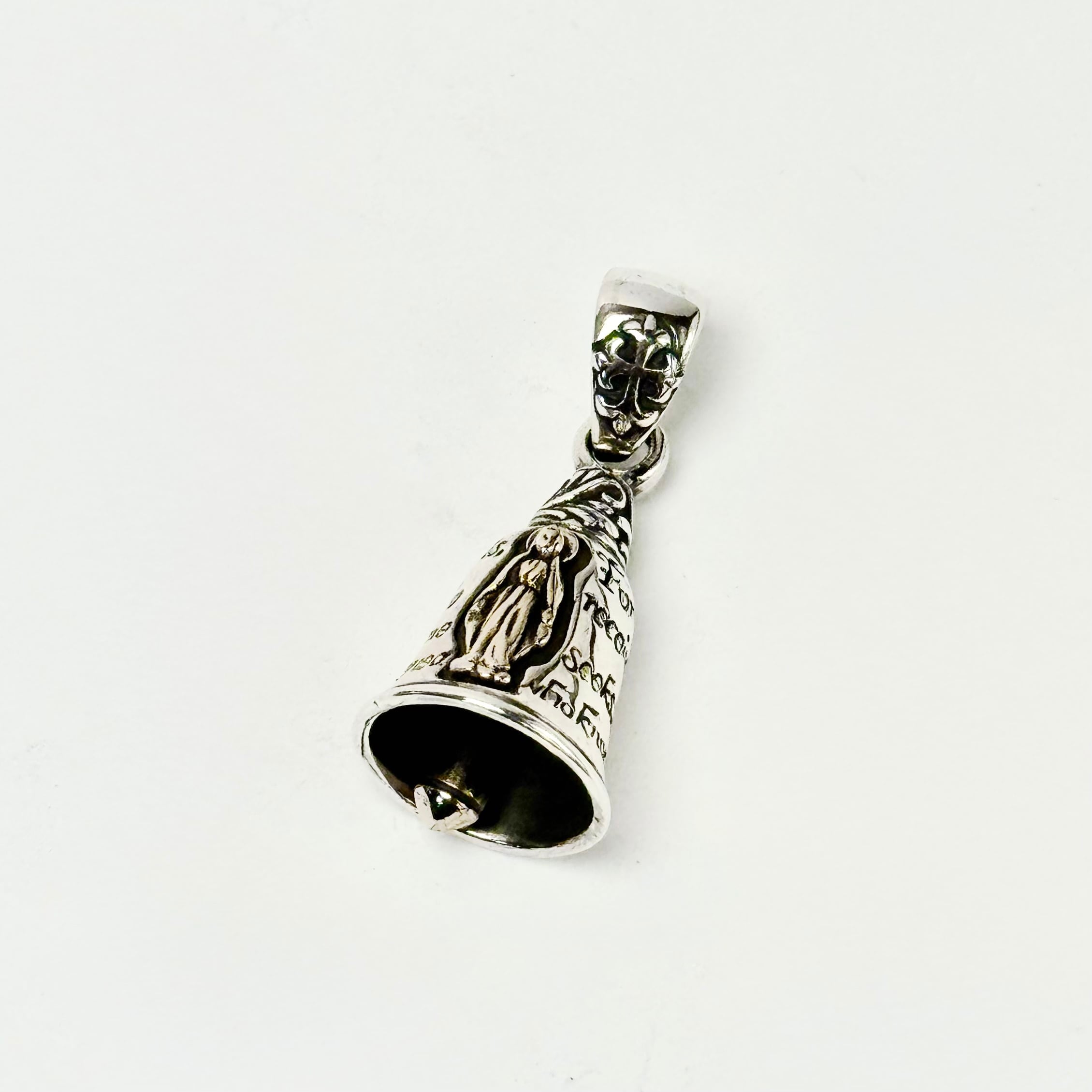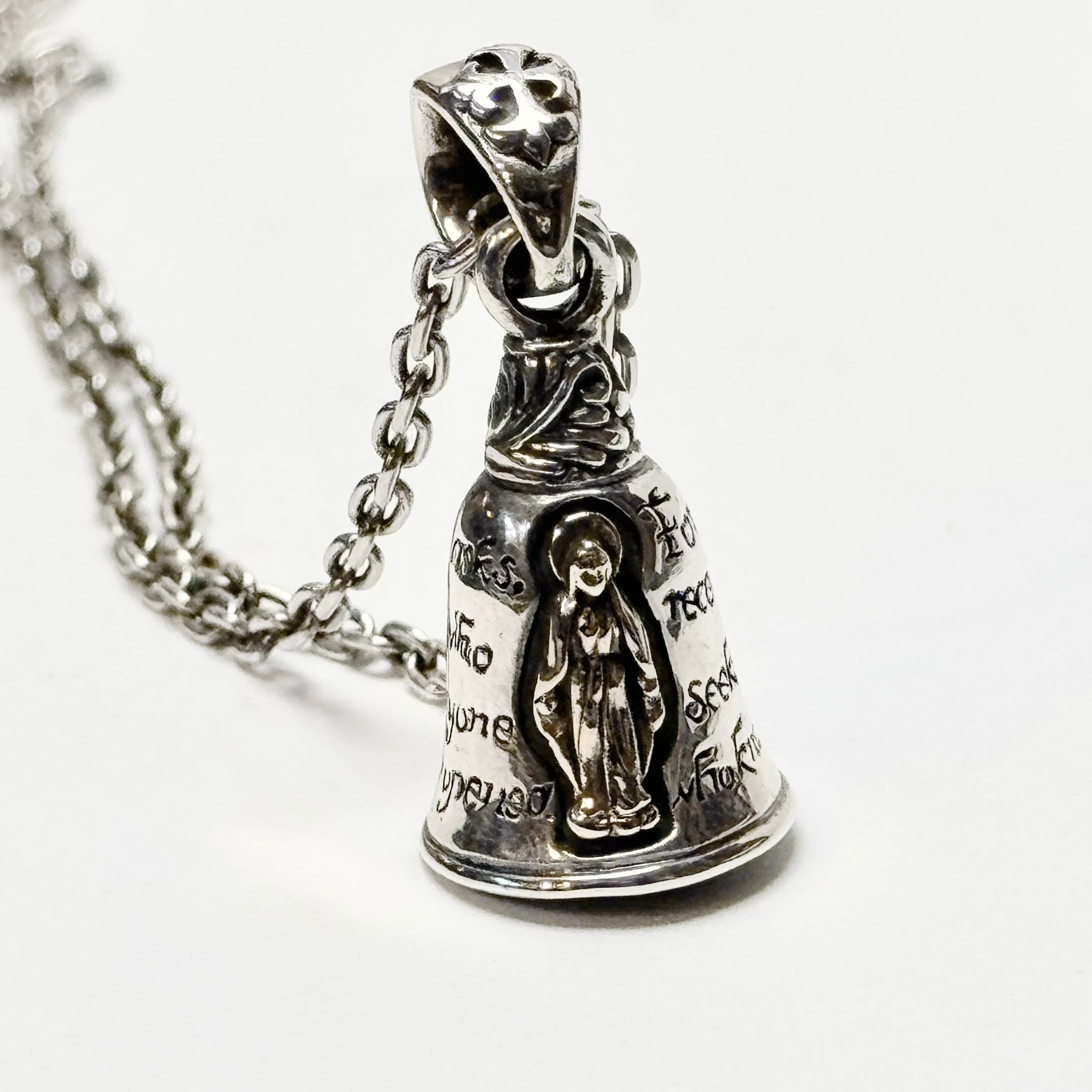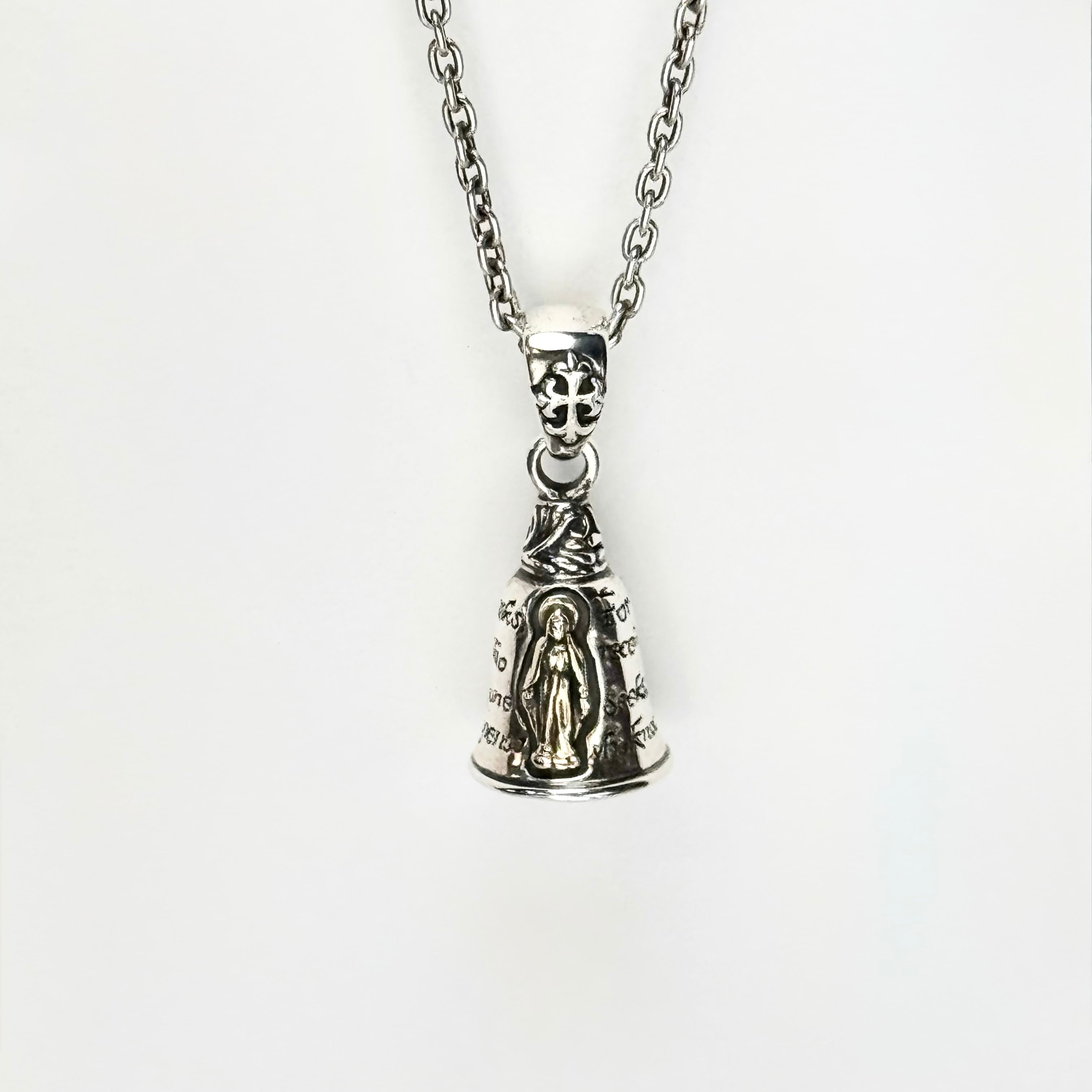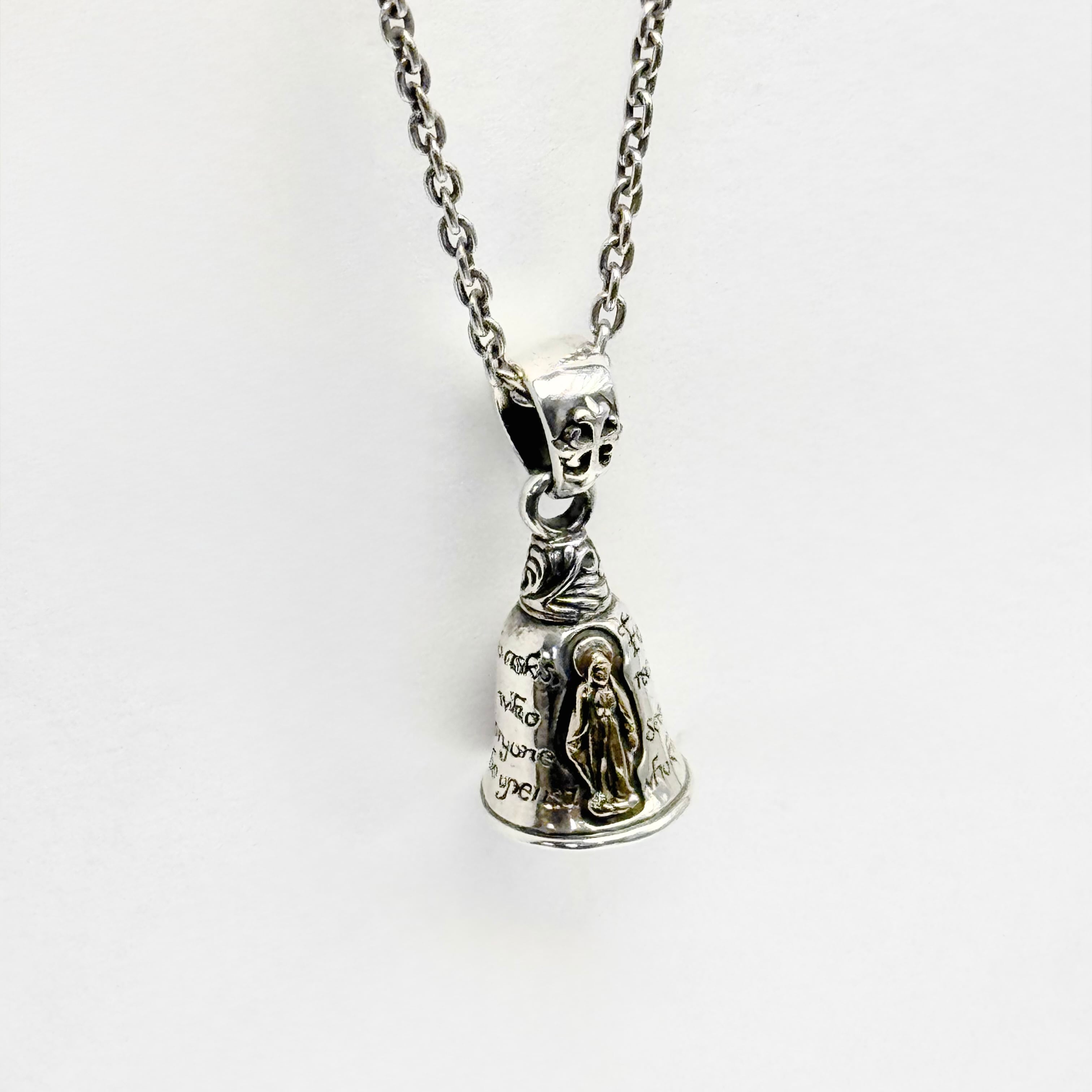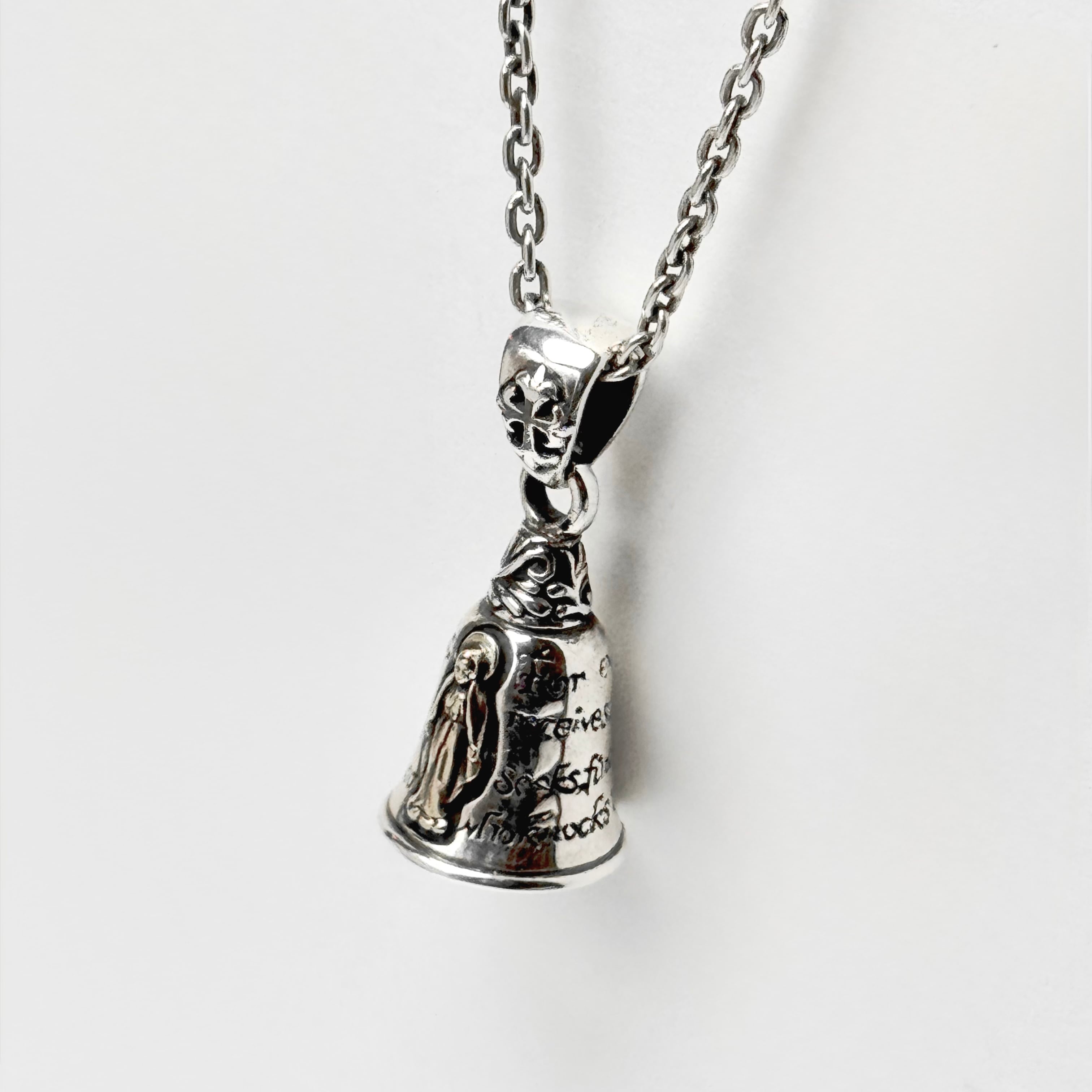 ベルのモチーフにグアダルーペマリアと祈りの言葉がデザインされたペンダント。