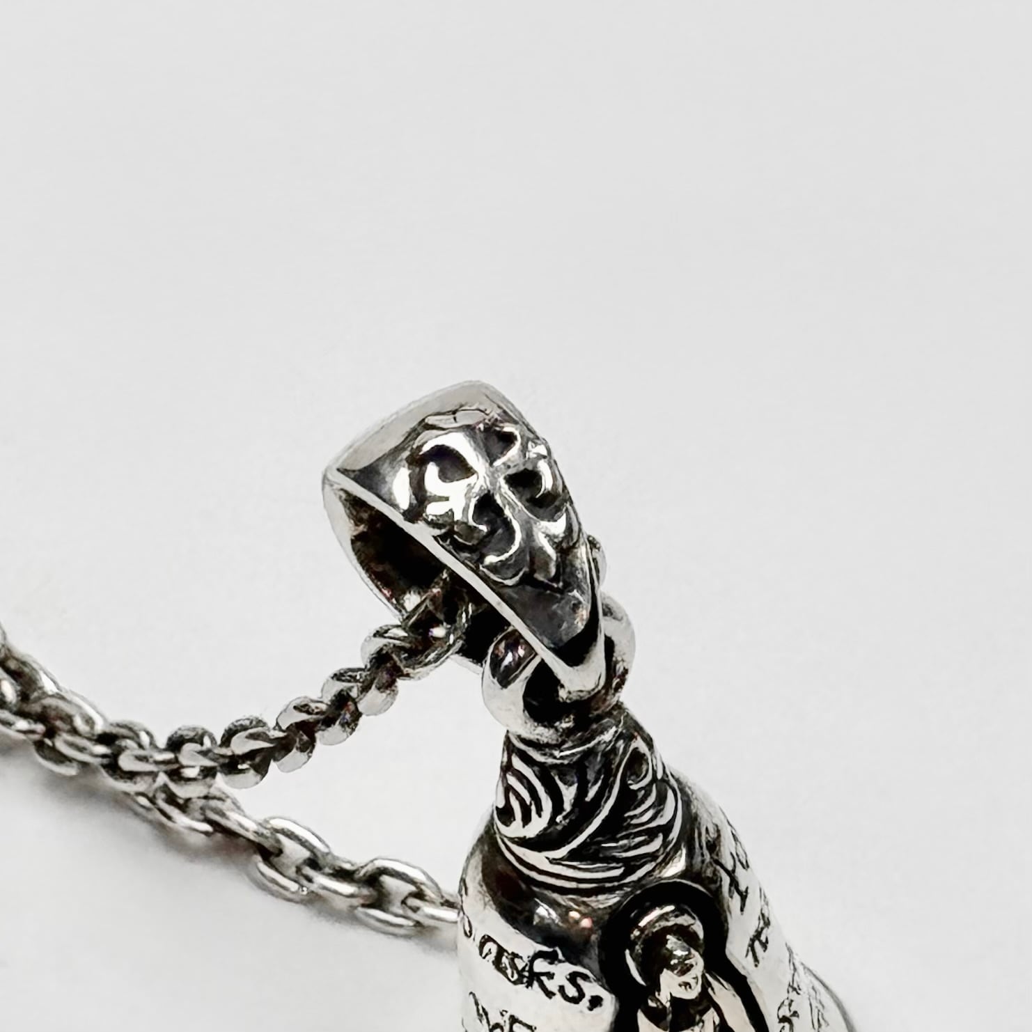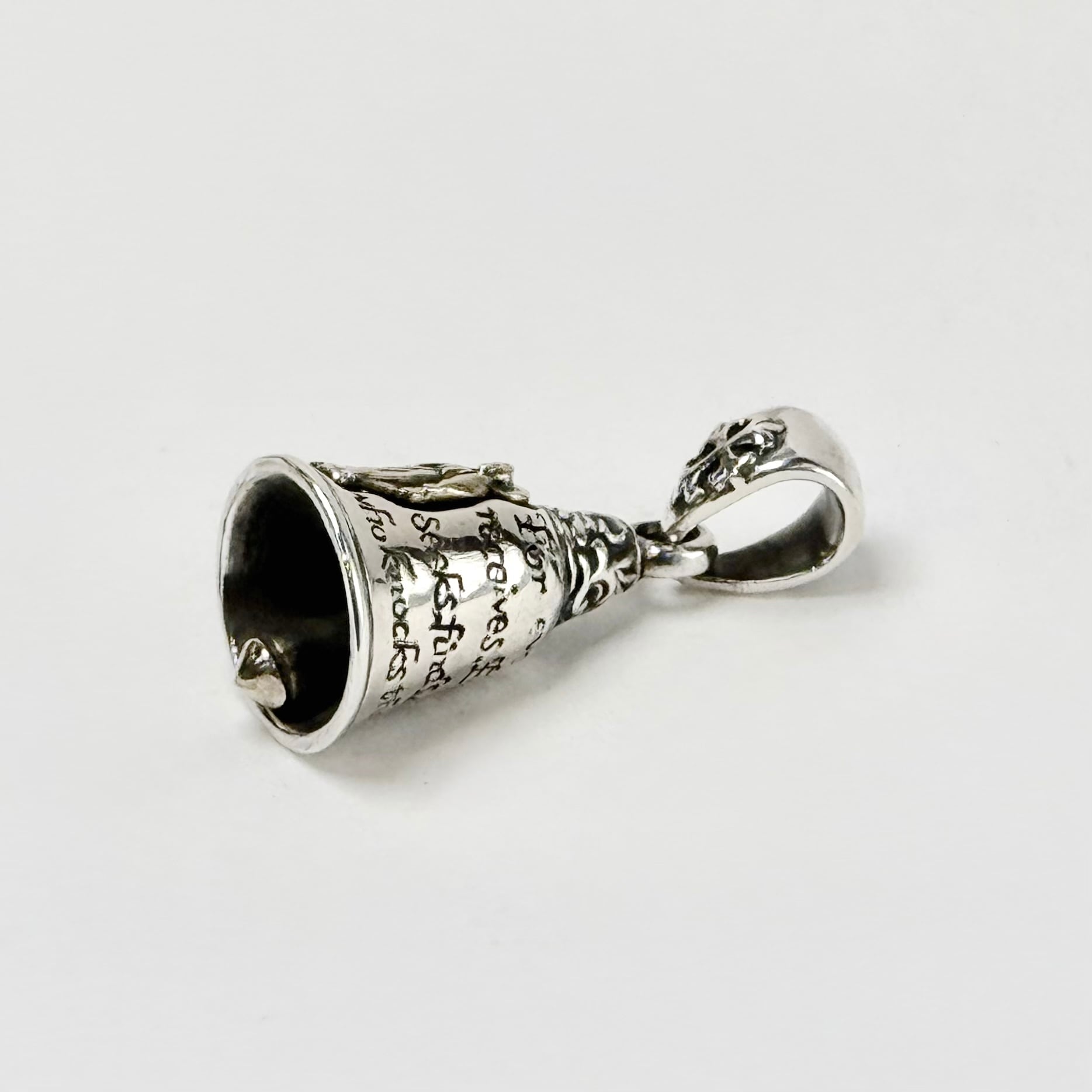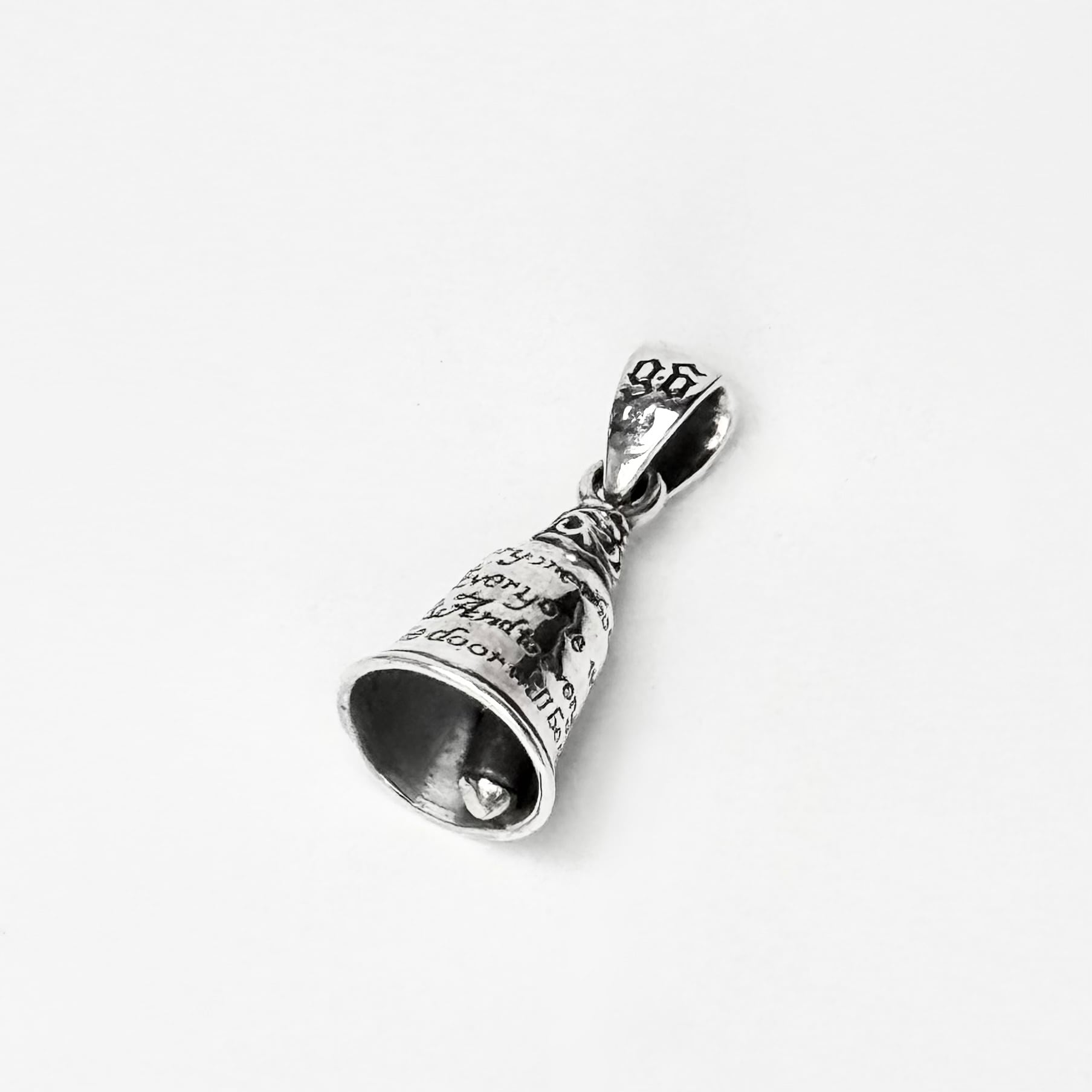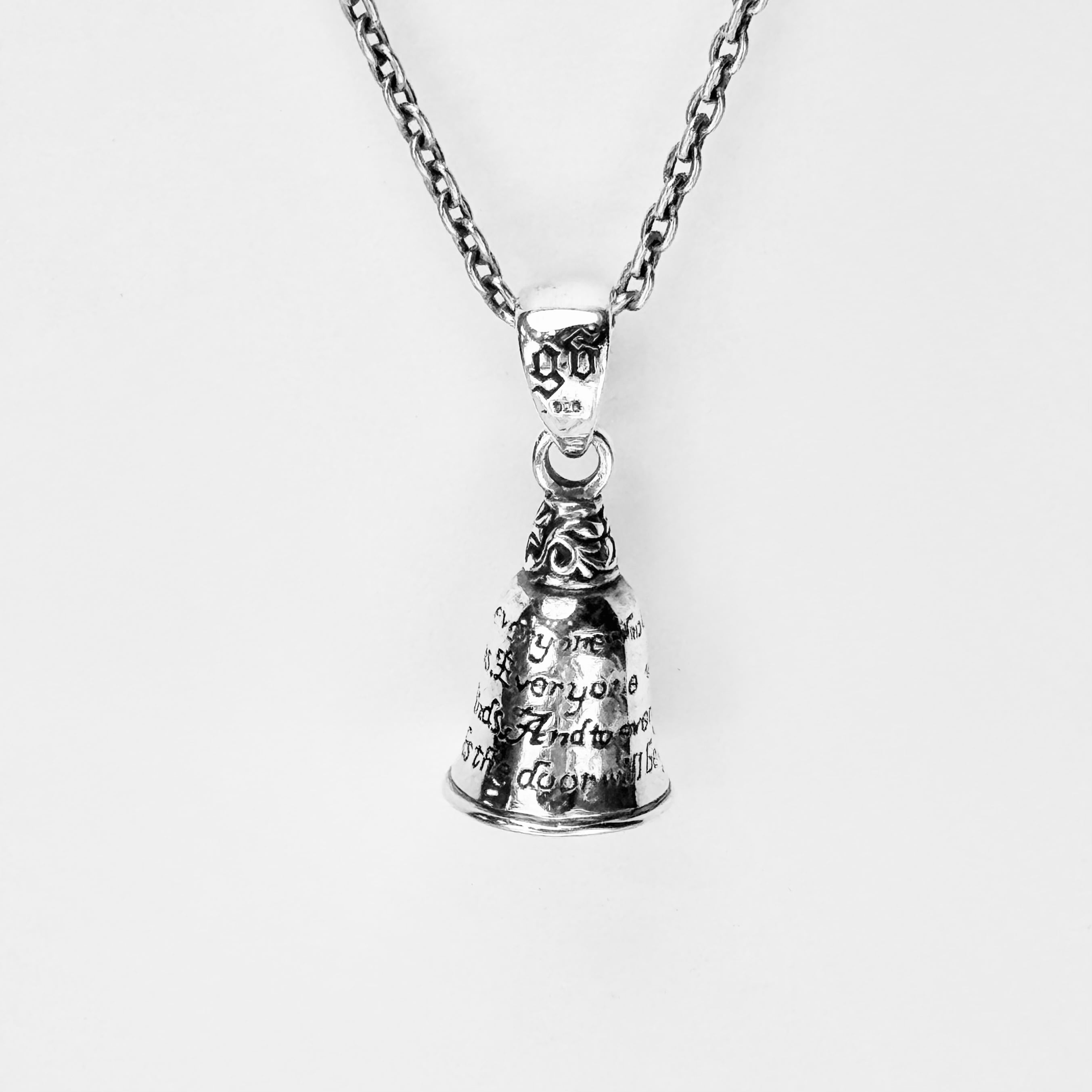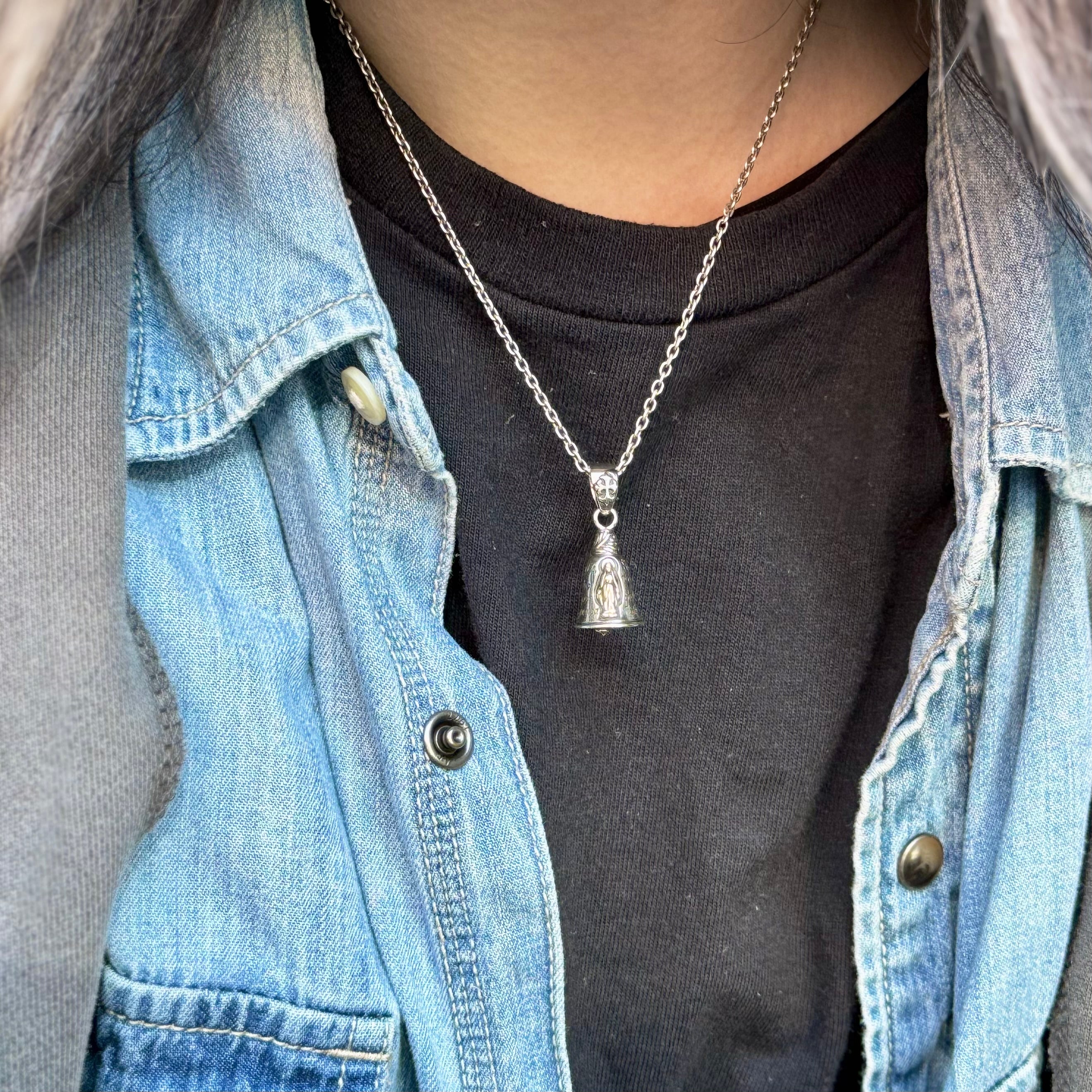 ベルのモチーフにグアダルーペマリアと祈りの言葉がデザインされたペンダント。
