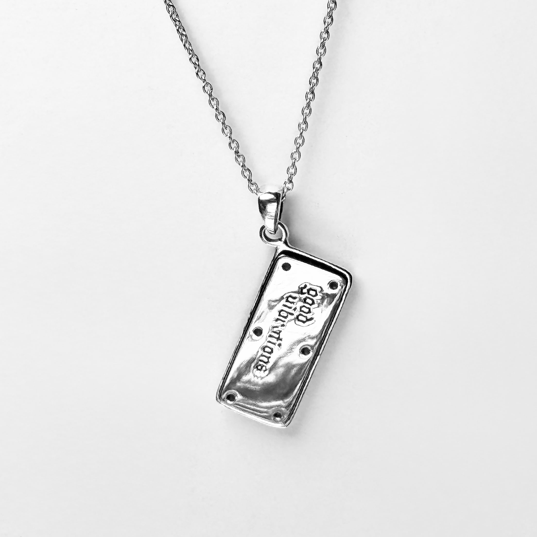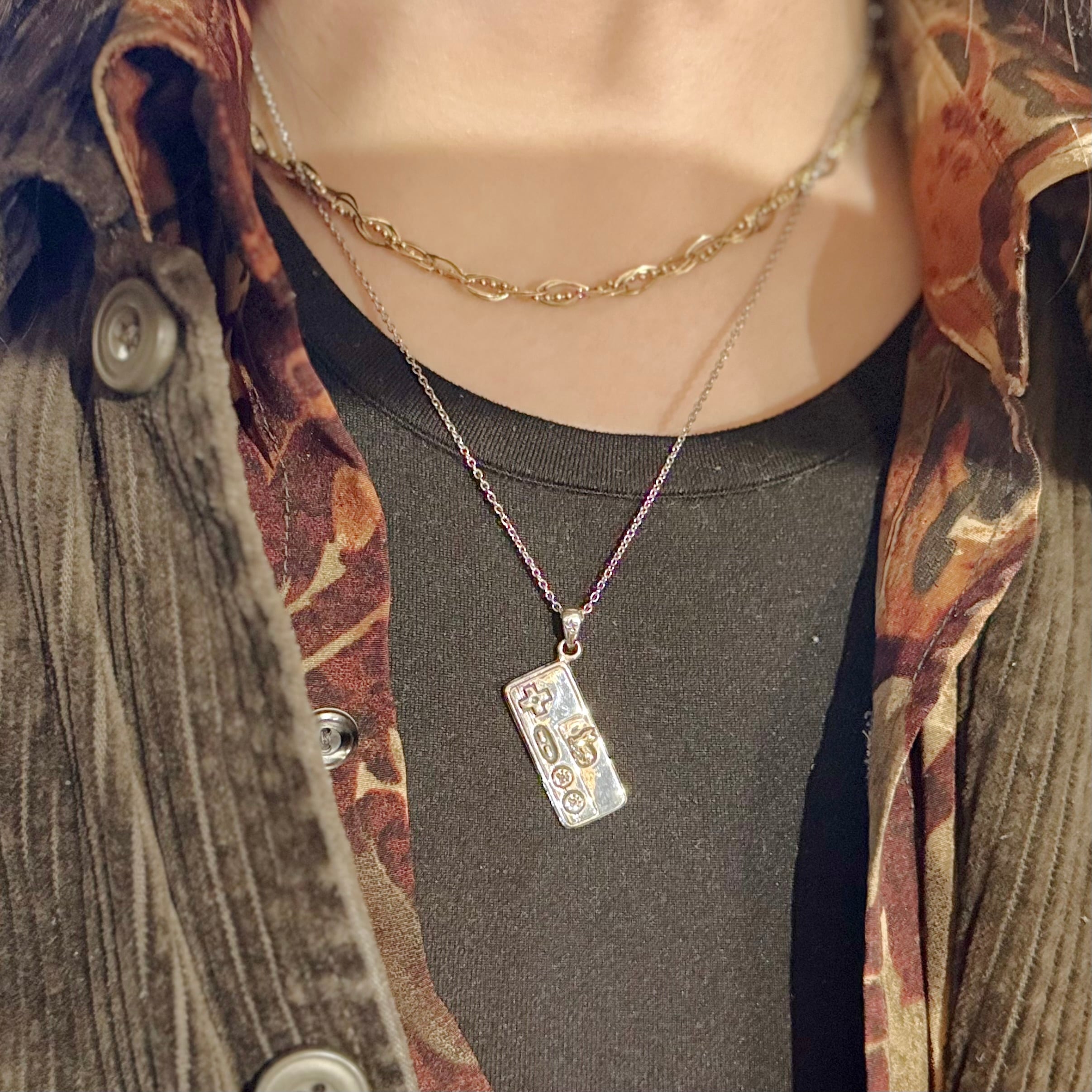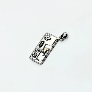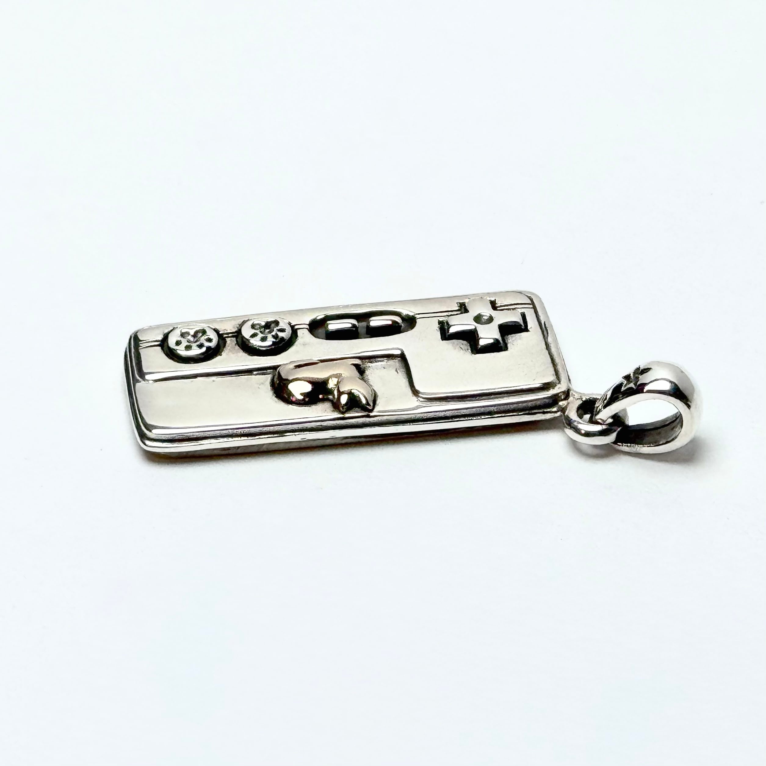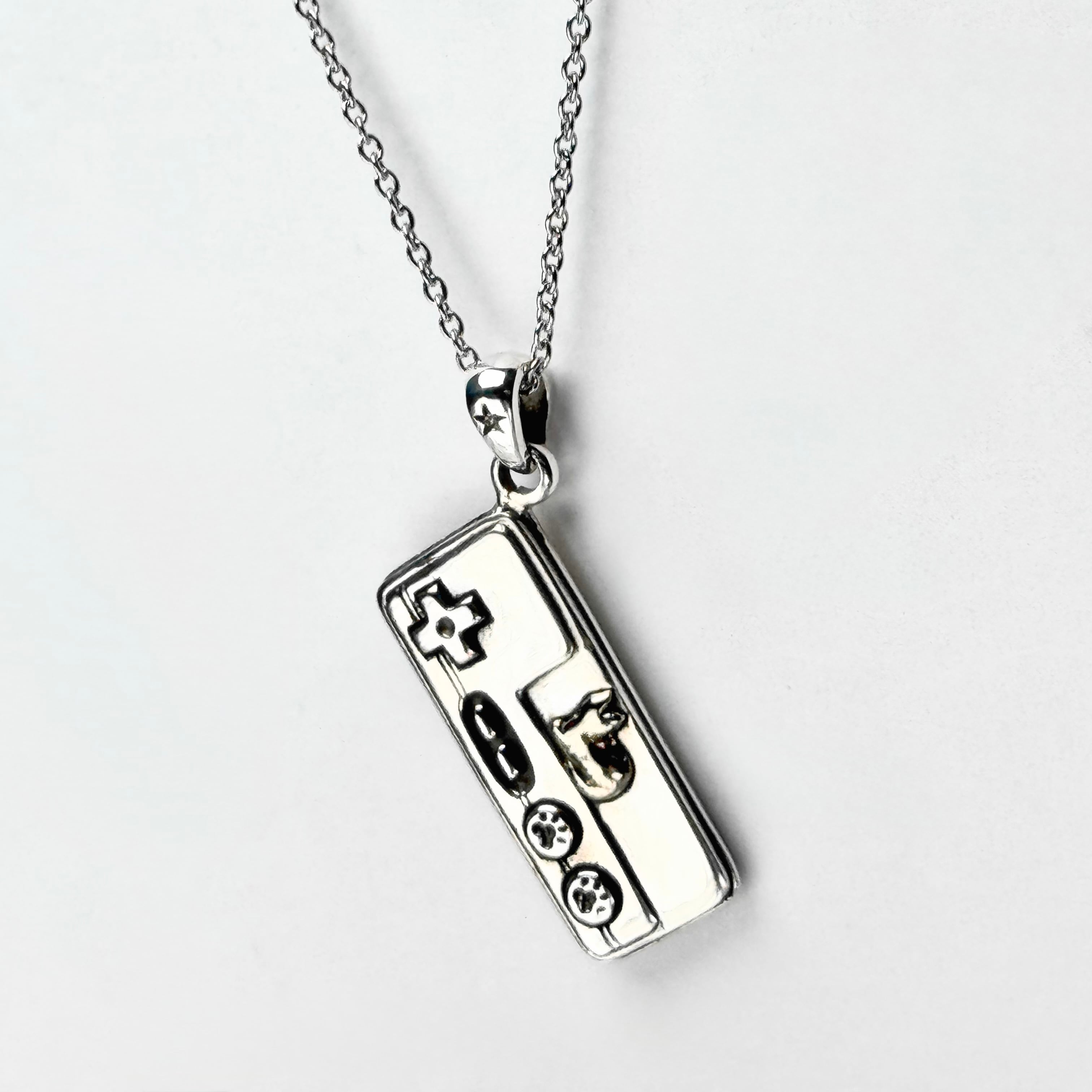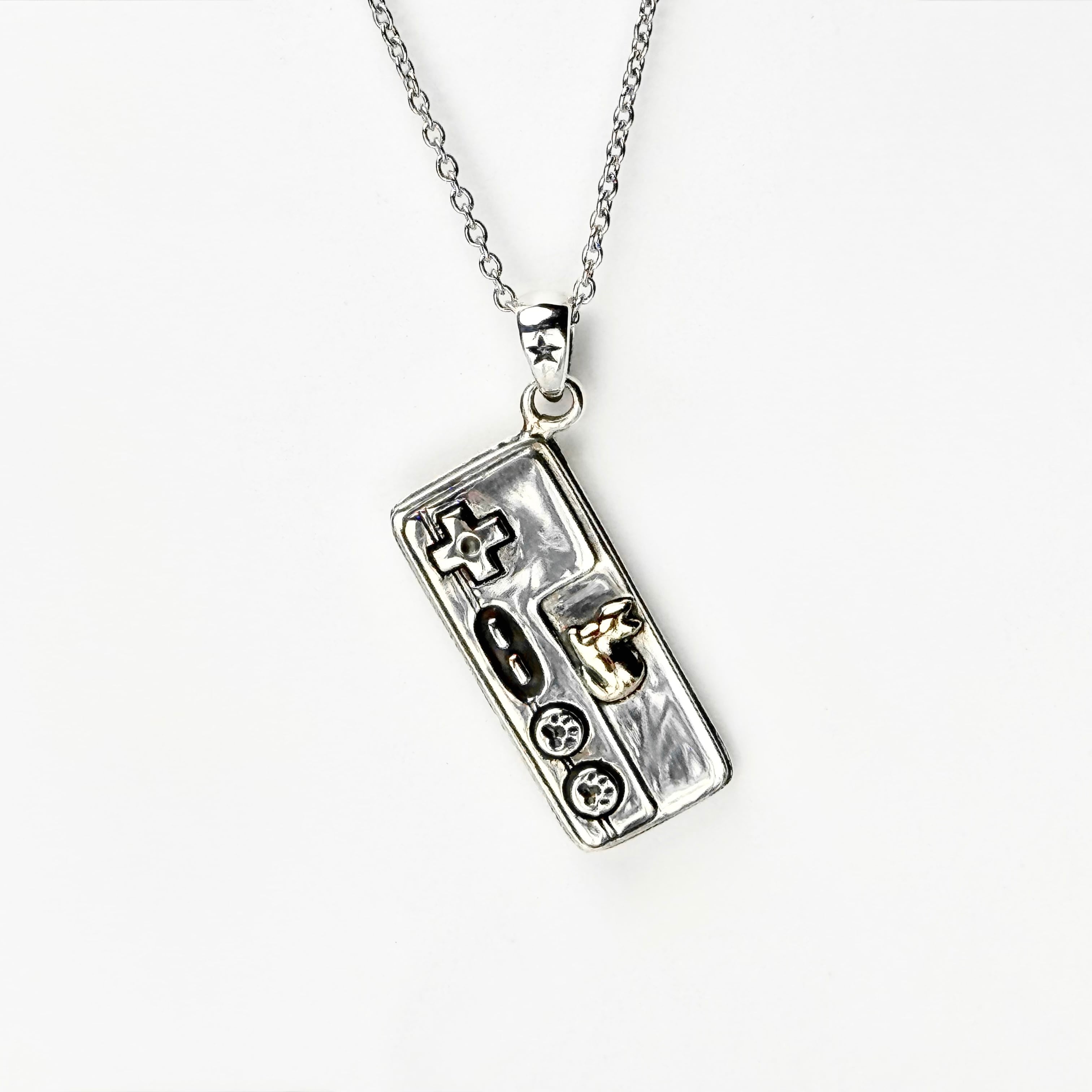レトロなシェイプのゲーミングコントローラーに猫のデザインをあしらったユニークなペンダント。