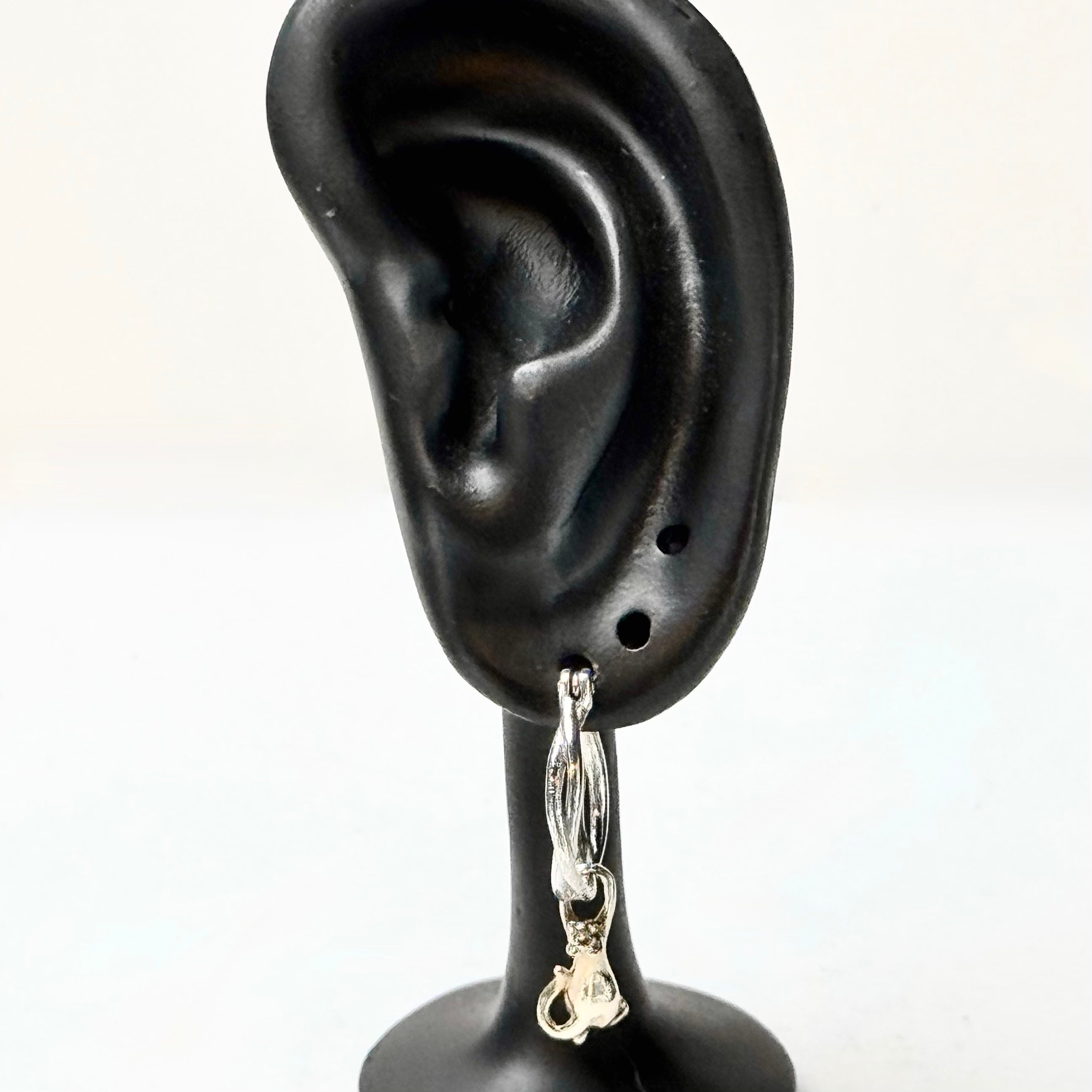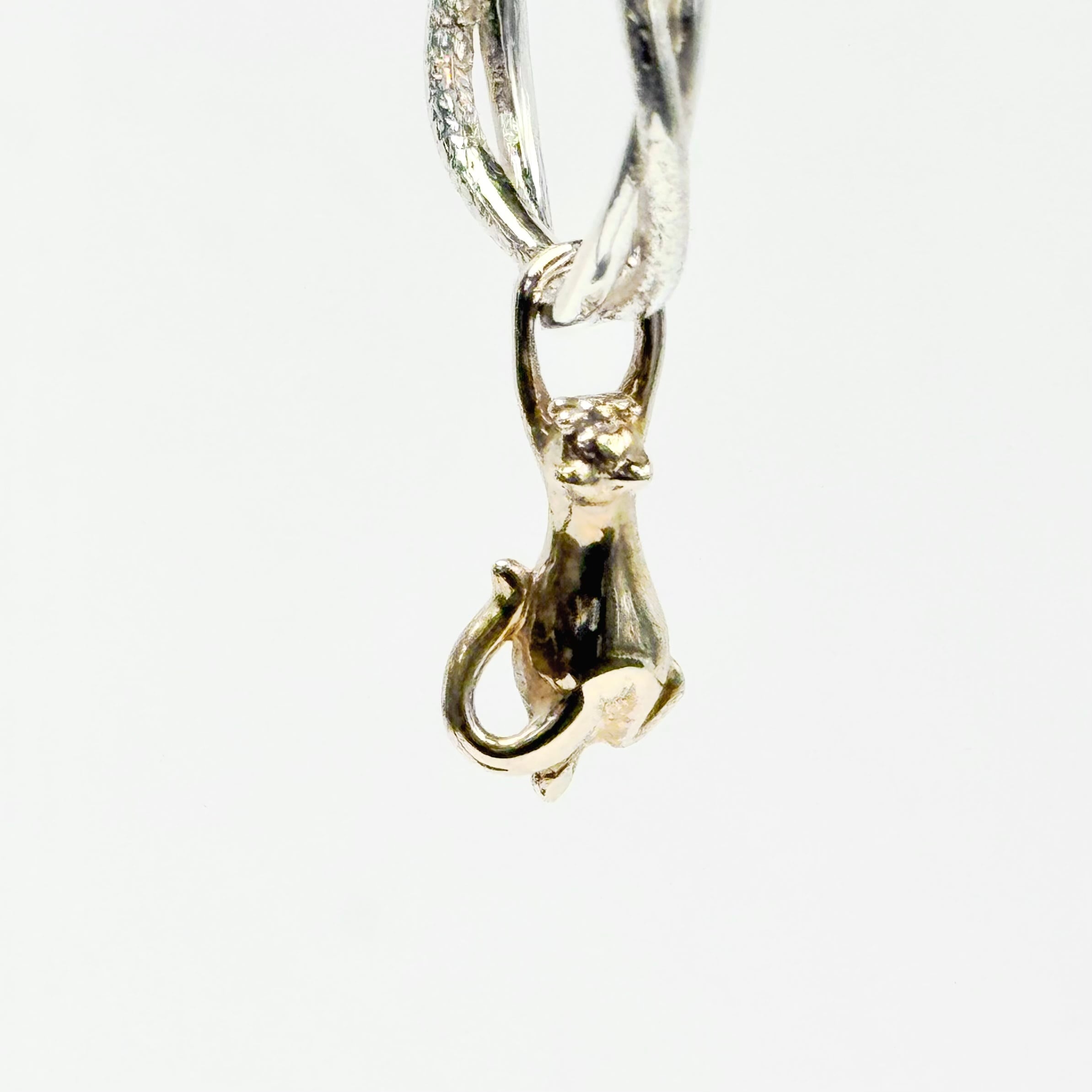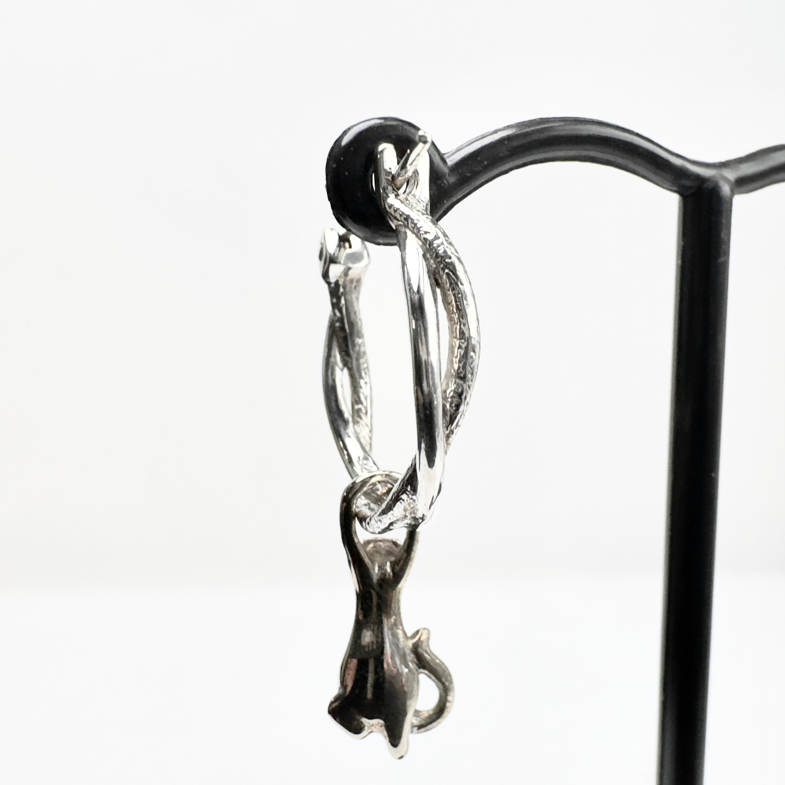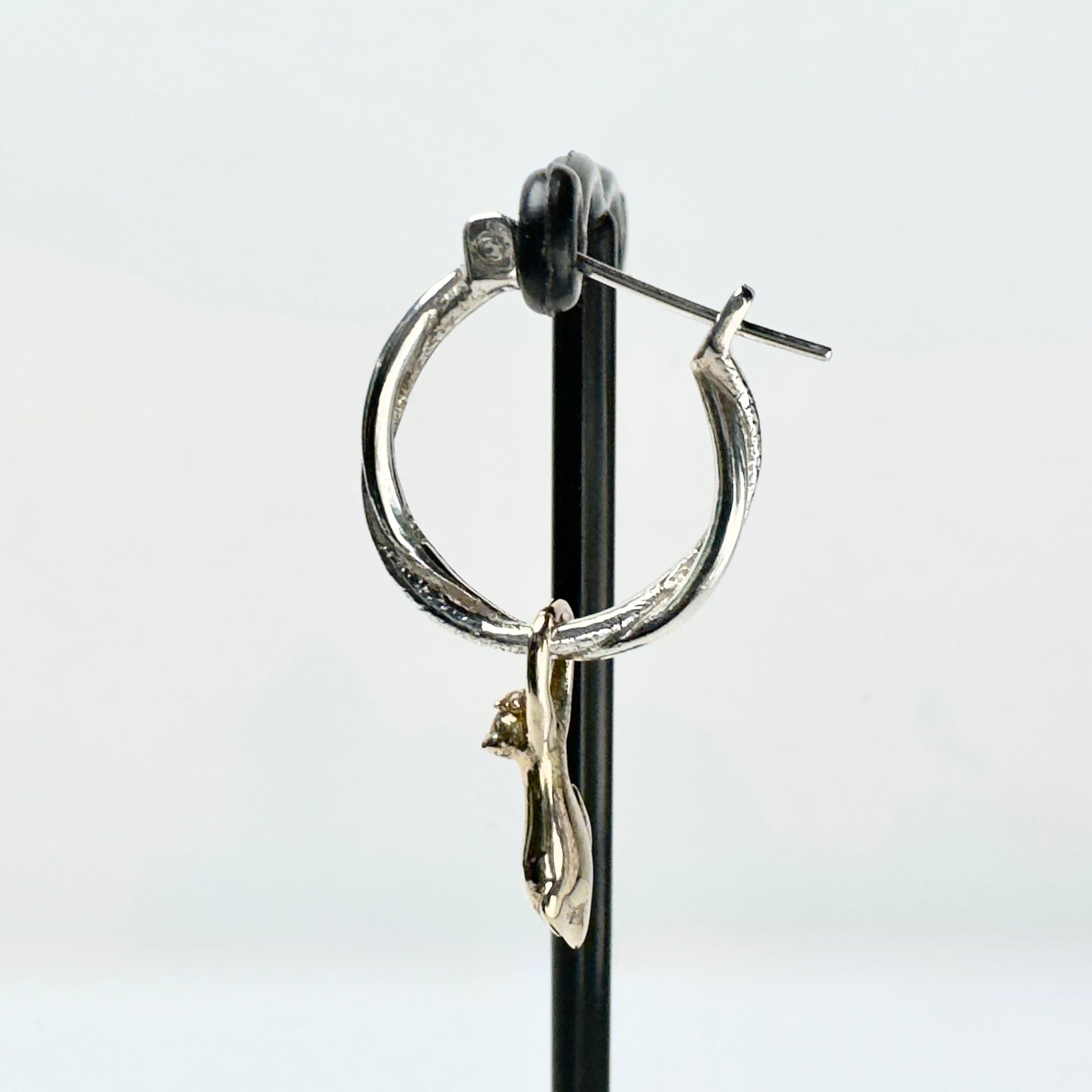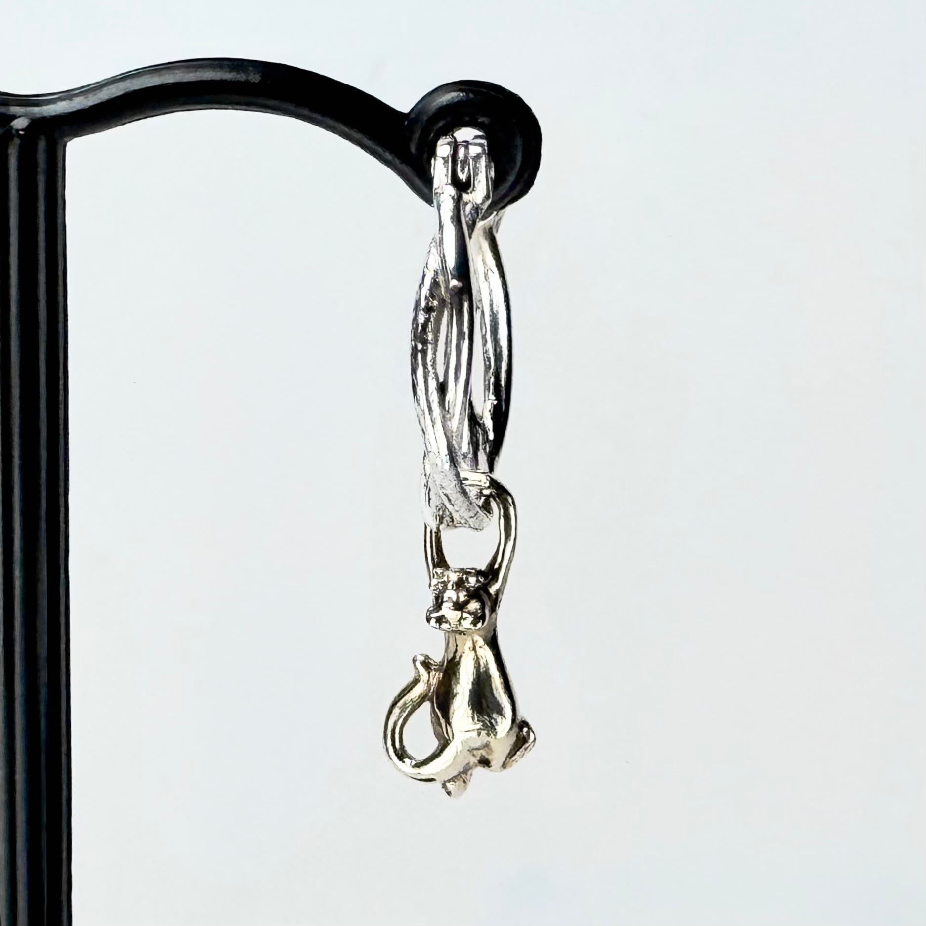ツイスト形状のフープピアスに真鍮製の猫がしがみついているデザインのチャームがセットになった可愛らしいピアス。