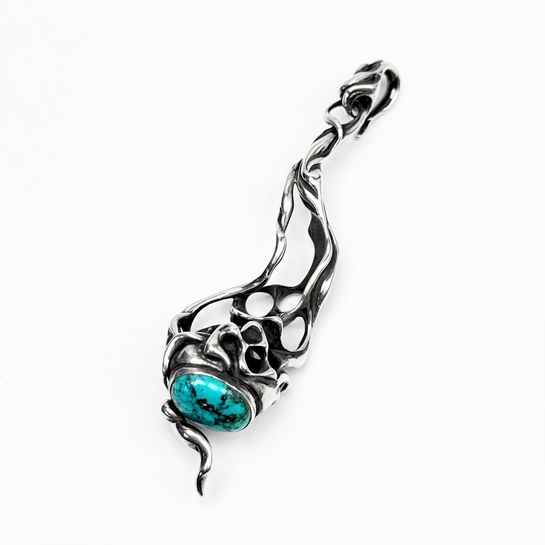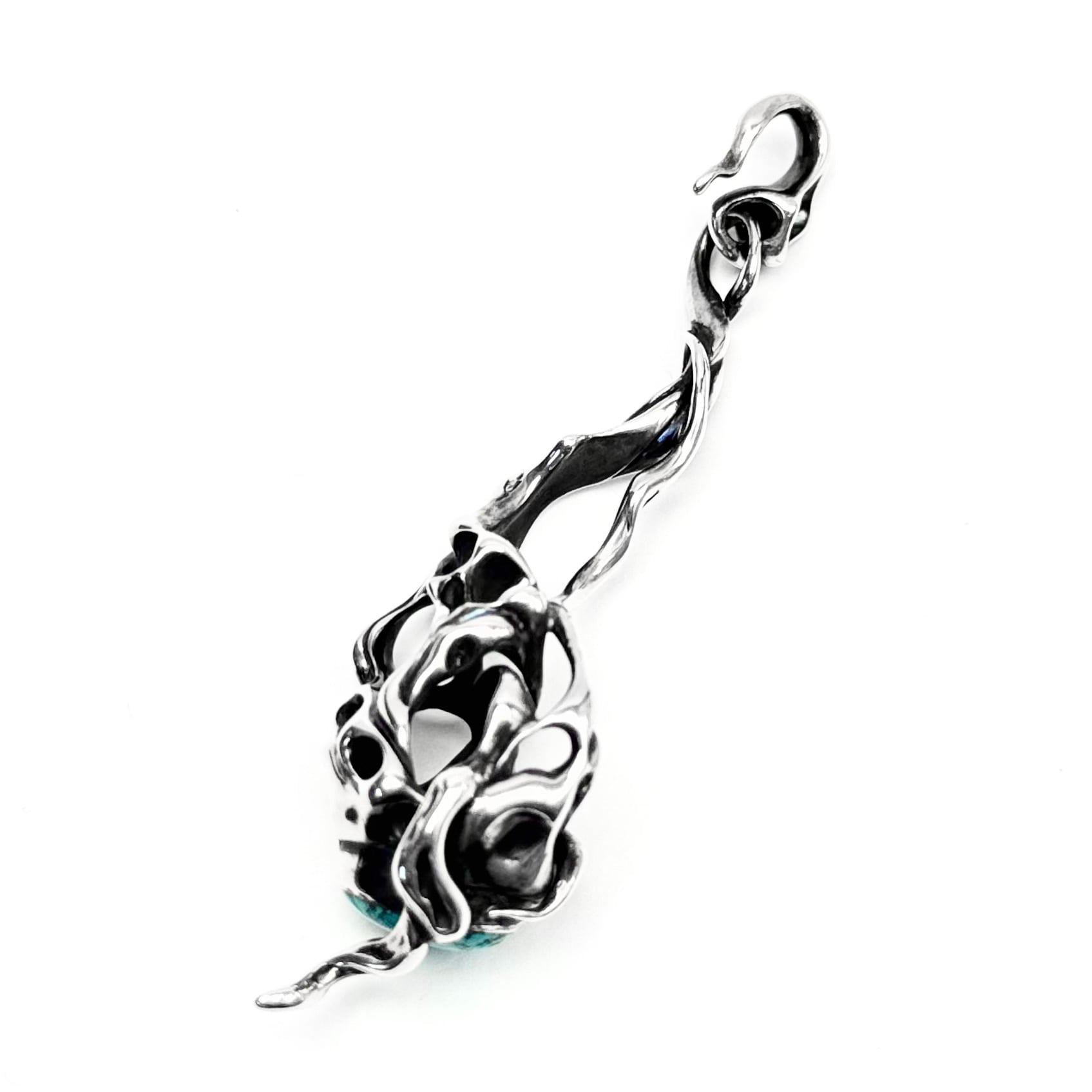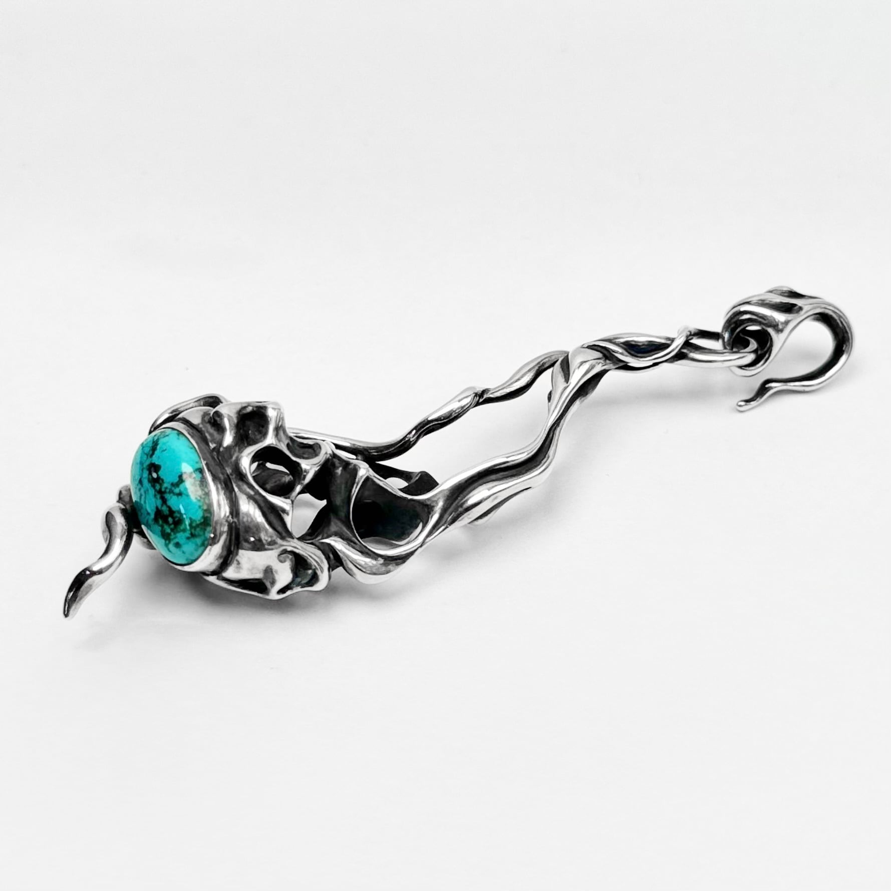 石を使用したものは基本石がメインになるようなデザインが多いTAUJANですが、こちらは下部にターコイズがセットされており、石ではなくシルエット全体がペンダントの主役としてデザインされております。