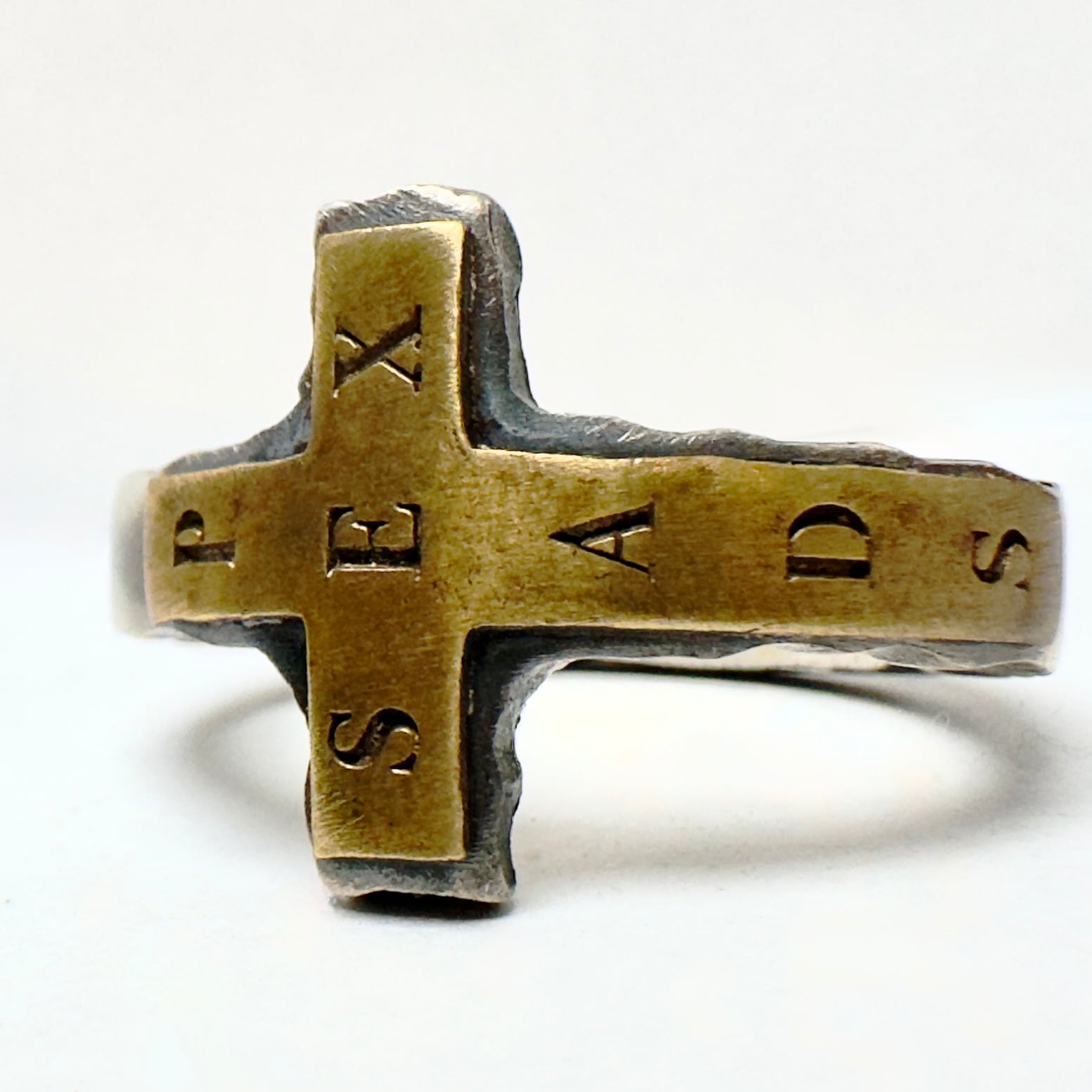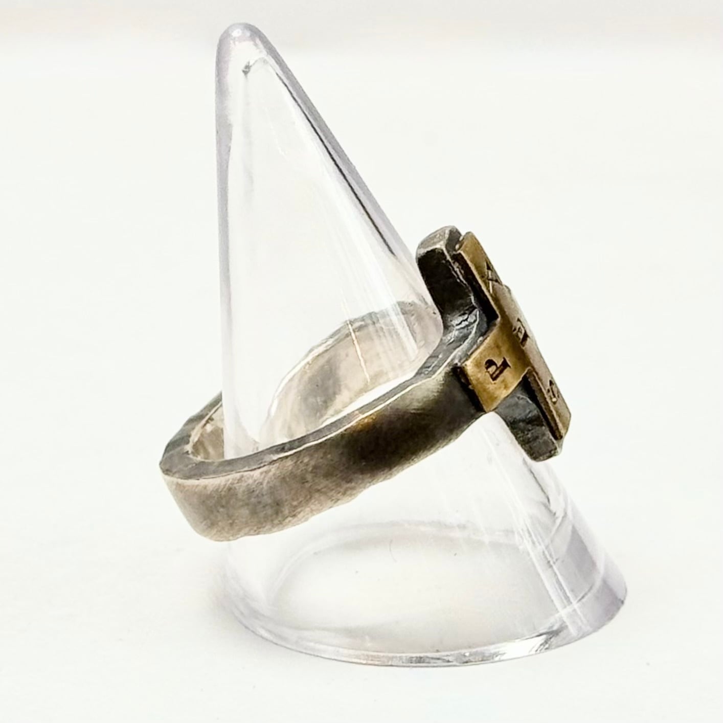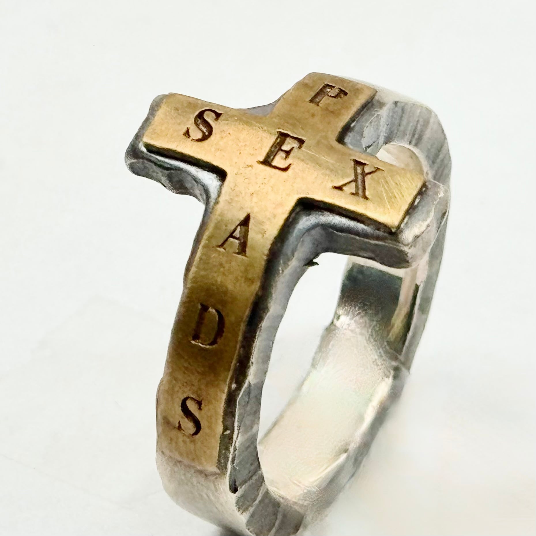 分厚いシルバーのクロスリングの上に真鍮のクロスプレートを溶接しています。