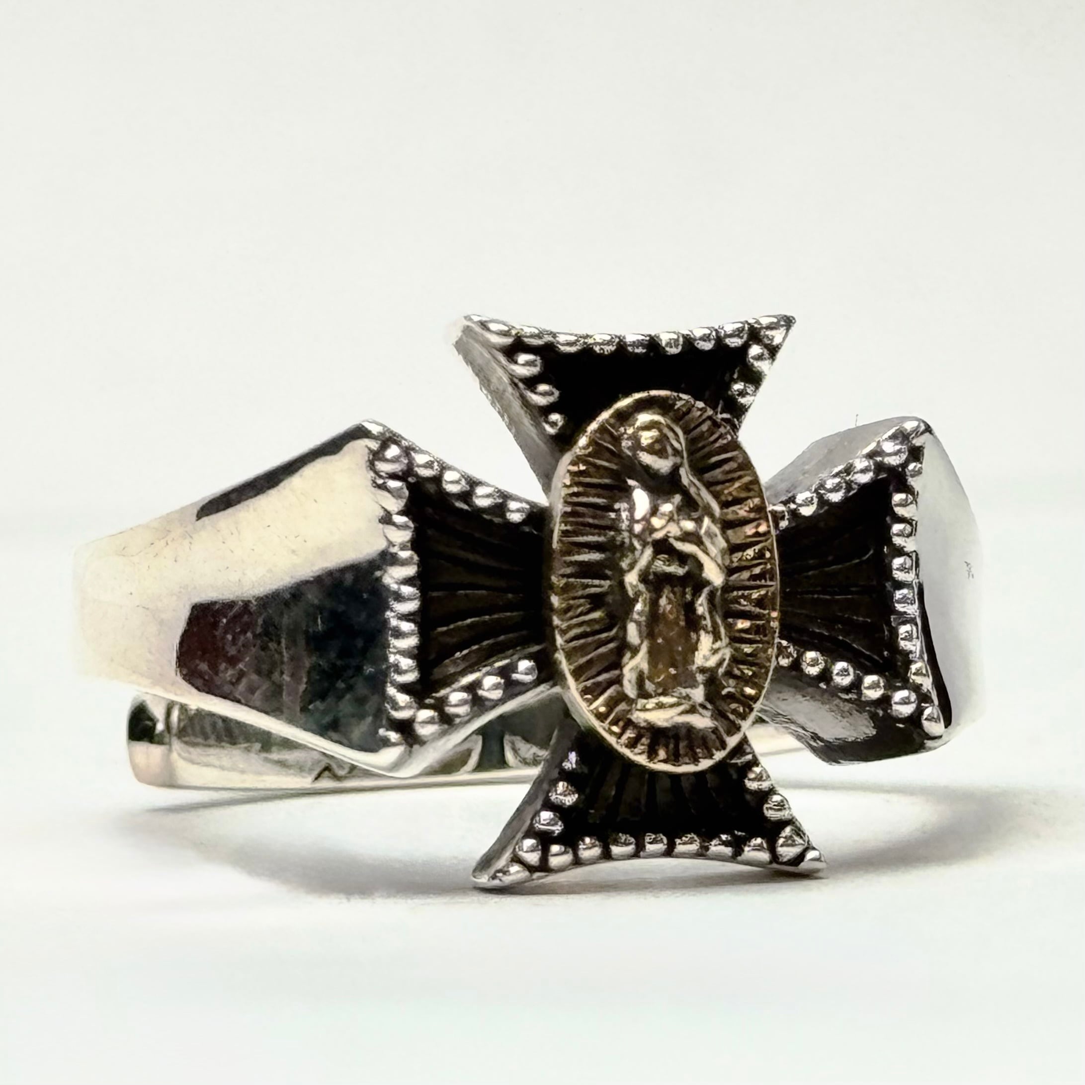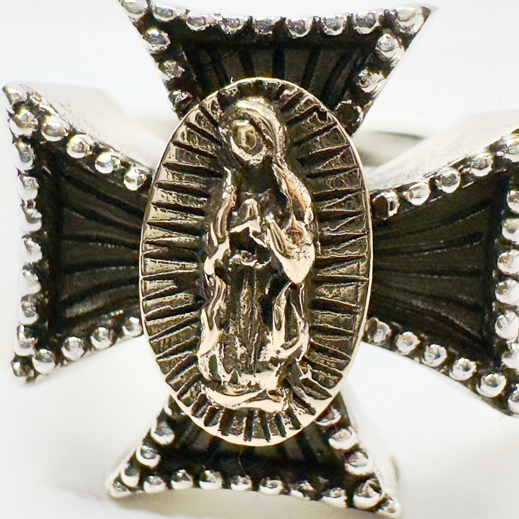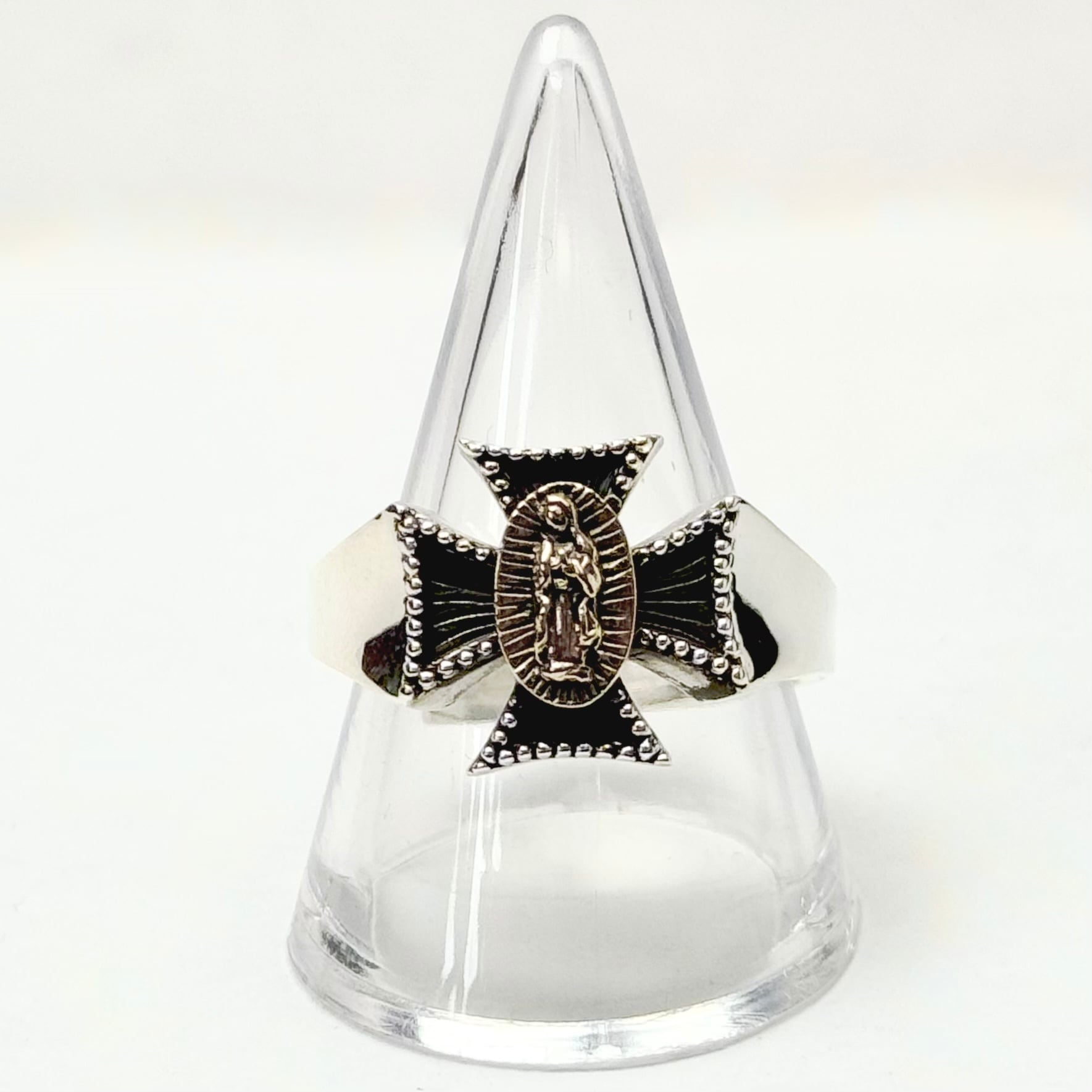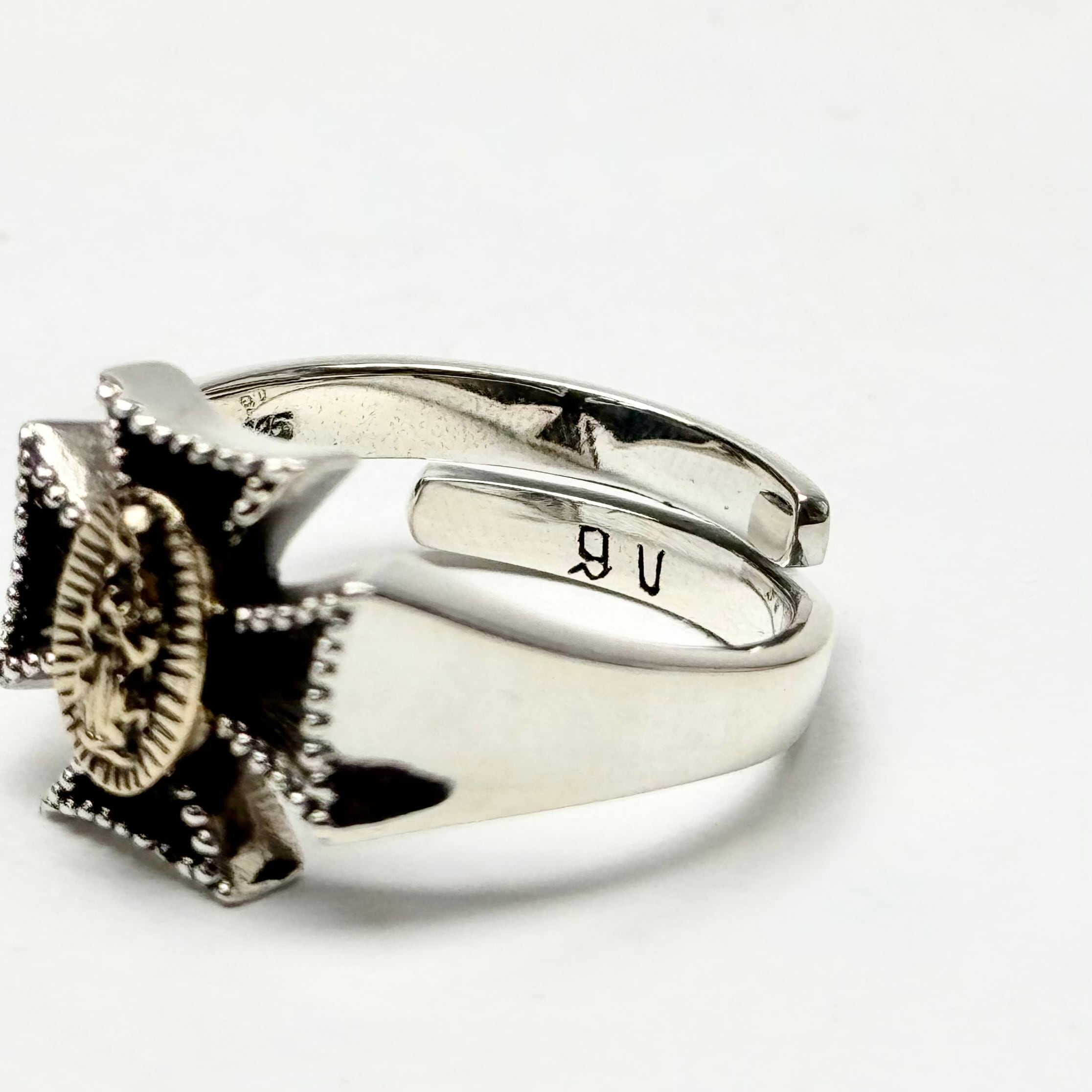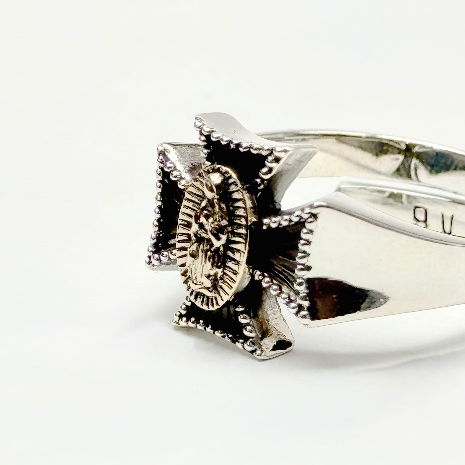 黒をメインとしたアイアンクロスの中央にマリアをあしらったリング。